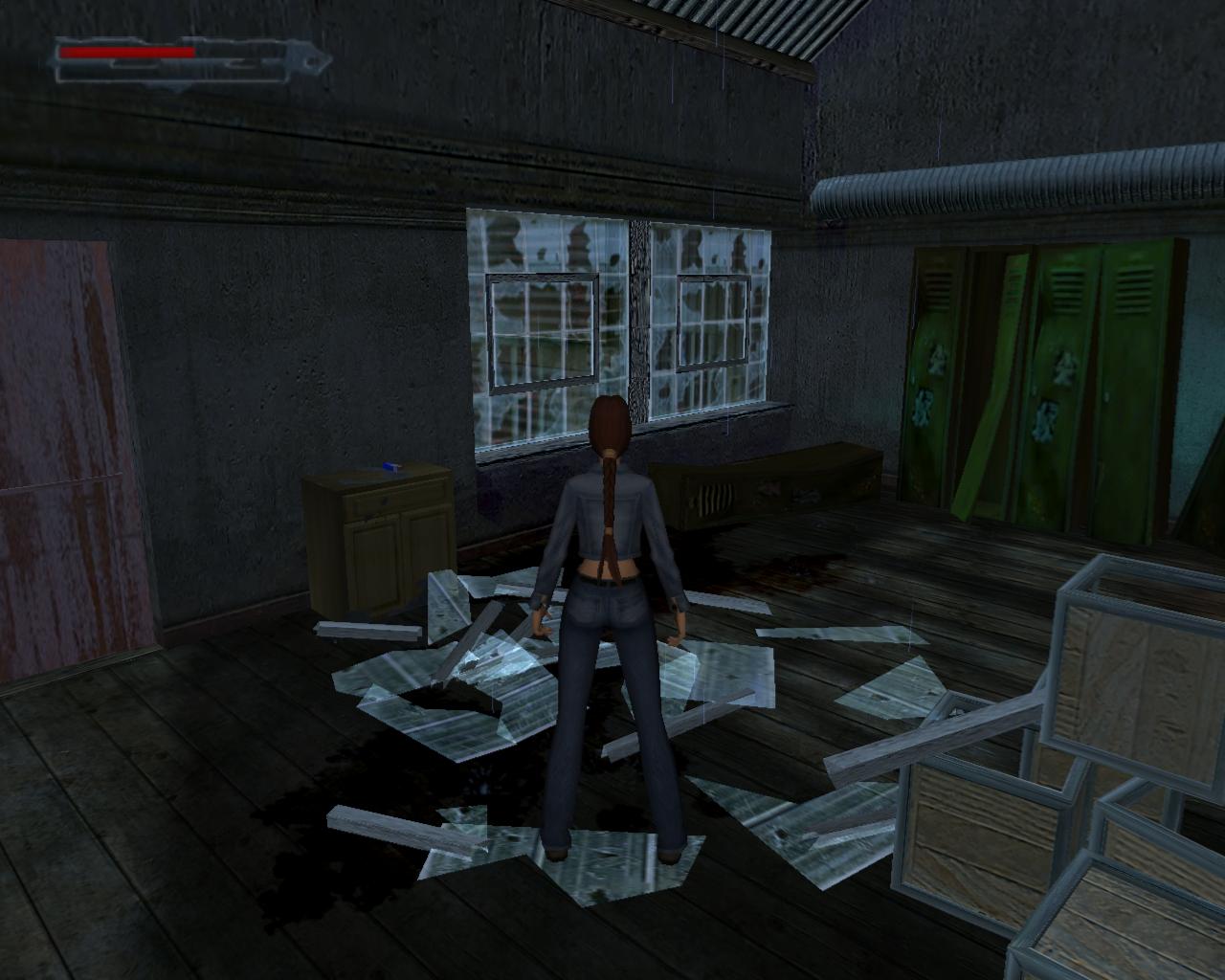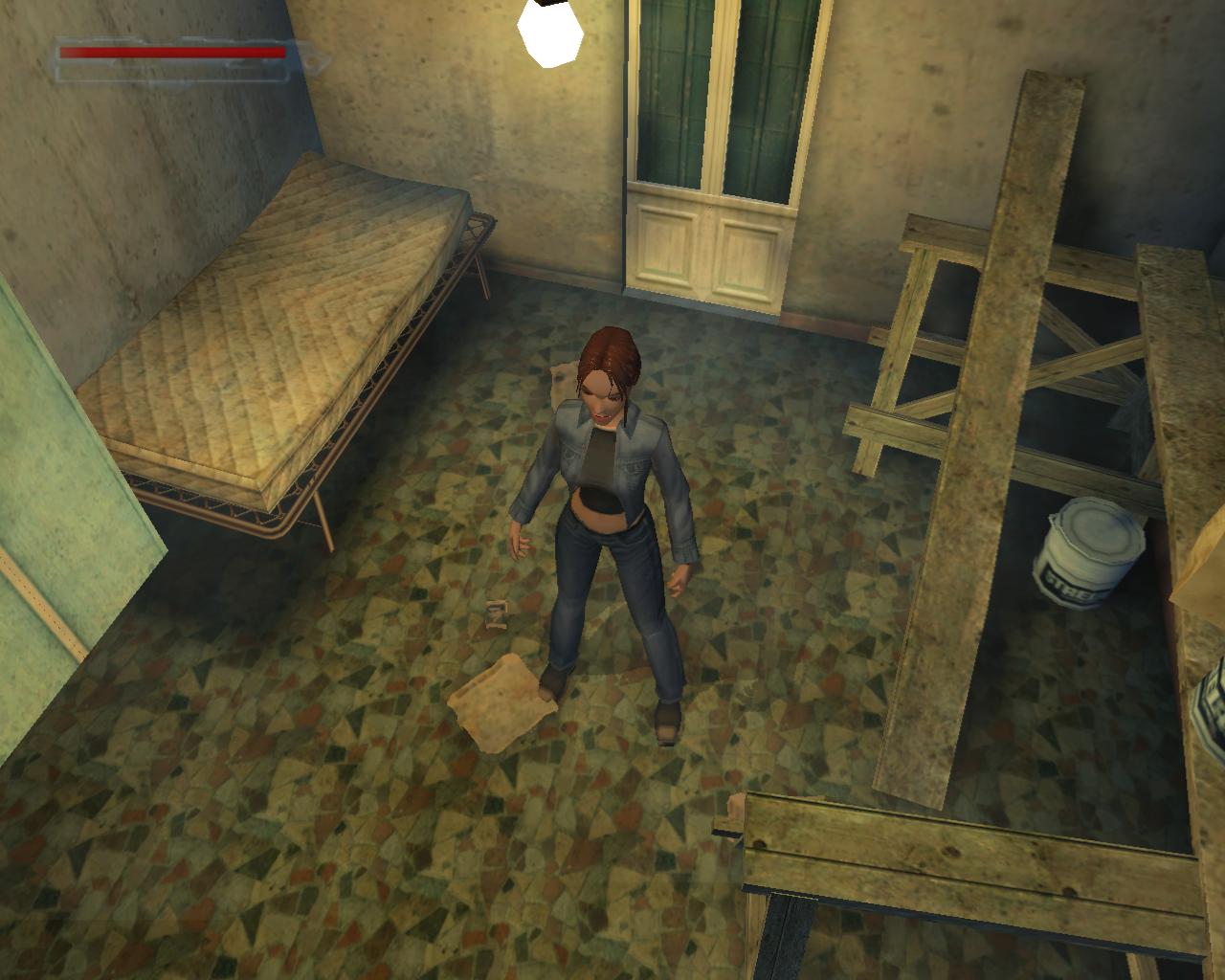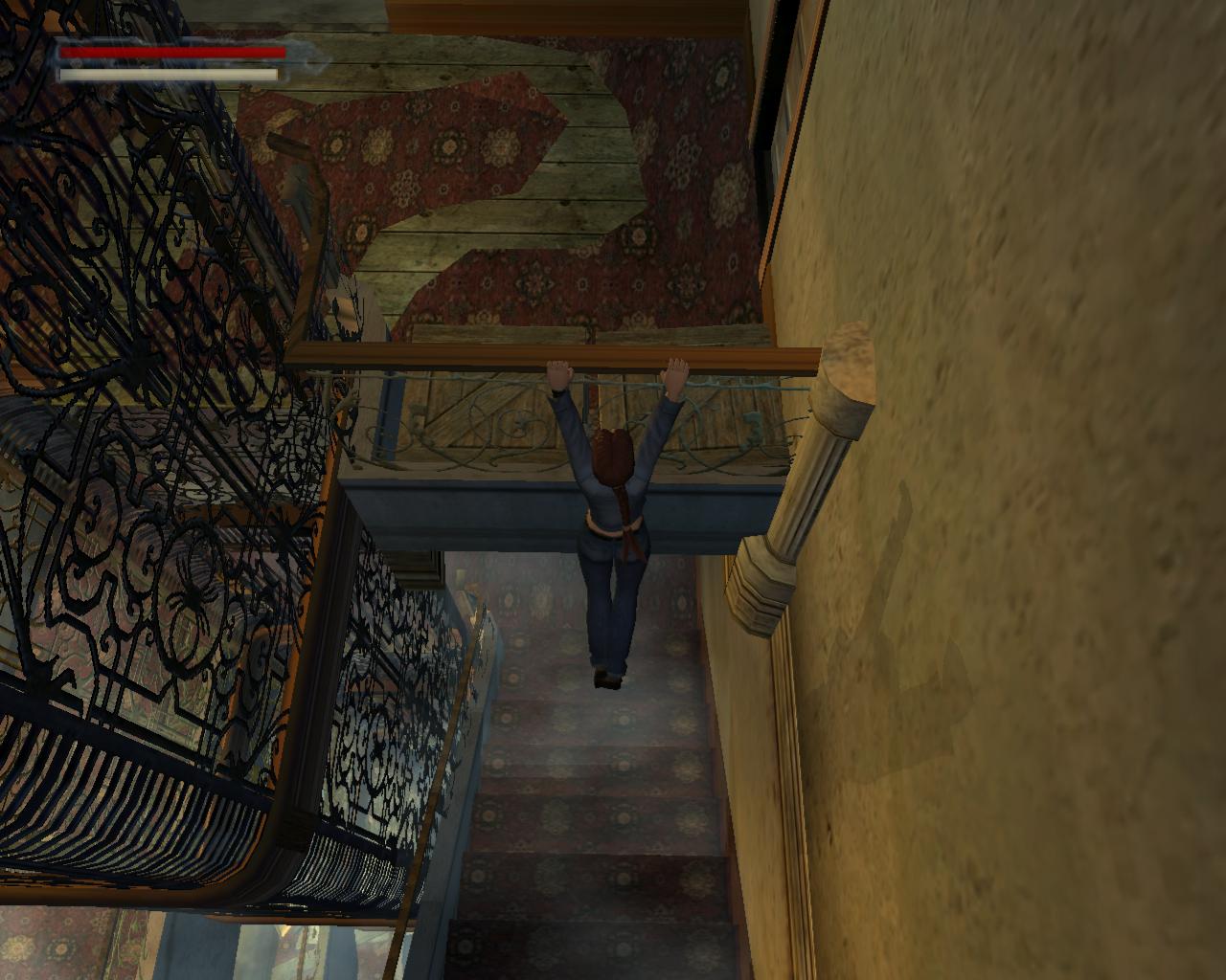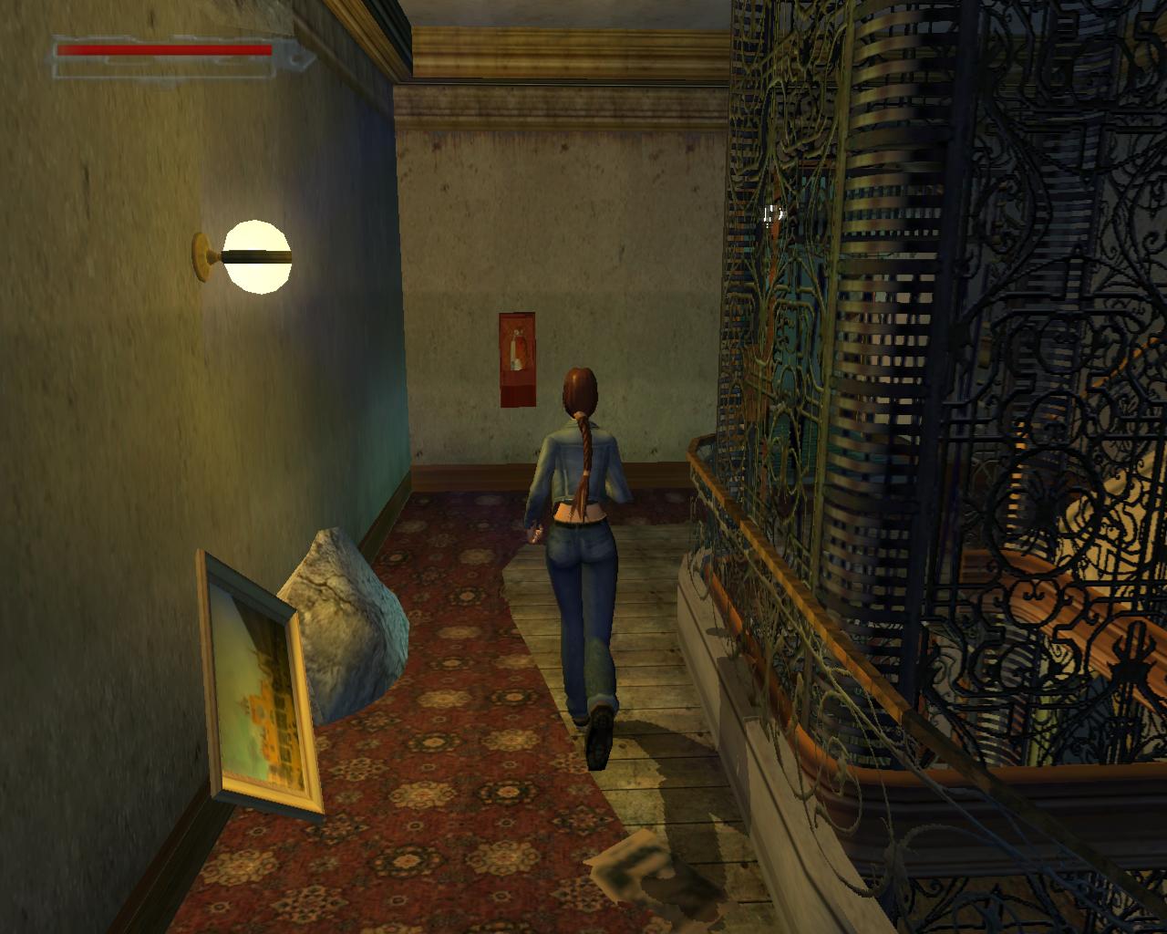 Fordulj meg, és egy nekifutásos-kapaszkodásos ugrással ugord át a szakadékot (ha ügyes vagy, elég a nekifutásos ugrás is). Az újabb kis folyosó elott egy doboz van, rajta könyvek. A folyosón találsz egy doboz gyógyszert, ami szükség esetén 20%-kal növeli az életerodet. Az ajtók zárva vannak. Fordulj meg. Balra elotted a harmadik emeletre vezeto lépcsot egy szekrény zárja el. Állj elé, majd húzd el magad felé, amennyire csak tudod. Kerüld meg és szaladj fel a lépcson. A balra eso folyosón találsz egy kis egészségcsomagot, ami 60%-kal képes növelni az életerodet. A jobboldali ajtó zárva van, de a baloldalit be tudod törni.