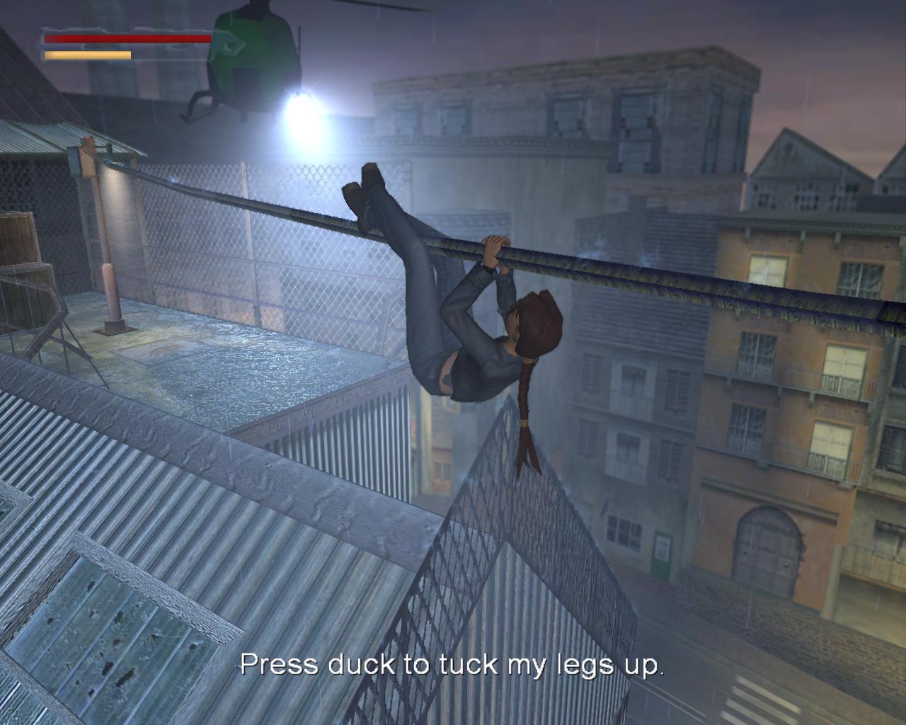 A vezeték alatt állva ugorj fel, és Lara el fogja kapni. Kezdj el függeszkedni rajta az átellenben lévo teto irányába. Félúton egy helikopter tunik fel a teto mögül, amirol csendorök lonek rád. Egy rács akadályoz a továbbjutásban.
