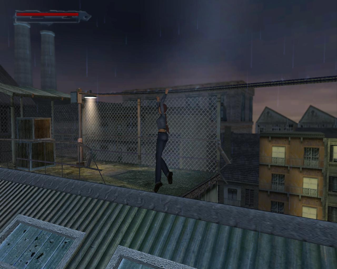 Mihelyst elérted a tetot engedd el a vezetéket, és keress menedéket a dobozok mögött. Guggolj le és várd meg, amíg a helikopter kissé odébbáll. A doboz mellett kötszerek vannak. Kússz oda és vedd fel oket. A teto egy lapos részén vagy. A dobozok mögött egy létra vezet lefelé a teto oldalán. Szaladj le rajt. A peremet elérve ne ess le, hanem ugorj át a szemközti tetore és kapaszkodj meg. Húzd fel magad. Az alsó dobozban van némi kötszer. Vedd fel. (Ha akarsz, a doboz mellett le tudsz csúszni a teton. Az ablakhoz érve az beszakad alattad, s egy kis szobában fogsz landolni. Ez egy kis sérüléssel jár). Fordulj meg, menj a peremhez és függeszkedj le rajt. Engedd el, és kapaszkodj meg a következoben. Alattad látni fogsz egy kis hidat, ami a két épületet köti össze. Ess le rá. Egy ajtó van veled szemben. Törd be és lépj be a folyosóra. Itt arany pénzérméket találsz. A sarkon fordulj be balra. A folyosó végén jobbra van még egy ajtó. Lépj be rajt. Egy kis szobában vagy. (Ha lecsúsztál a tetorol, akkor az ablakon át ide fogsz megérkezni). Szemben van egy ajtó, tole jobbra egy kis szekrényen csokoládé. A szoba jobb oldalán is szekrények vannak, a jobb szélso elott loszert találsz. Menj ki az ajtón. Egy újabb hídhoz jutottál egy újabb ajtóval, aminek a bal oldalán létra fut fel és le. Nyisd ki az ajtót. Egy raktárhelyiség tetején vagy. Fordulj balra és menj le a lépcson. Fordulj jobbra, függeszkedj le a peremen, majd ess le. Menj körbe balra. A platform végérol egy kis peremet vehetsz észre a raktár másik oldalán.