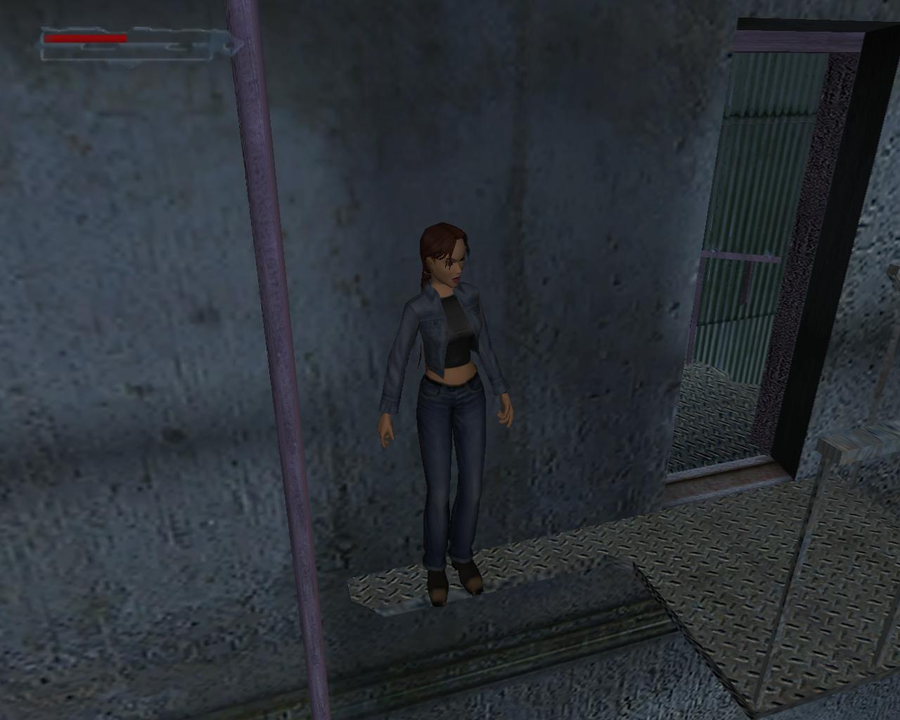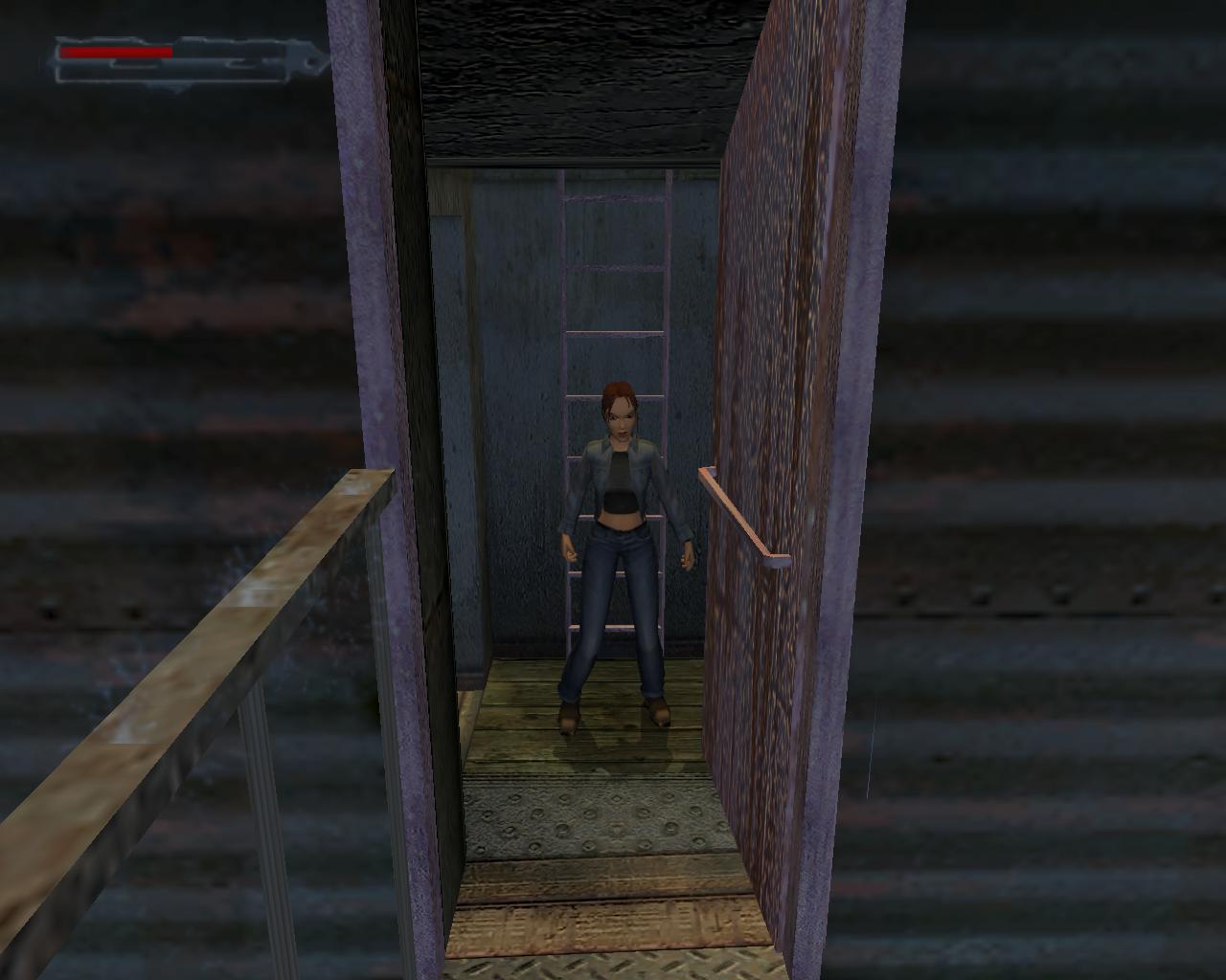 Függeszkedj le a peremen és ess le a raktár padlójára. Balra a sarokban egy nagy egészségcsomag van. Vedd fel. Mellette találsz egy függoleges csövet, amin szükség esetén vissza tudsz térni a felso platformra. Kússz át a raktár ajtaja alatt. Fordulj balra. Látsz itt egy kerítést. Ha mellé állsz, megnyomod az Ugrás-gombot, akkor Lara fel fog kapaszkodni rá, és át tudsz mászni rajt. Itt azonban csak egy kutya részesít nem túl meleg fogadtatásban, egyebet nem találsz. Mássz vissza. A sarkon, a raktár ajtaja után loszer hever a földön. Vedd fel. Fordulj be jobbra. Az égo hordó után jobbra egy létrát találsz a falhoz rögzítve, ez azonban túl magasan van ahhoz, hogy elérd. Balra tole van egy mozgatható rekesz. Ezt a létra alá tudod húzni.