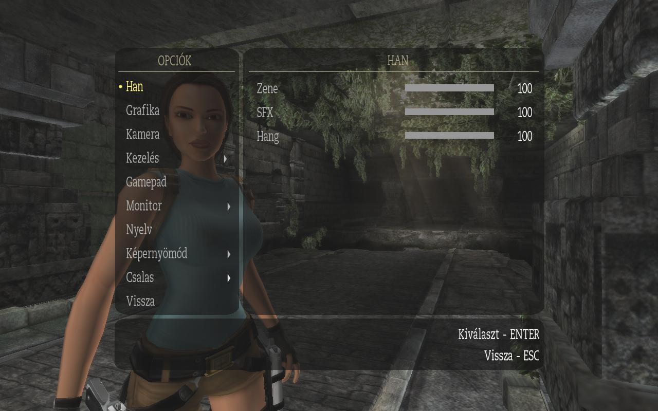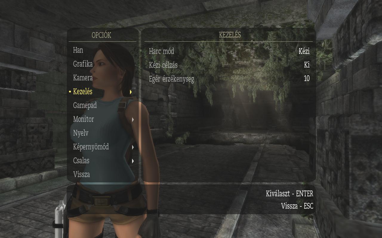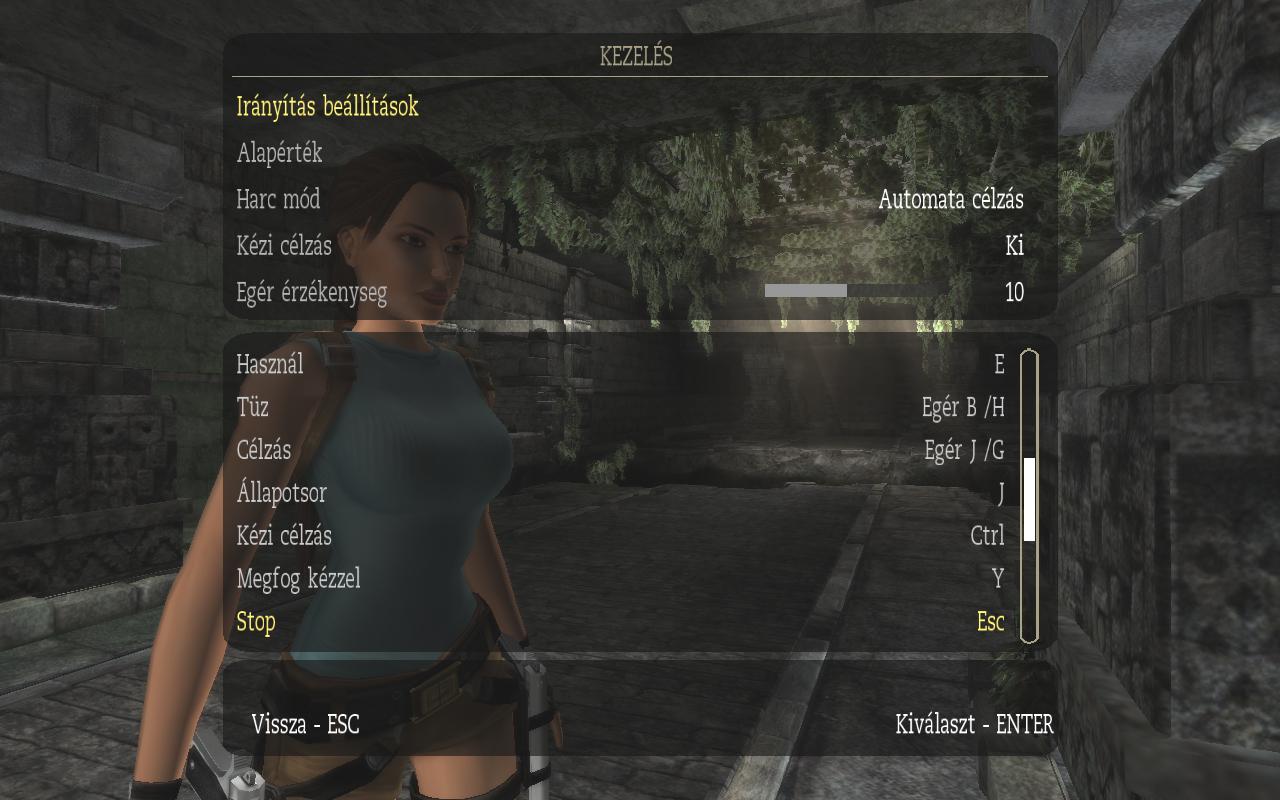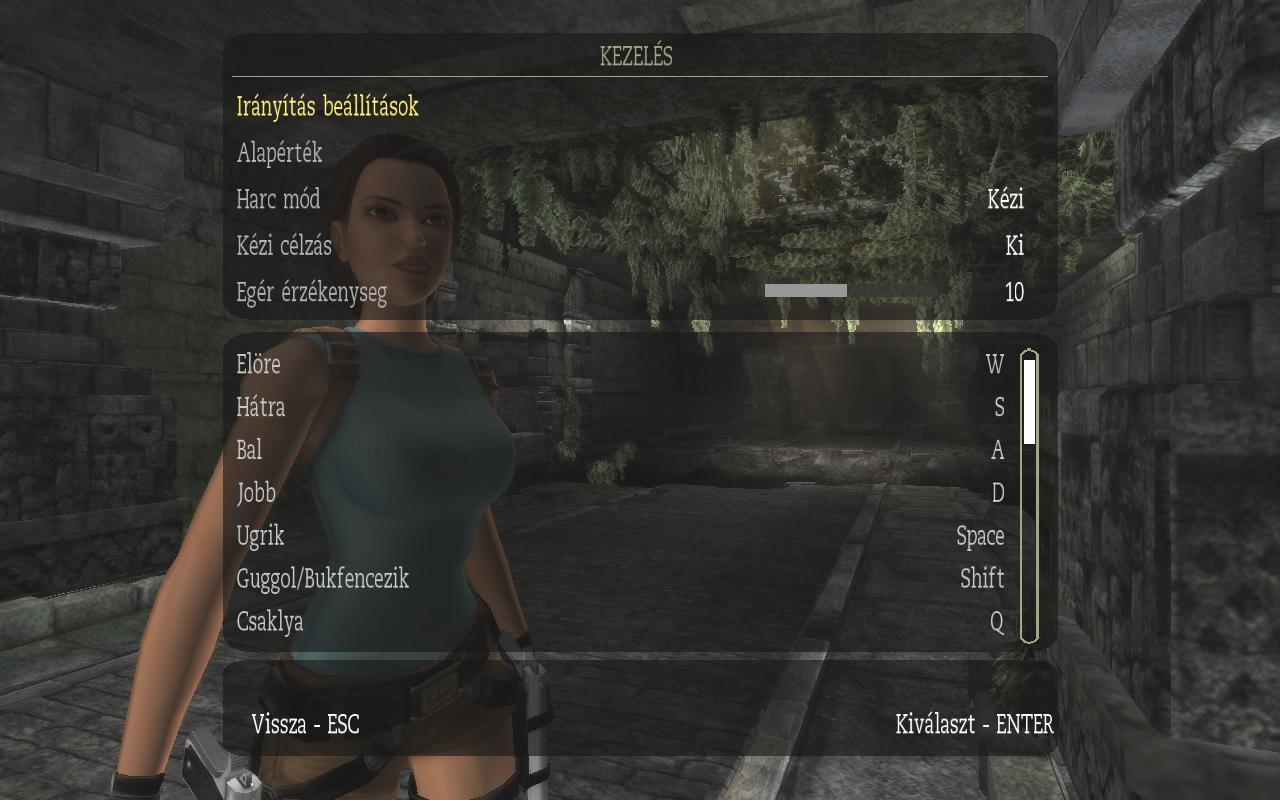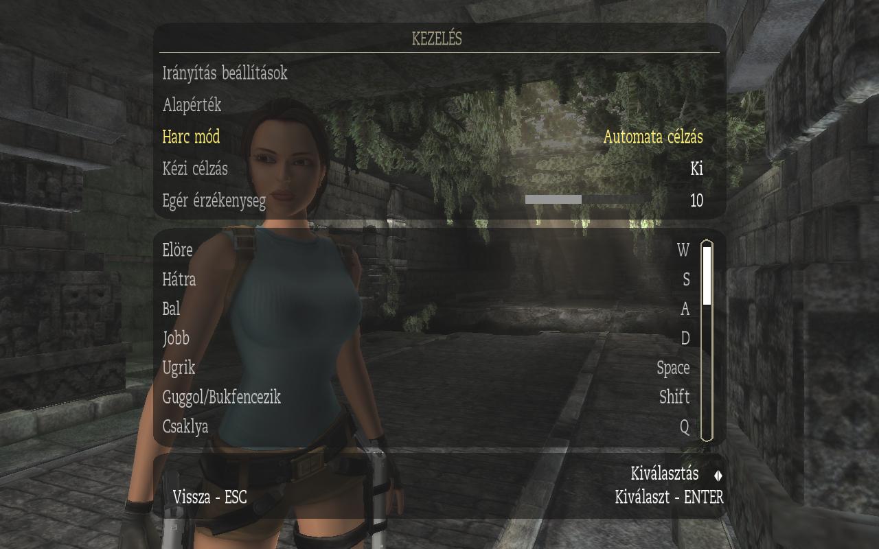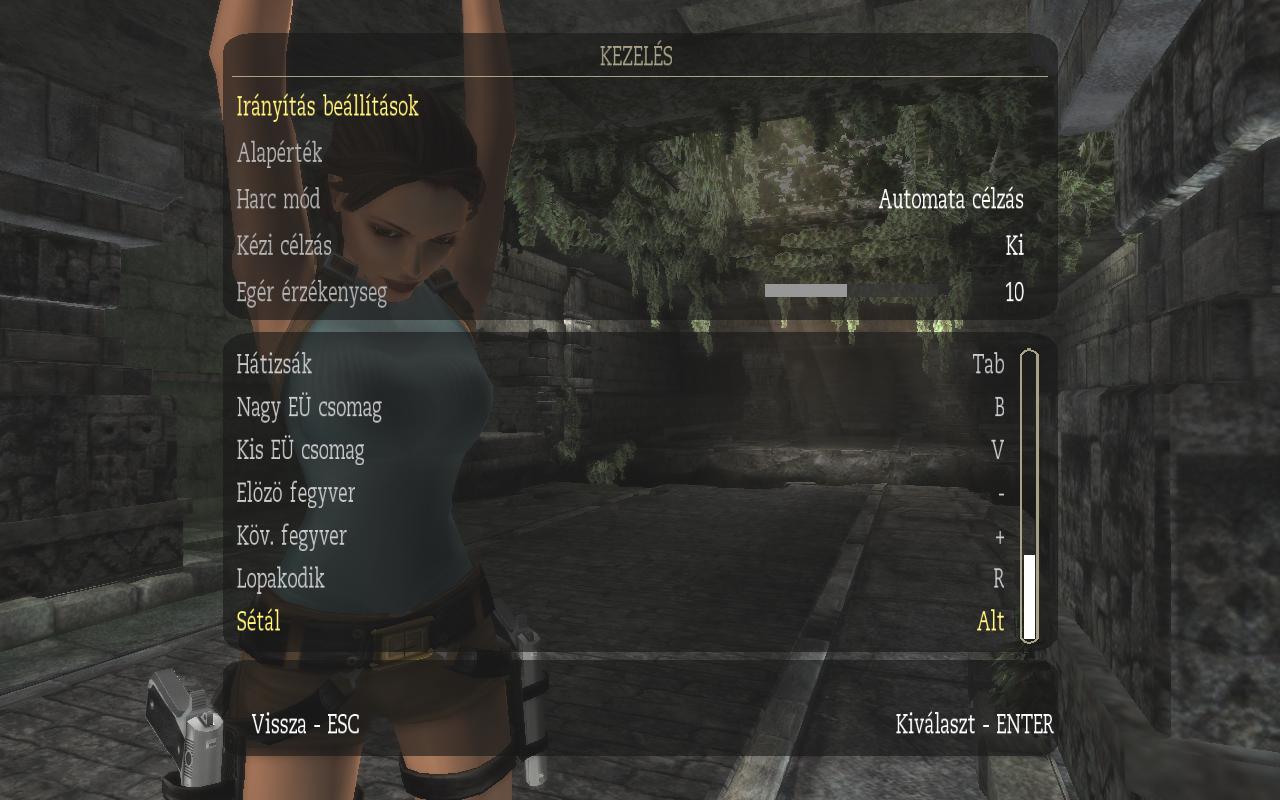 Manual: Az irányítás a kamerához rögzített. Lara csak akkor tartja a fegyvert, ha nyomva tartod a 'Combat Mode toggle' gombot. Az ellenfelet befogja, és folyamatosan követi, a kamera is azonnal, ezért mindig a képernyõ közepén marad az ellen. Ilyenkor nem tudod a kamerát elforgatni semerre, csak ha elengeded a 'Combat mode toggle'-ot.