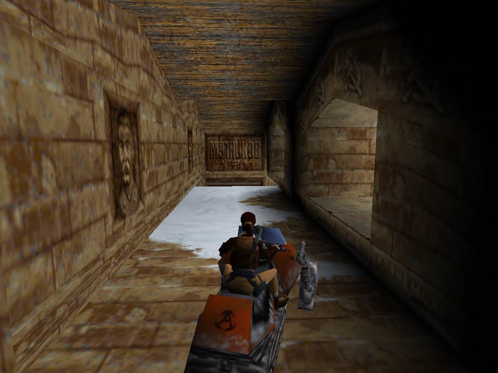 Essünk bele a vízbe, ússzunk ki, nyírjuk ki a ránk támadókat. Menjünk be a kinyílt ajtón, vegyük fel az eü. csomagot, menjünk be a másik terembe, fel az emeletre, húzzuk meg a kart, utánunk jön két lángszórós, akit lõjünk le. Menjünk oda vissza, ahol kijöttünk a vízbõl, és menjünk fel az emeletre, keressük meg a kart, húzzuk le, és az így kinyíló résznél tologassuk el, a dobozokat, ahol is megtaláljuk az elsõ titkos helyet. Menjünk be a kinyílt ajtón, fussunk körbe, és végezzünk a botosokkal, bent húzzuk meg a kart. A kinyílt ajtón menjünk be, végezzünk mindenkivel. Jussunk fel az emeletre, menjünk a forgó lapátok felé, ott találhatunk, egy lehúzható kart. Húzzuk le, és a megnyíló ajtón menjünk be, lõjük le a dobermannt, és vegyük fel a Circuit Board-ot. Menjünk be, lõjük le a patkányokat, és a motorost. Vegyük fel az eü. csomagot, és a Car Kulcs 1-et. Szálljunk fel a szánra, menjünk lefelé, útközben ránk támad egy másik motoros, lõjük le. A fordulóban szálljunk le a motorról. Ugorjunk a vízbe, lõjük le a lángszóróst, vegyük fel a tárgyakat, húzzuk meg a víz alatti kart, másszunk fel a falon, öljük meg az õrt, toljuk el a dobozt, és vegyük fel a lõszereket. Ugorjunk a vízbe, kövessük a folyosó irányát, vegyük fel a lõszereket, és mindent, amit találunk. Szálljunk fel a szánra, menjünk ki a szabadba, vegyük fel a lõszert, erre megjelenik egy motoros, végezzünk vele. Menjünk a kártyaolvasóhoz, használjuk a kártyát, bent vegyük fel a másik kártyát, lõjük le az õrt. Menjünk ki a szabadba, mire Sztálin képét láthatjuk, menjünk be a bal oldali ajtón, végig a folyosón, forduljunk jobbra, és íme kinyílt az eddig zárt ajtó. Menjünk be, húzzuk meg a kart, mire 3 dobermann vesz minket üldözõbe, végezzünk velük, menjünk ki a tetõre és máris kiértünk a második titkos helyre. Menjünk teljesen vissza a második kártyaolvasóhoz, forduljunk meg és az elõzõ szobában, öljük meg az új õrt mire ránk, hagyja a piros kártyát. Használjuk elõször a piros kártyát, majd húzzuk le a kart, és szabaddá válik az út. Kint balra jussunk fel a legtetejére a szikláknak, majd egy nagy ugrással ugorjunk a hosszú magaslatra. Lõjük le az összes ellenséget, menjünk a dobozokhoz, tologassuk el, vegyük fel a lõszereket. Lõjük le fentrõl a jobboldali õrt, majd menjünk, és szedjük fel, amit maga után hagyott. Menjünk át szembe, lõjük le a lángszórósokat, a patkányokat, kerüljük el a legördülõ hordókat, a sötét falnál balra lent találjuk a sárga kártyaolvasót, használjuk kártyánkat, mire megnyílik a rács. Essünk bele, így átjutunk a halott lángszórósokhoz. Vegyük fel az összes víz alatti tárgyat, majd menjünk be a nyitott ajtón. Menjünk fel az emeletre, lõjük le az õrt. Menjünk ki a nagy barlangba, balra a kövek között van a harmadik titkos hely. Menjünk le középre, lõjük le az õröket, majd menjünk át fel a puskás emberhez. Végezzünk vele, szedjük fel a cuccokat. Menjünk vissza középre, ugorjunk rá a mászható falra, lefelé mászva, az utolsó helyrõl ugorjunk hátra, szerezzük meg a nagy eü. csomagot, lõjük le a patkányokat, majd háttal csússzunk le. Vegyük fel a bal oldali mélyedésben a lõszert, majd fussunk be az átjáróba.