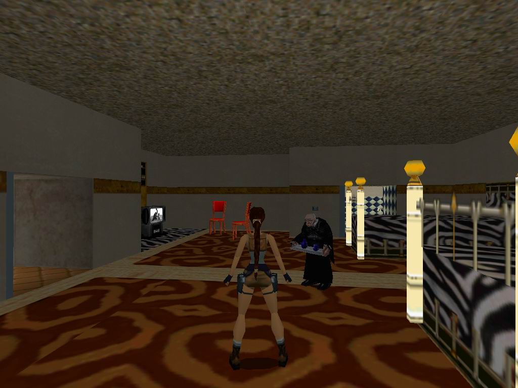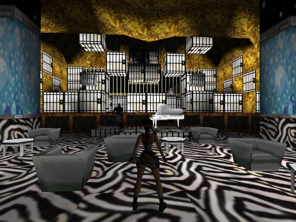 Nyissuk ki az összes ajtót a melle lévõ gombokkal. Kijuthatunk az erkélyre is, de a leesésen kívül semmi mást nem tudunk itt csinálni. Az egyetlen olyan ajtó mellett menjünk el, aminél nincs kapcsoló, és kinyílik az ajtó. Látunk két ajtót, és egy zárat, ill. egy ablakot. Lõjük ki az ablakot, menjünk ki, ugorjunk a jobb oldali részre. Másszunk balra, fel, ugorjunk balra, lõjük le a fegyvereseket. Szedjünk fel mindent, nyissuk ki az ajtót. Üdvözöljük rég nem látott inasunkat. Vegyük fel a zuhanyzóból a kulcsot. Menjünk ki a folyosóra, a kulccsal nyissuk ki a kétszárnyú ajtót. Menjünk be a központi terembe, ott balra, Láthatjuk a sasfejû bõsz testvérét, még bezárva. Jussunk fel az emeletre, vegyük fel a tárgyakat, vissza, ugorjunk a szemközti sárga építményre. Vegyük fel a nagy eü. csomagot, forduljunk el 90 fokkal balra, és másszunk le teljesen. Fussunk a medence felé, lõjük le a fegyvereseket, majd vegyük fel a kulcsot a medence aljáról. Használjuk a kulcsot a záron, majd menjünk be a T-Rex, még elzárt területére. Lõjük le a fegyvereseket. Menjünk vissza, és tovább a hangversenyterembe. Nyomjuk be a két oldalon látható gombot, mire leomlik a fal. Menjünk arra, majd a felbukkanó õröket szórjuk meg ólommal. Miután végeztünk az õrökkel, húzzuk el a két dobozt a lenti doboz mintájú felületre. Kinyílik a zárt csapóajtó, menjünk le, tologassuk el a dobozokat, és megleljük az elsõ titkos helyet. Menjünk vissza a központi terembe, majd az újonnan megnyílt ajtón be. Hívjuk le a liftet, újra a kart szálljunk be a liftbe, megérkezve szálljunk ki, küldjük el a liftet, ugorjunk a tetejére, majd onnan a létrán fel. Bejutva essünk le, lõjük le az õrt, majd ugorjunk a jobboldali sárga kõre. Onnan sétálva a pengék között, vegyük fel a lõszert, majd ugorjunk a fekete csillagos felületre. Szedjük fel az ajtónyitó csippet, és a nagy eü. csomagot. Ugorjunk vissza a sárga kõre, onnan csússzunk le. A medencénél rakjuk be a csippet a foglalatba. Lõjük le az elsõ T-Rex-et, vegyük fel a Liftirányítót. Erre elõkerül egy másik T-Rex. Menjünk be a szálláshelyükre, és megtaláljuk a második titkos helyet. Kapaszkodva másszunk fel a központi kõállvány tetejére. Ugorjunk át a folyosóra, fussunk balra le a lõszerekért. Fussunk vissza a lifnyitóhoz. Használjuk a felszedett tárgyat. Hívjuk le a liftet, kapcsoljuk át, szálljunk be. Kint vegyük fel a lõszereket, és a nagy eü. csomagot. Mire végeztünk, felér hozzánk a sasfejû tesója. Fussunk a lift felé onnan lefelé. Lent az elzárt területen találjuk meg a harmadik tikos helyet. Most már csak a sasfejü kinyuvasztása maradt ránk. És eme mozzanat visz minket a TR2 Gold 100%-os végigjátszásához.