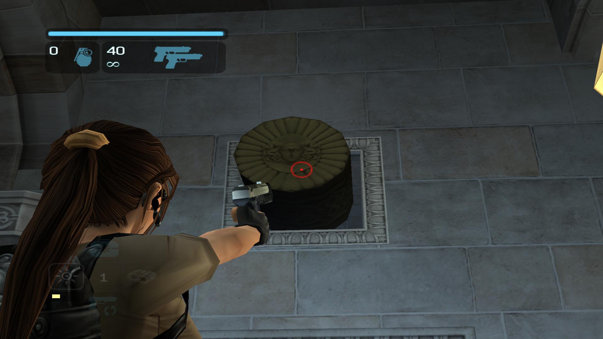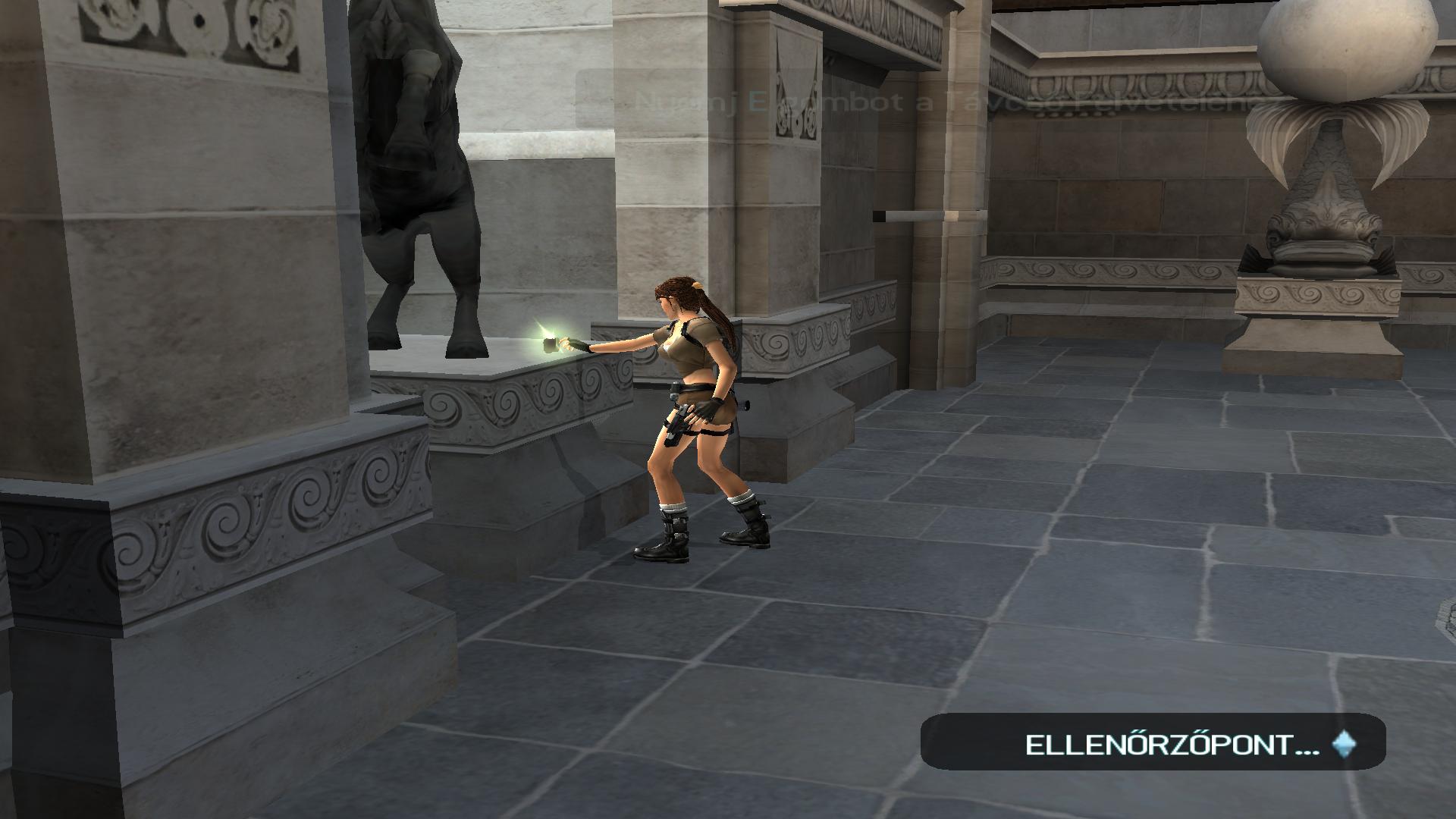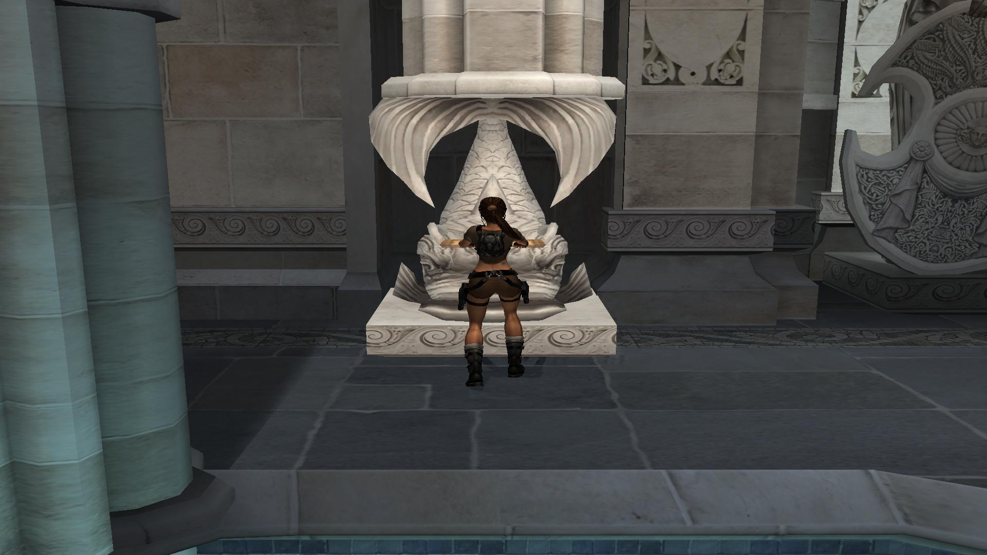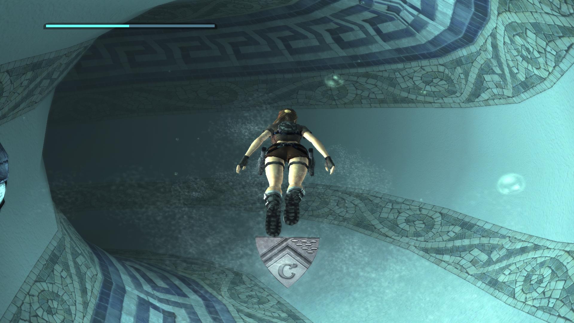 Ugorj a medencébe, és tanulj meg úszni. A kurzorokkal irányítasz, a guggolással merülsz lejjebb, és az ugrással jössz felfelé. Húzd meg oldalt a kart a vízben, és kinyílik a rács a medence oldalán. Menj vissza az első karzatra, és fordítsd vissza a szobrokat, és olvasd el az írást. Az ugródeszkáról ugorj egy fejest, és vedd fel a medencében a 10. Bronz pajzsot.