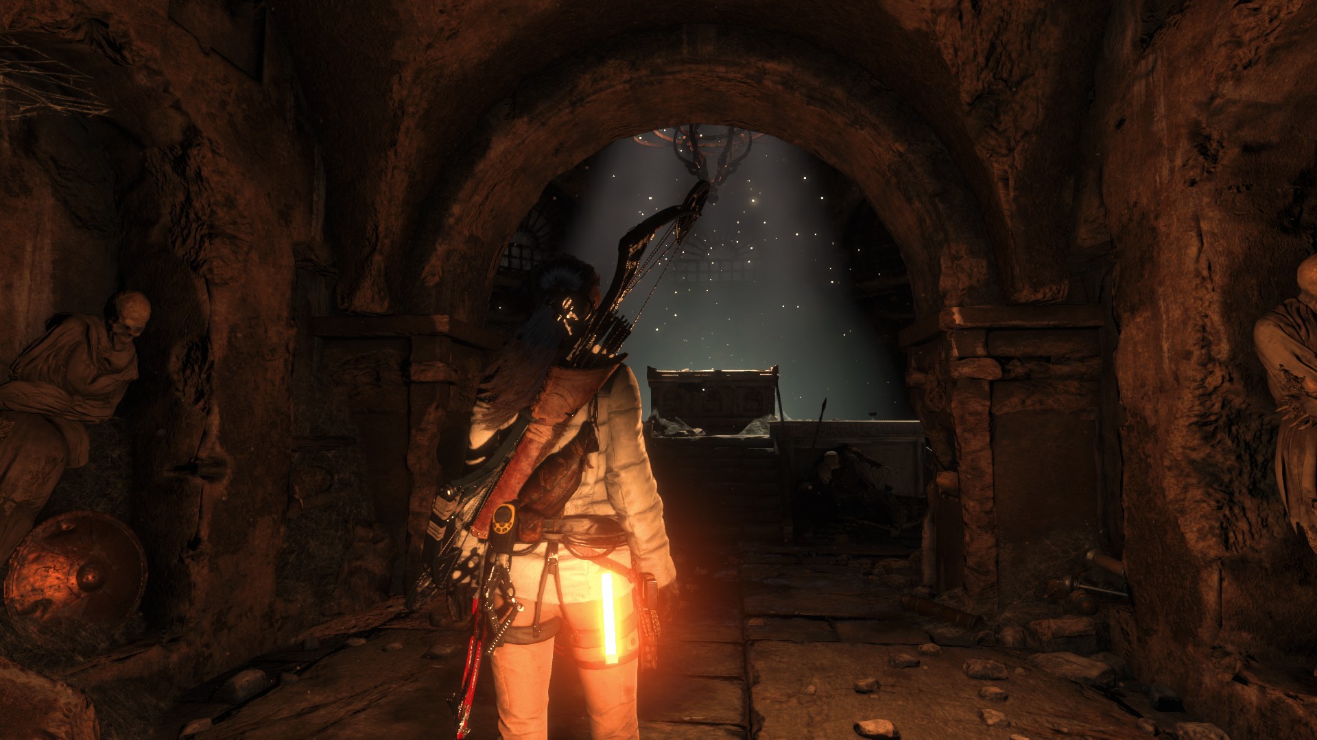 Az eszmecsere után ülj le kicsit a tábortűzhöz. Javaslom, fejleszd ki az Eye for Detail-t, így a kihívások objektumai látszani fognak, villognak. A romos fal előtt, kis xp-t kaparhatsz ki magadnak a földből. Ugrás a kötélre, majd lecsúszás után újabb xp-t szerezhetsz meg. Megkopasztva a kis facsemetét menj tovább jobbra, ahol xp-s ládikát találsz. Bújj át a sziklarésen, és menj be a barlangba.