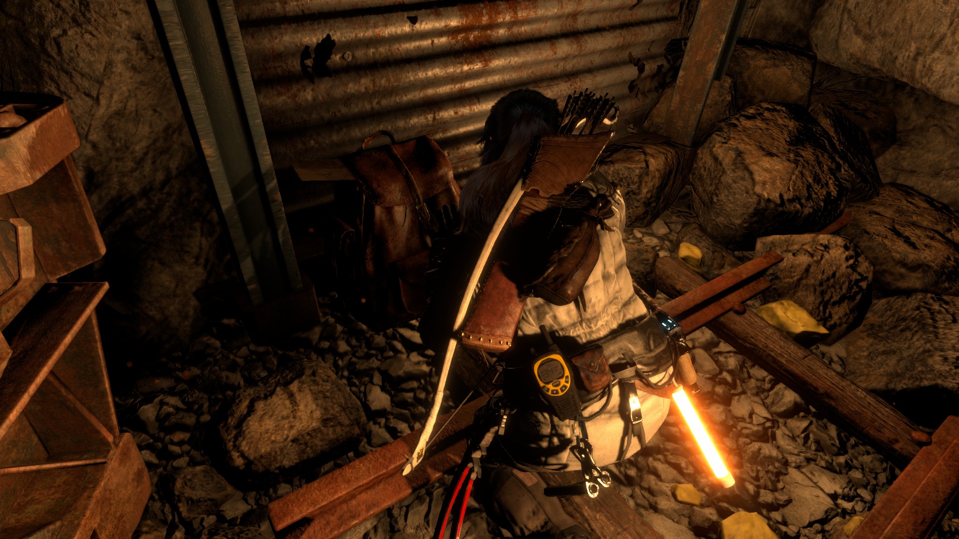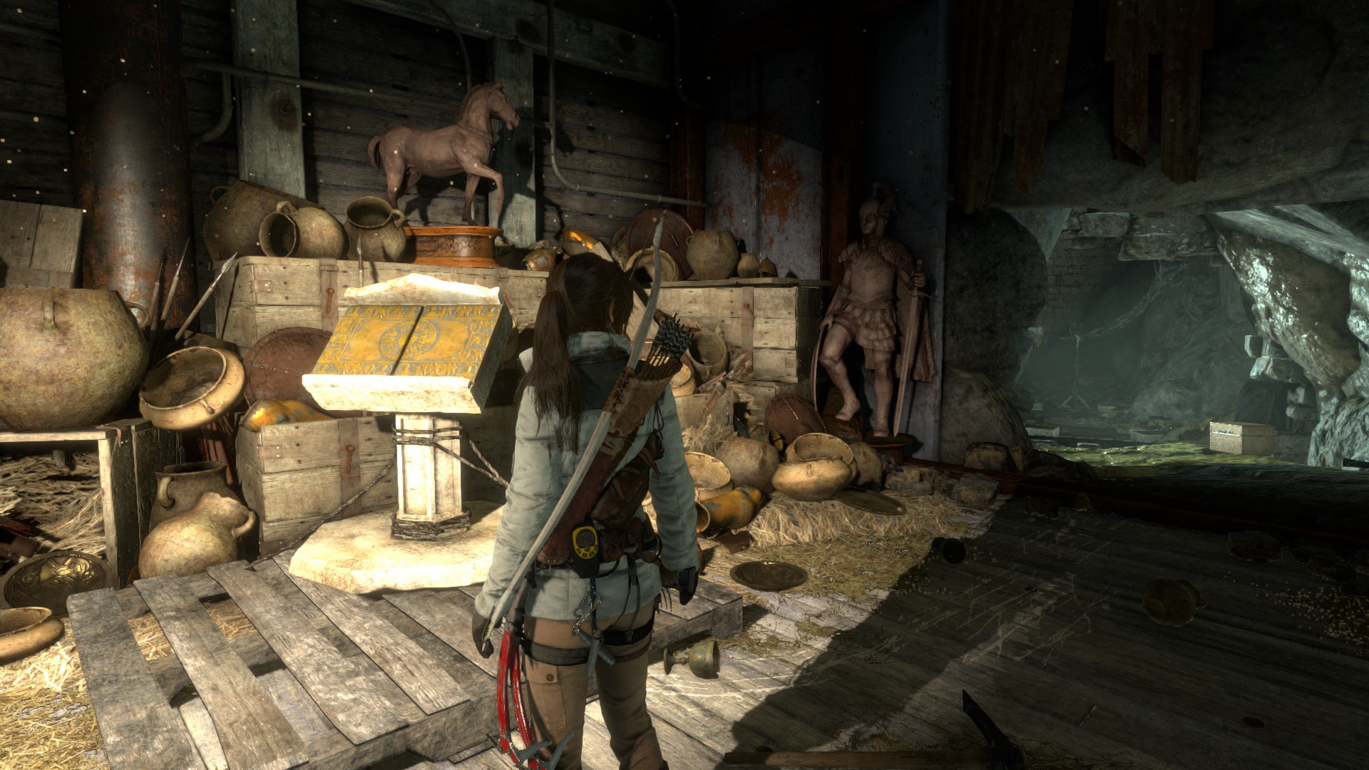 Vedd fel a ládikából a lőszereket, és a fal mellett is találsz nyilat, lőszeres dobozt. A falon át juss a másik terembe.