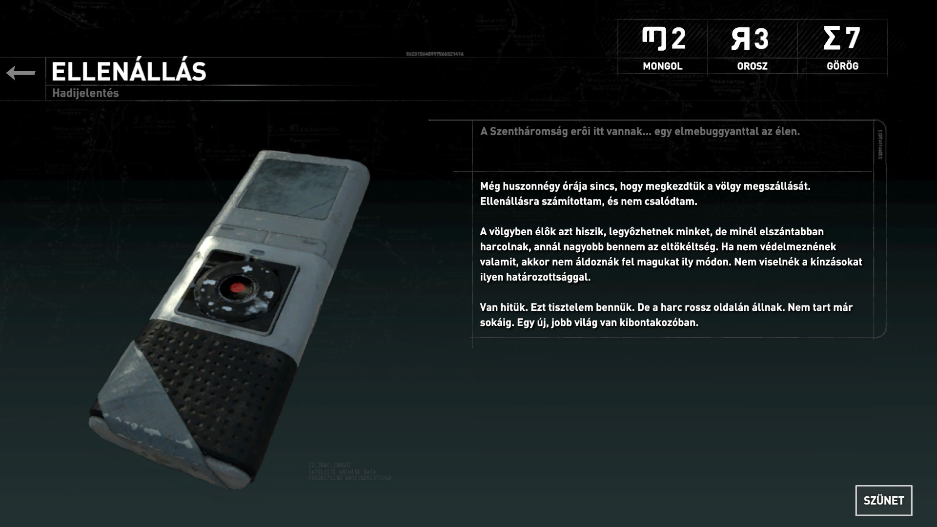 Ellenálló - Igen... igen... Ez segít majd az ellenállás megszervezésében. Köszönettel tartozunk a segítségedért. Ez Puska hangtompító a tiéd, és kellemes utat. Ez a völgy igen veszélyes tud lenni. Üdv.