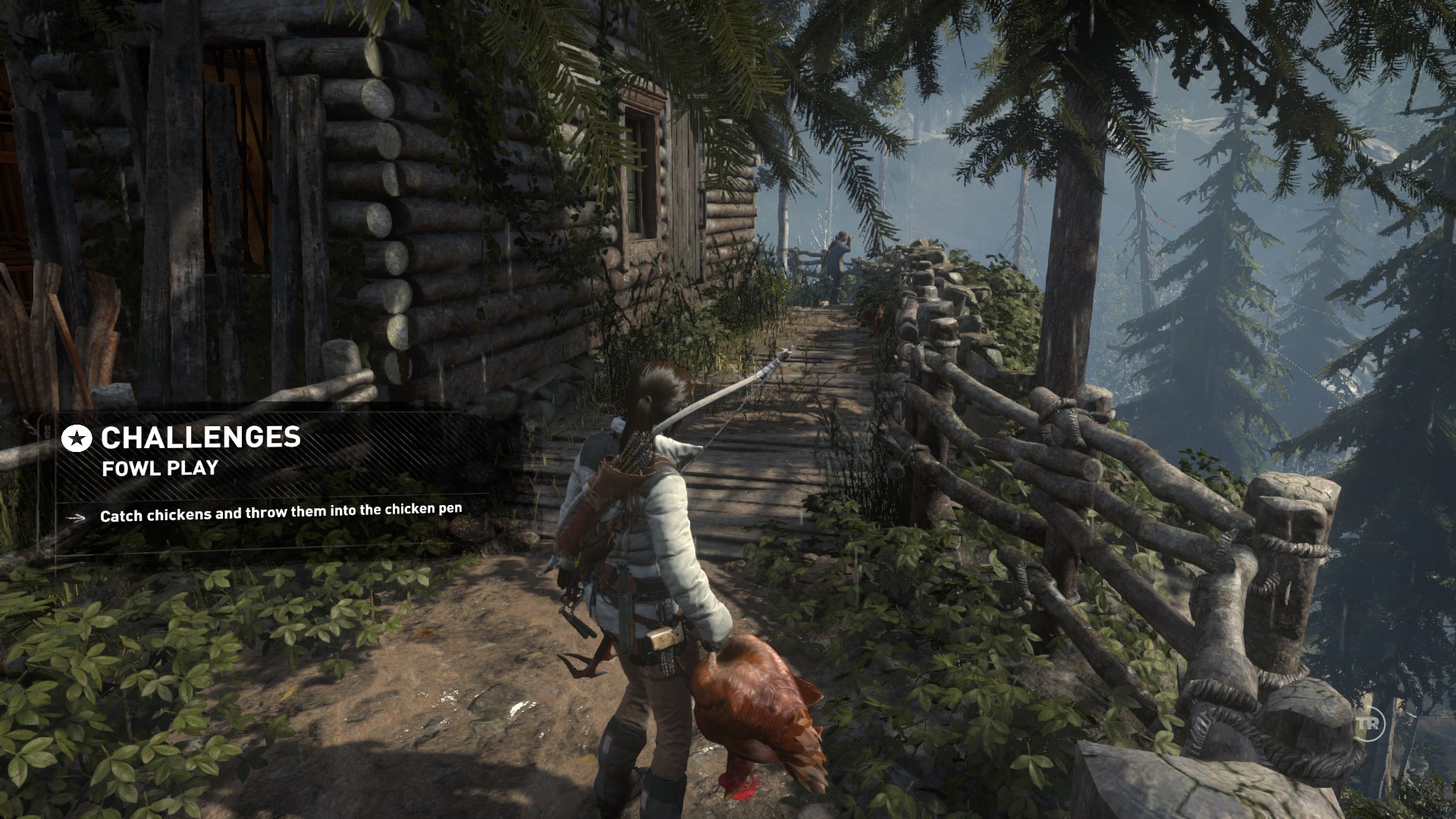 1. Kihívás: Menj most le a házak közé. Fogj meg 5 csirkét, és vidd őket az egyik ház előtt elkerített részre. Bizony használnod kell a gyorsfutást, hogy utolérd őket. Úgy nem jó, ha beugrasz vele az elkerített részre. Célozva, be kell dobni őket oda. Ez volt az első feladat.