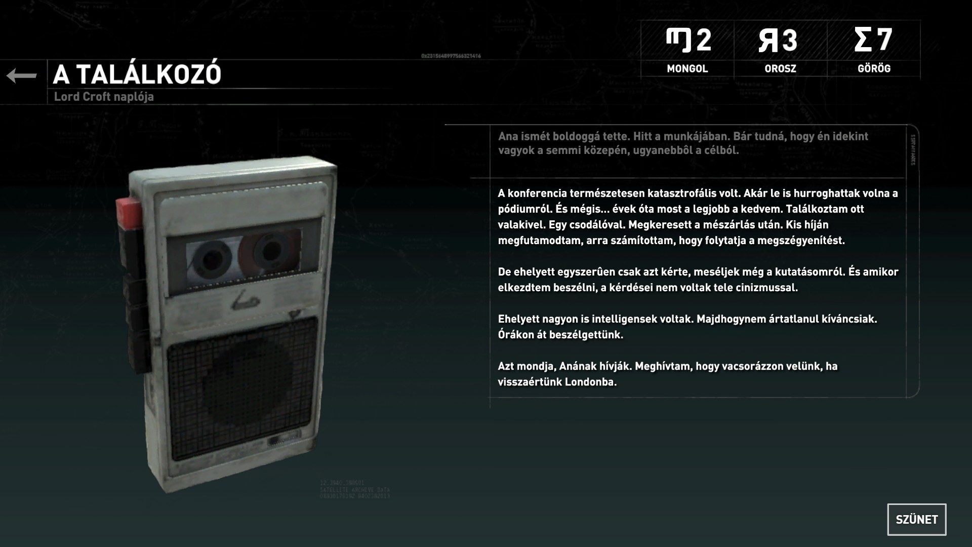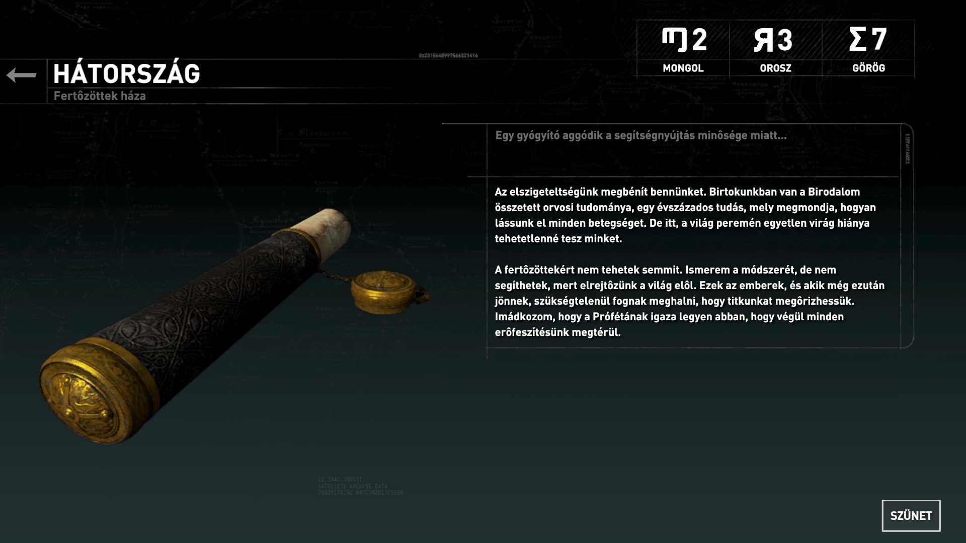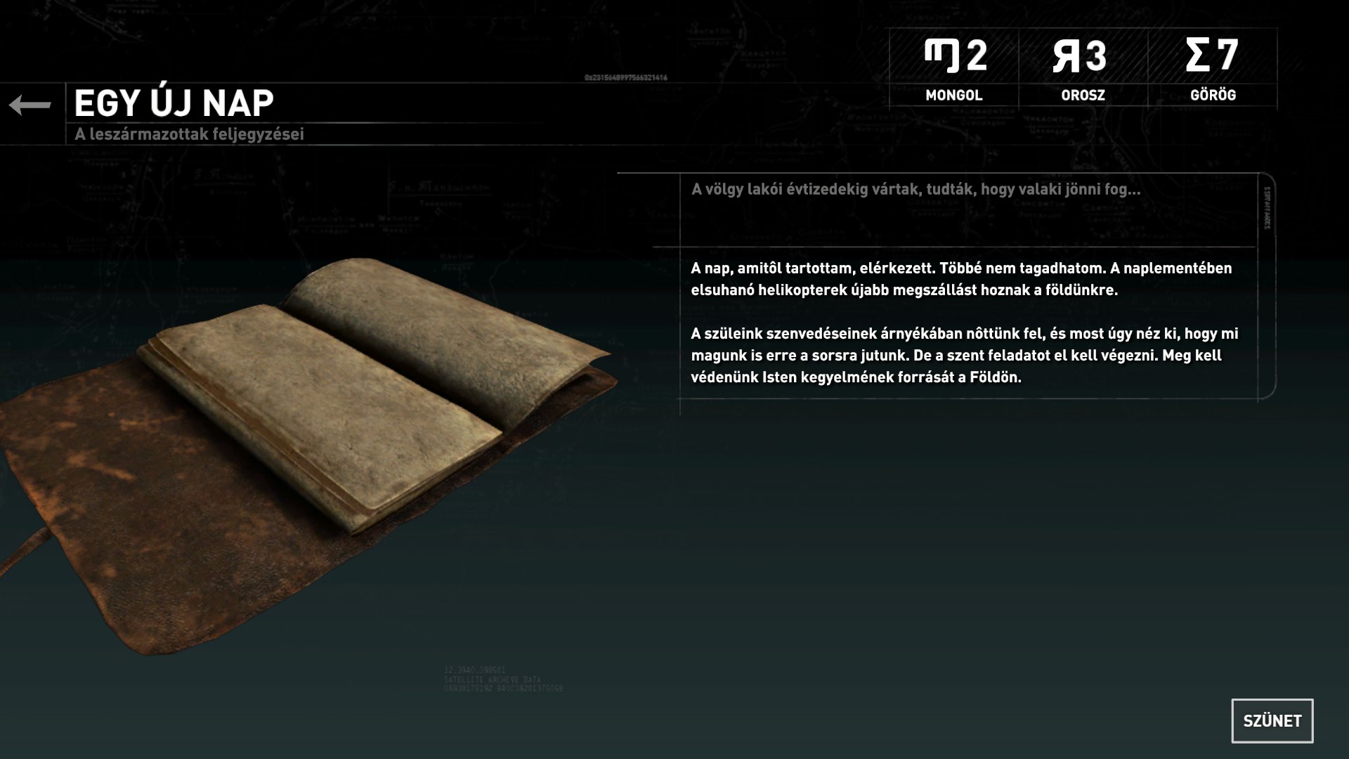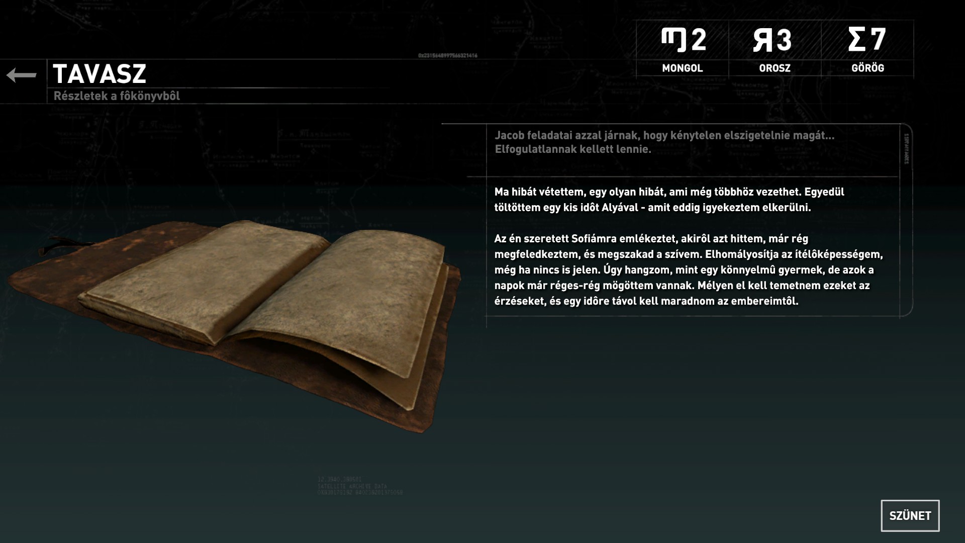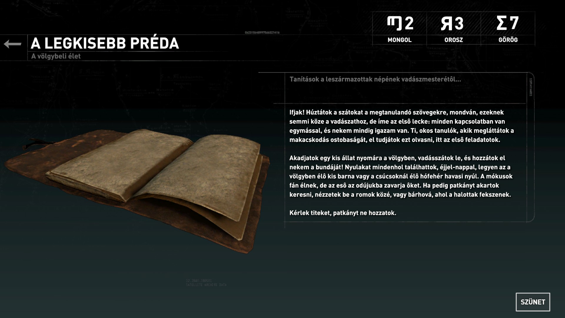 1. Misszió: Védekező stratégia: Gyűjts 4 keményfadarabot, és gyűjts be 4 szarvasbőrdarabot. Menj le a lépcsőn, le a létrán az alsó kis erdős részbe. Keress kiszáradt fákat, és törd ki őket. A fa meg is van. Lőj szarvast is, kettőt, és ha megvagy, menj vissza a toronyba és jelentsd. megkapod a következő feladatot. Közben az egyik magaslesen megtalálod a 3. dokumentumot. ![]()