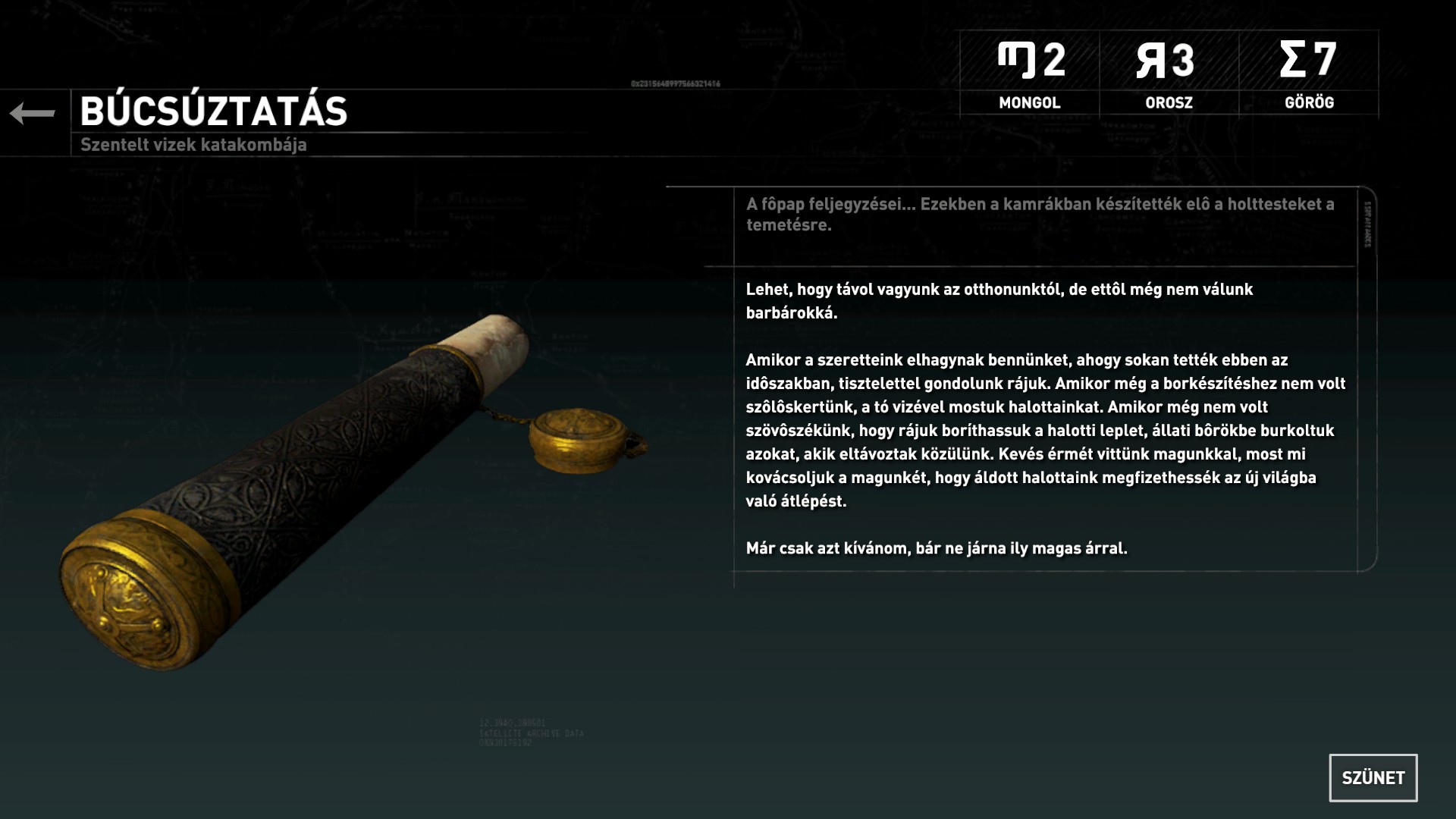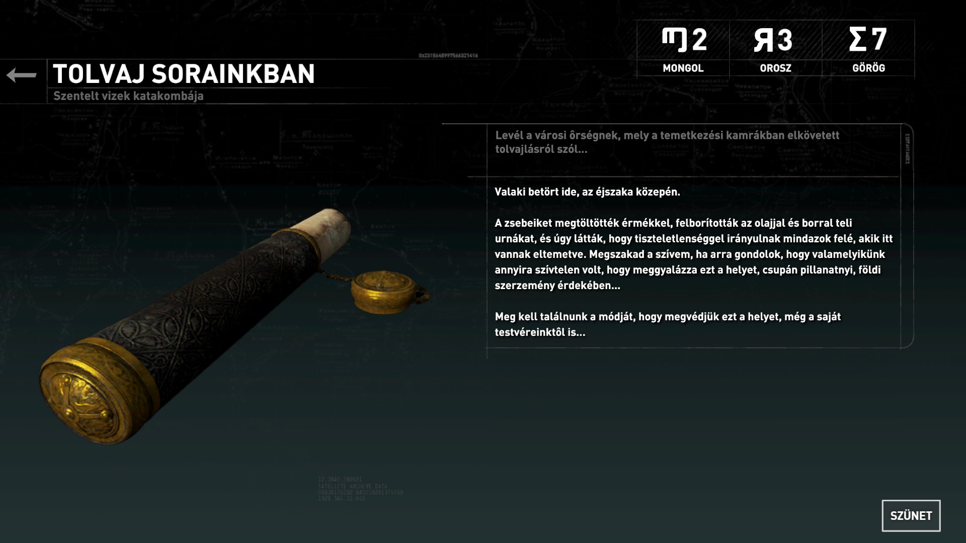 Törd át a falat, menj le a lépcsőn, bányássz egy kis magnezitet, a kötélen csússz át a másik oldalra, és a falon olvasd el az írást a falon. (4/1) Görögül tanultál.