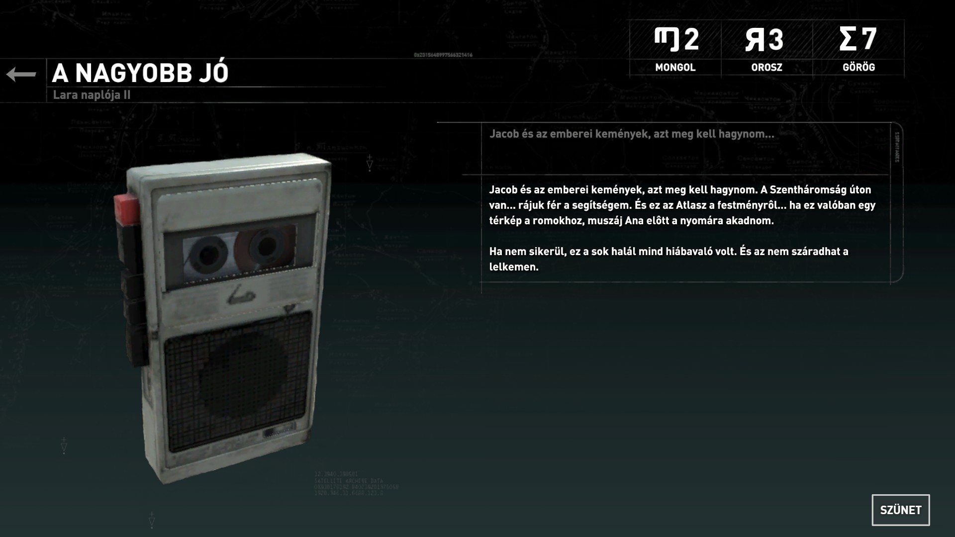 Lóvét is találsz az egyik beugróban, majd alattad felrobban egy akna. Erre vigyáznod kell ezentúl. Most megúsztad műláb nélkül. Gyilkold le a következő Trinityseket is, eddig mindegyiket lesből meg tudtad oldani. Bújj át a fali résen, és újabb gyilkolászás után Szófia kér meg, hogy szabadítsd ki. Elcsigázottnak tűnnek az ellenállók, ki kell innen juttatni őket.