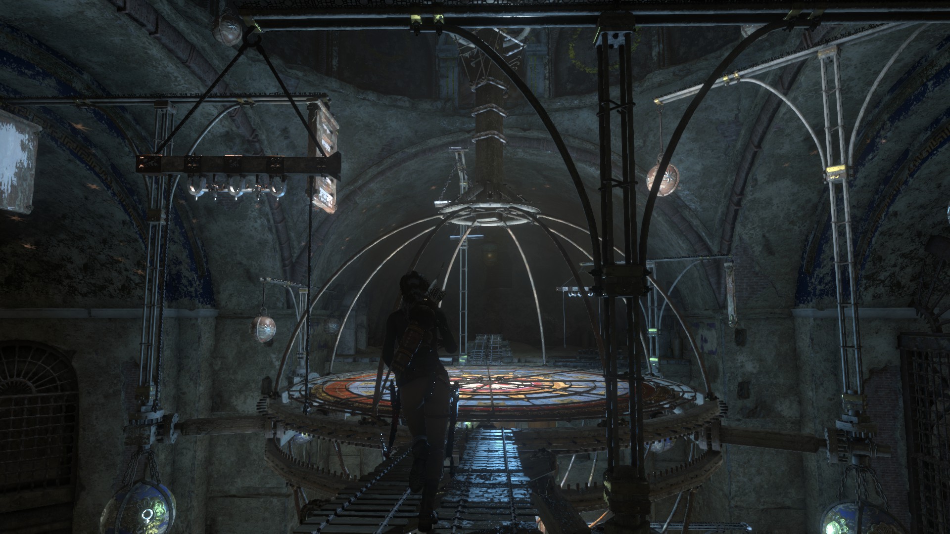 Szemben fel tudsz kapaszkodni egy másik ingára, de előbb jobbra, az azzal szemköztit kell úgy elforgatni a köteles bolygóval, hogy a köteles csáklyádat tudd majd használni. Az utána levő ingát is el kell forgatnod, hogy a palánkra érkezhess majd a köteles csáklyával. Ha sikerült, juss fel, és a kötelessel juss tovább a szemközti gerendára, majd végigmenve rajta, ugrás a palánkra, amit szintén elfordítottál még lent. Ha sikerült, mássz fel jobbra ugorva az emeletre. Balra egy kupac érmét vehetsz fel.