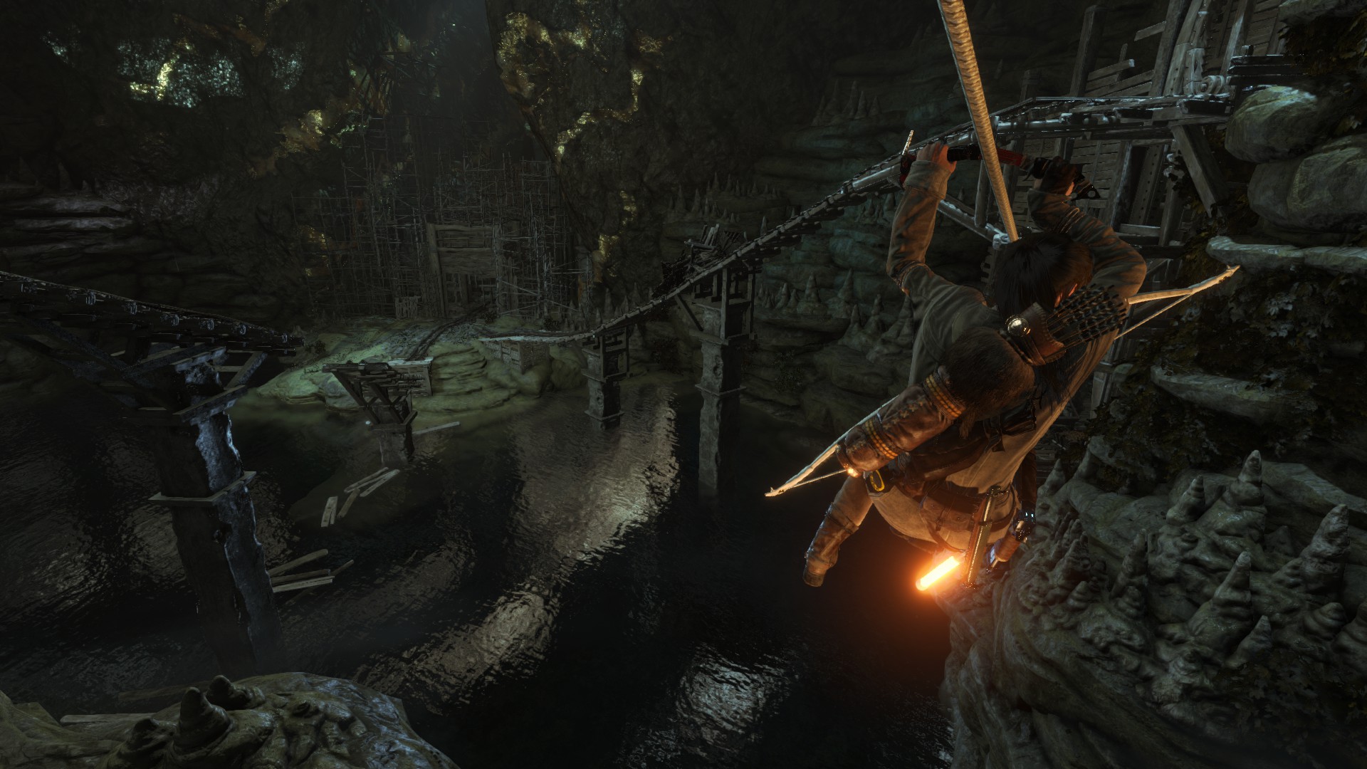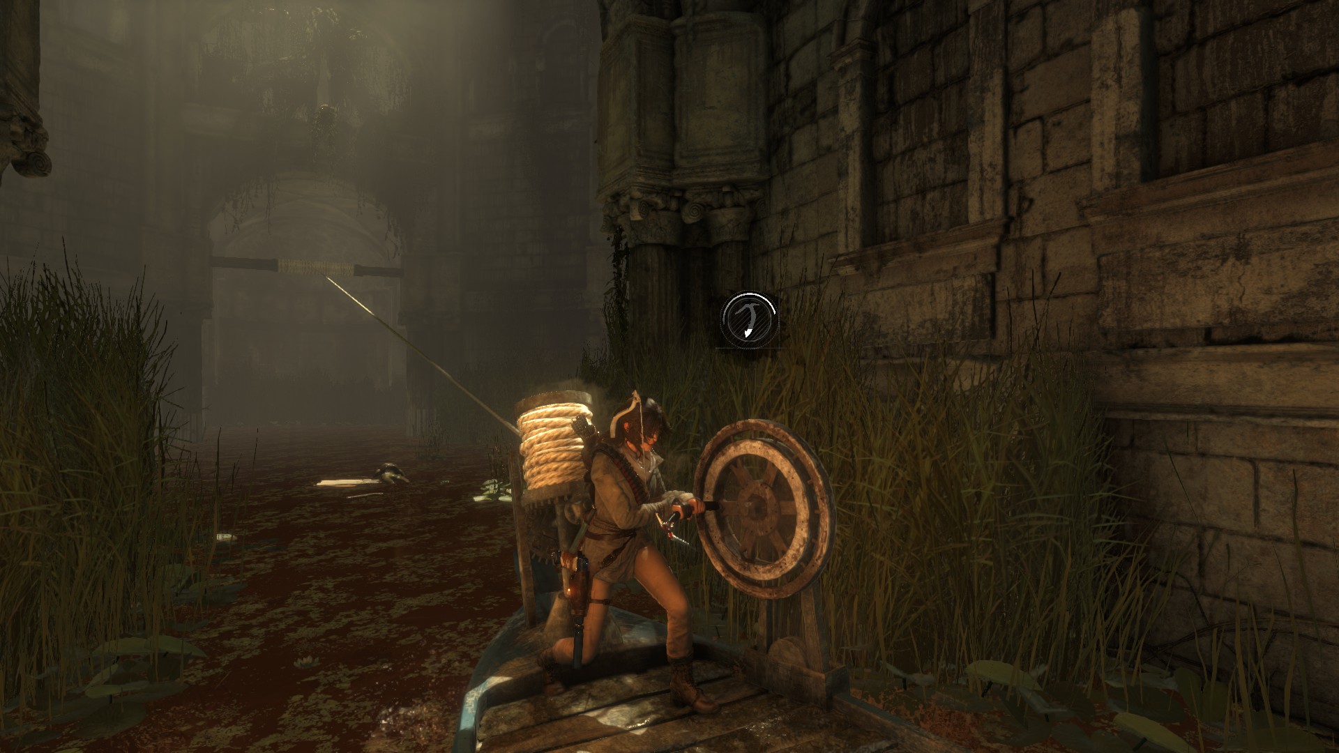 Ismét bújj át a fa gyökerei között, ismét ugrás a vízbe, de most balra haladj. Találsz egy ladikot, mássz fel rá. Lőj egy kötelet a szemközti gerendára, kösd a ladikon levő kötéldobra, és a tekerentyűvel vontasd magadat a terem közepébe. Most jobbra lőj egy kötelet a másik gerendára, így arra vontathatod magadat. Ugorj fel jobbra az ablakba, és beértél egy másik terembe. Ott is van egy kötéldob mindjárt a bejáratnál, de a víz alatt. Ússz át a szemközti oldalra, és húzd ki a kötéldobot tartó gerendát. Megnyitottad a zsilipet, és a vízszint lejjebb süllyedt. Lőj egy kötelet az elsüllyedt kötéldobba, és kösd oda a kötéldobra, ami mellett állsz. Ismét húzd ki a kötéldobot, hogy lemenjen a vízszint, majd gyorsan juss el a másikhoz, és a tekerentyűvel meghúzhatod a fentit, így most már tartósan lejjebb ment a vízszint, nem engedi vissza a vizet a zsilip.