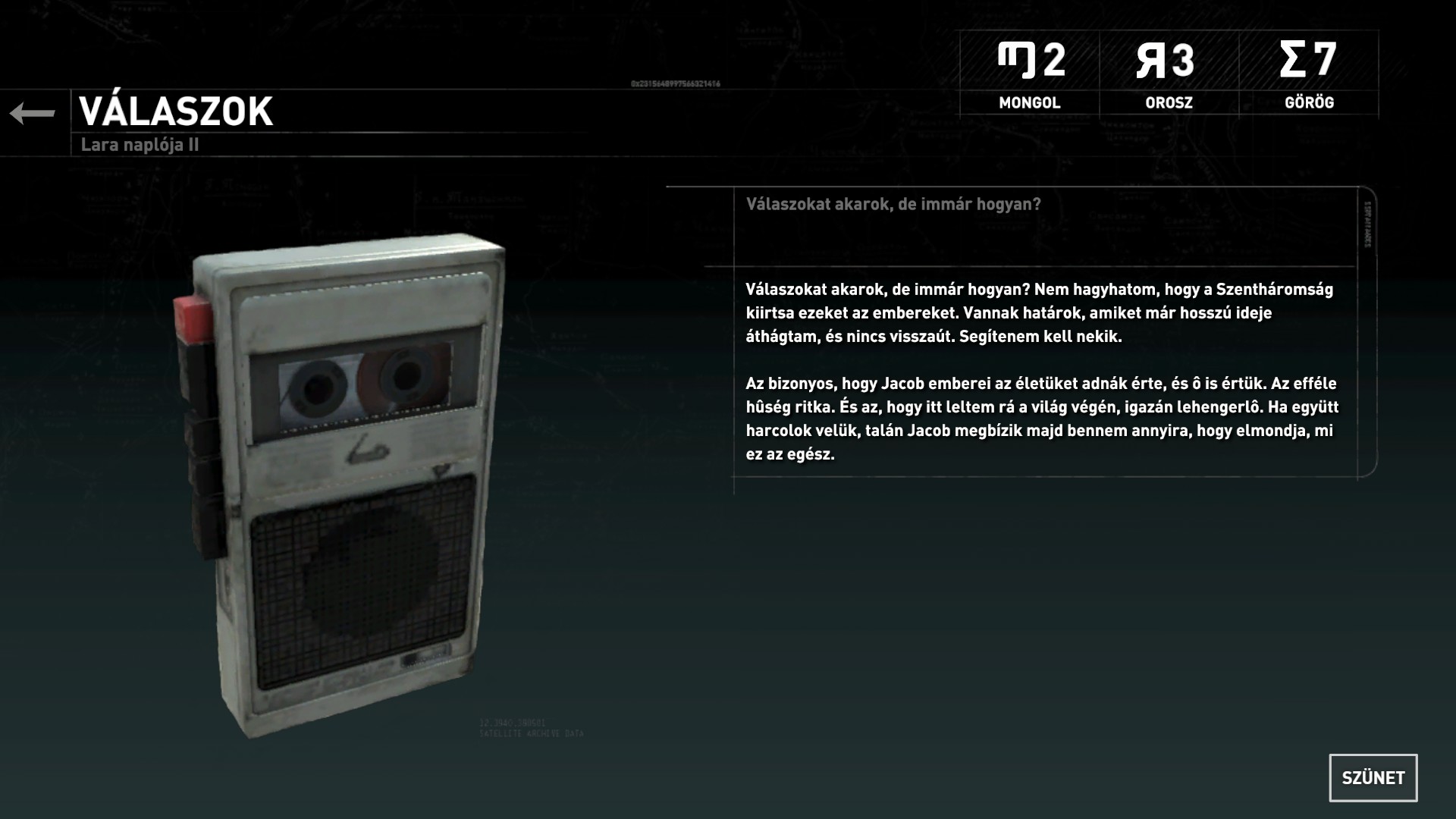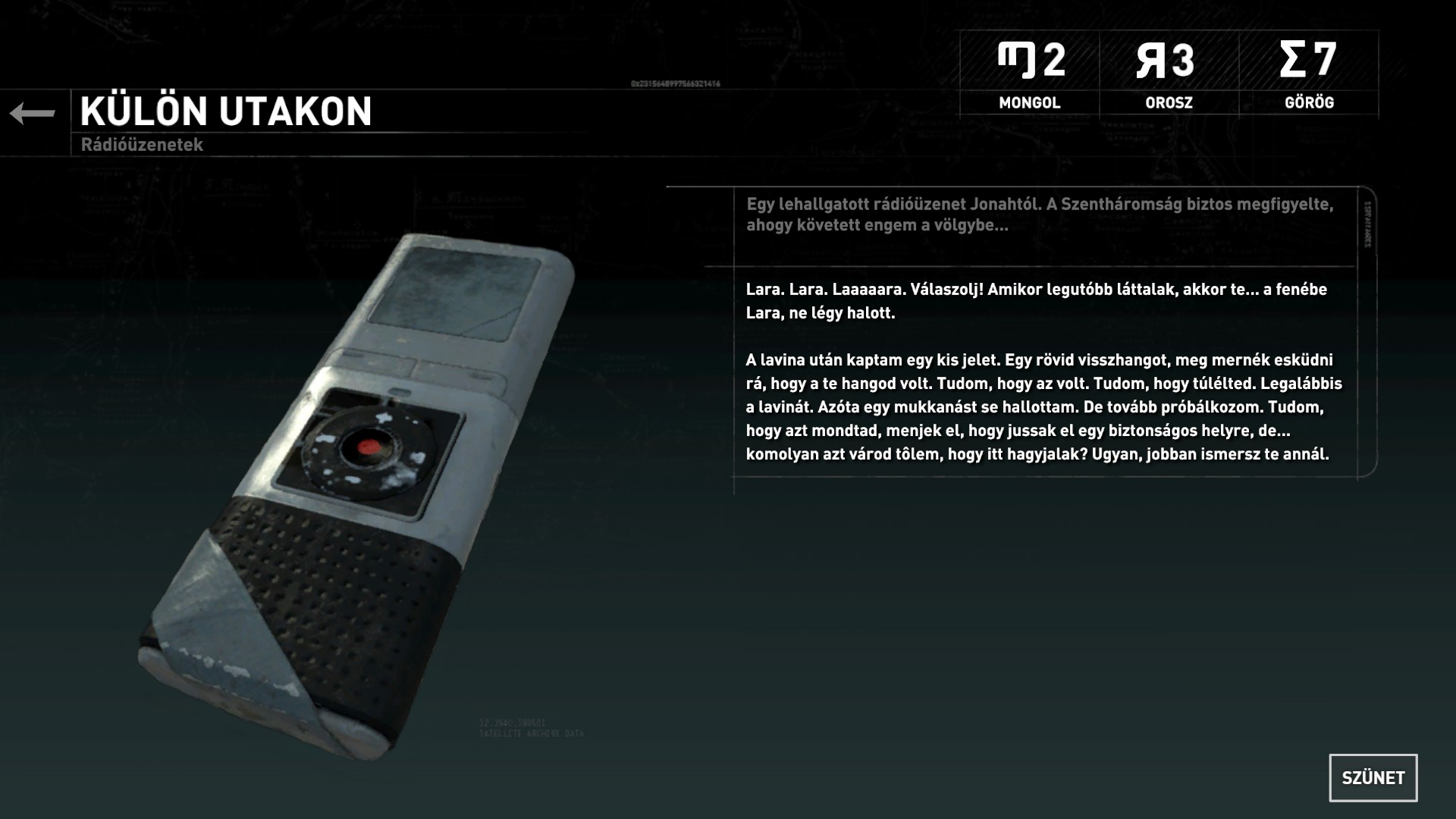 Lara - Ha Jónás életben van, biztos a régi szovjet gulágon tartják fogva. Soha nem akartam visszatérni arra a szörnyű helyre, de nem hagyhatom őt a Szentháromság karmai közt. Jónás... tarts ki!