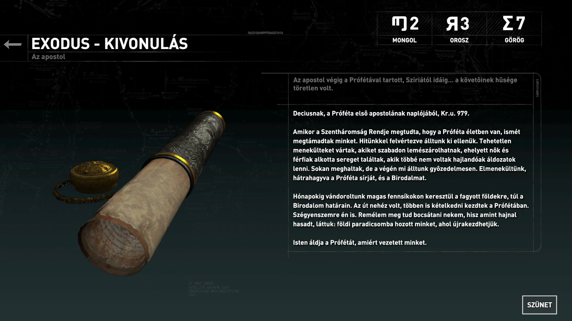 Felszedhető cuccok: Relikviák 13, Dokumentum 33, Írás a falon 4, Érmekupac 9, Túlélő doboz 20, Monolit 3, Kincsestérkép 9, Felfedező hátizsák 5, Vasláda 8.