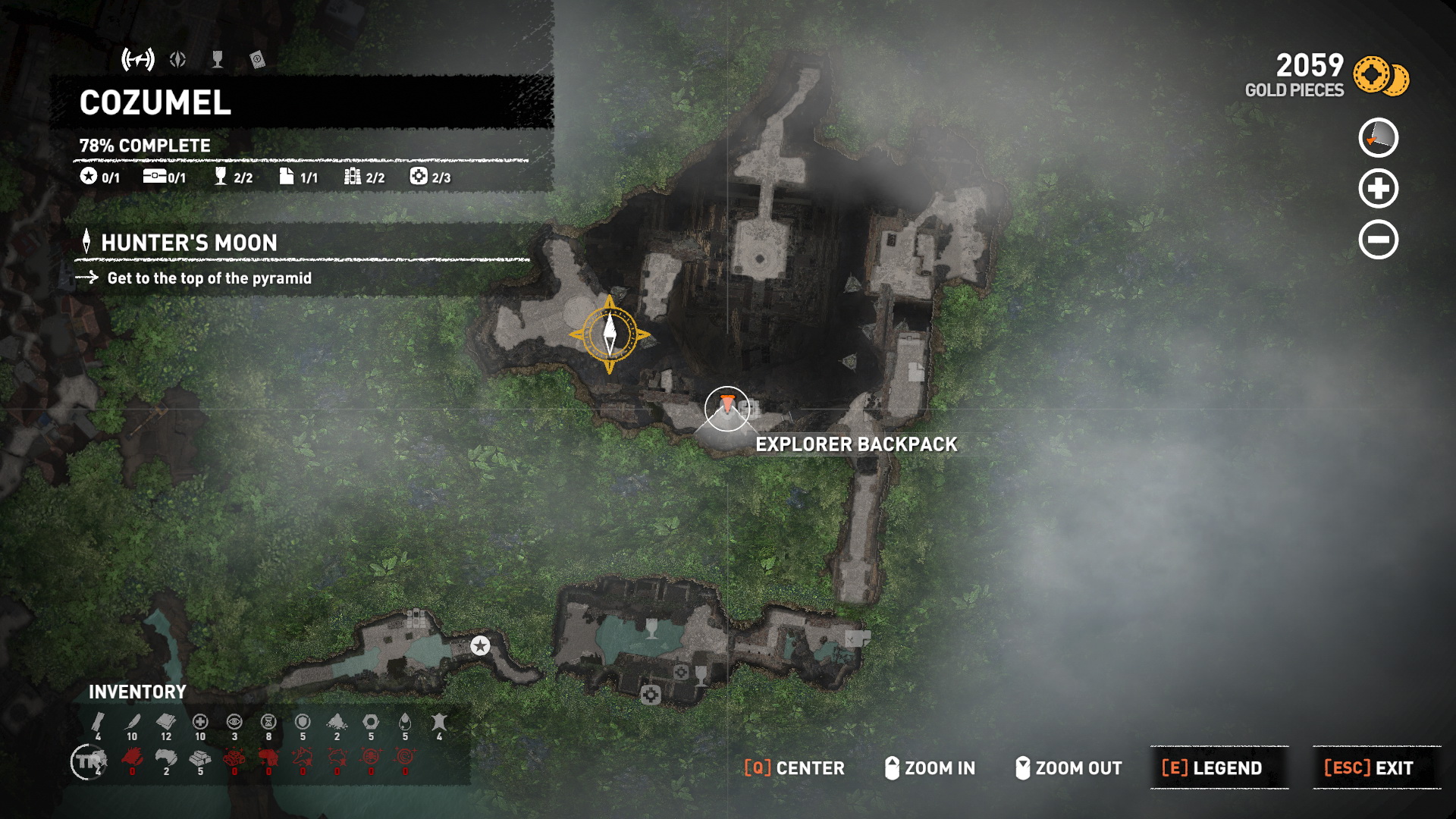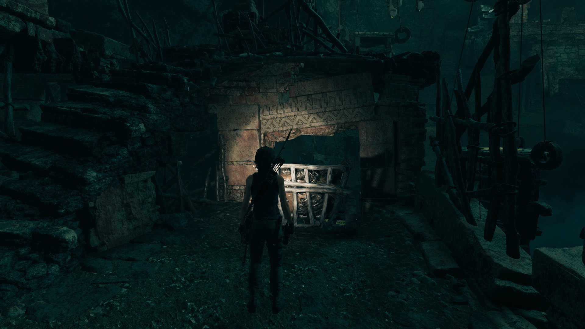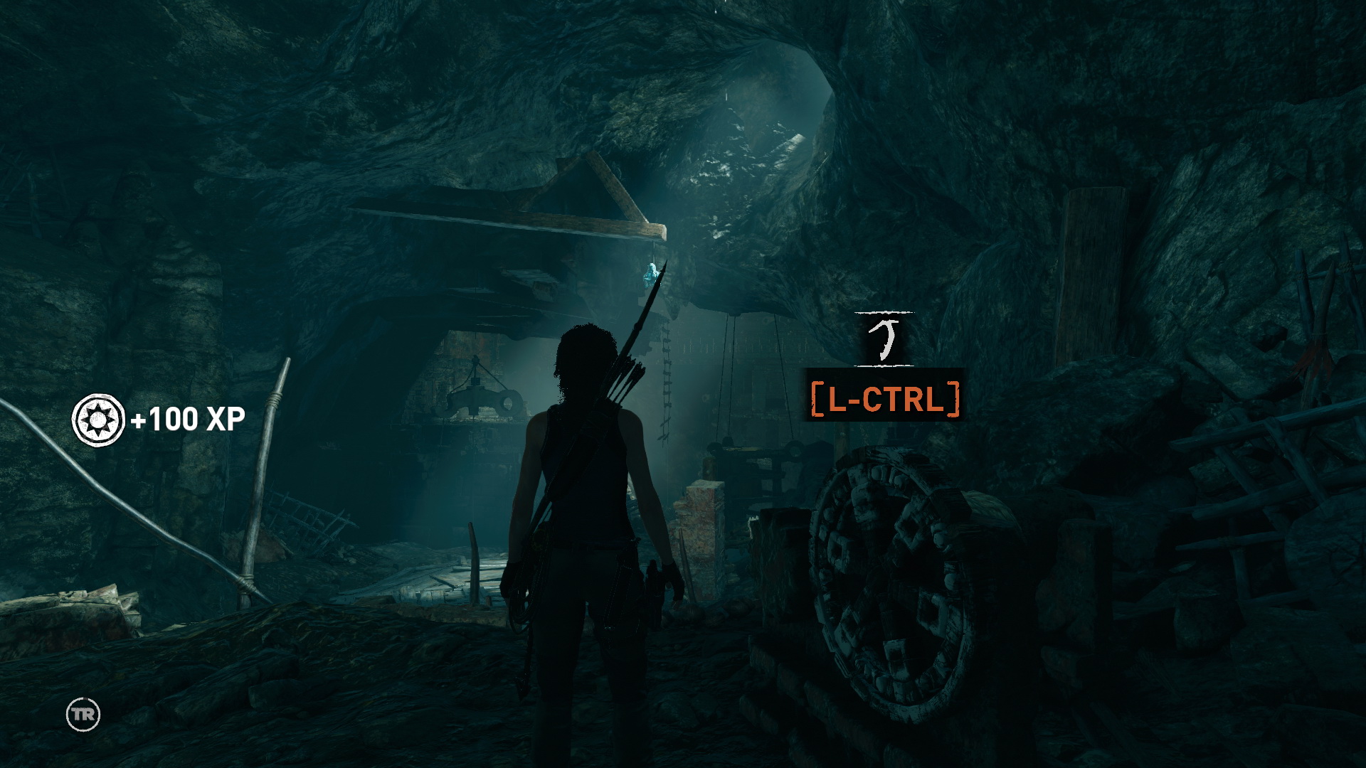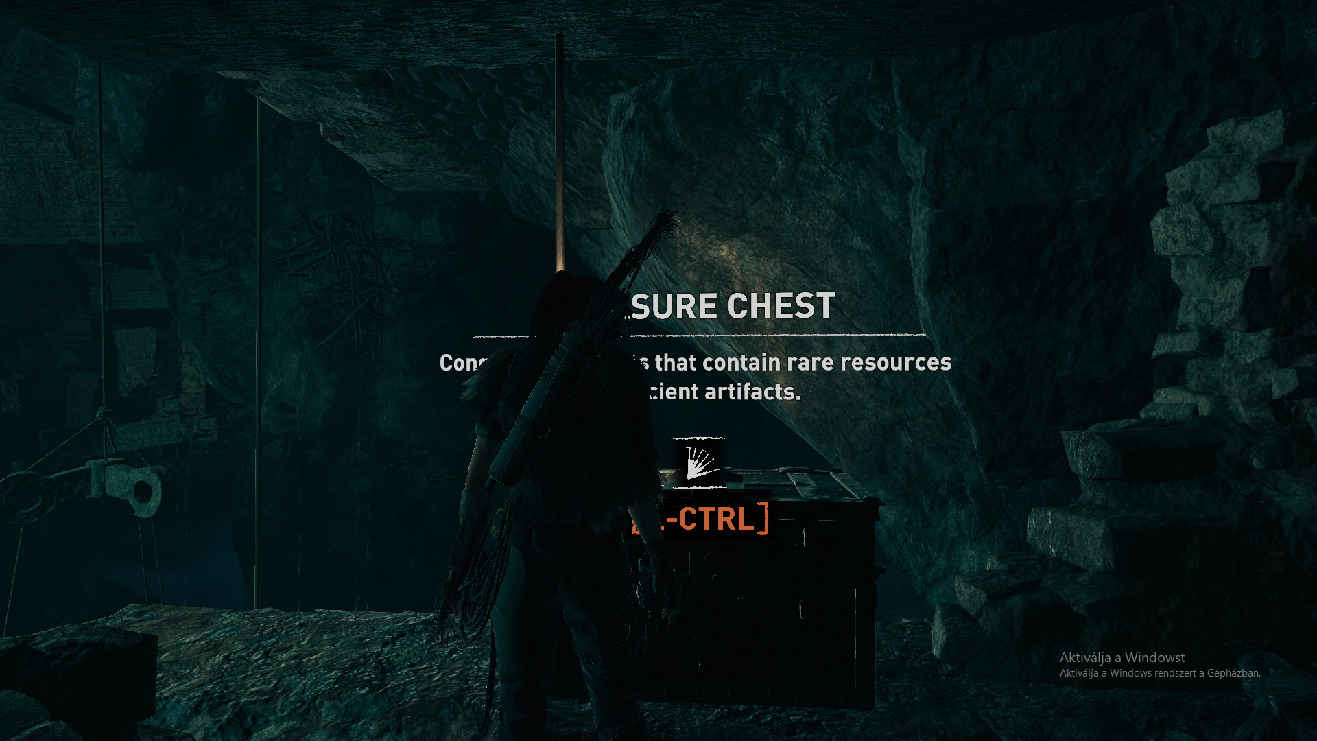 Lőj a szemközti részre egy kötelet, és mássz át rajta. Ha visszafelé nézel, látod, ott feljebb is van egy köteles gerenda. Ha oda átjutsz, találsz egy titkos kincsesládát, de még nem tudod kinyitni. Viszont találsz ott egy kupac aranyat is. Majd még visszajössz errefelé. Mindjárt mássz le a falon, ereszkedj le a kötéllel, és belengetve ugrás a kis folyosóra, ahol xp-t 3/3 bányászhatsz ki. Továbbmenve megtalálod a Felfedező hátizsákot,1/1, benne a Térképet. Ugrás a sziklafalra, mássz fel, ugrás-ugrás és feljutsz a magasba. Visszaértél oda, ahova a kötélen másztál fel. Olvasd meg az újabb Falfestmény-t 2/2.