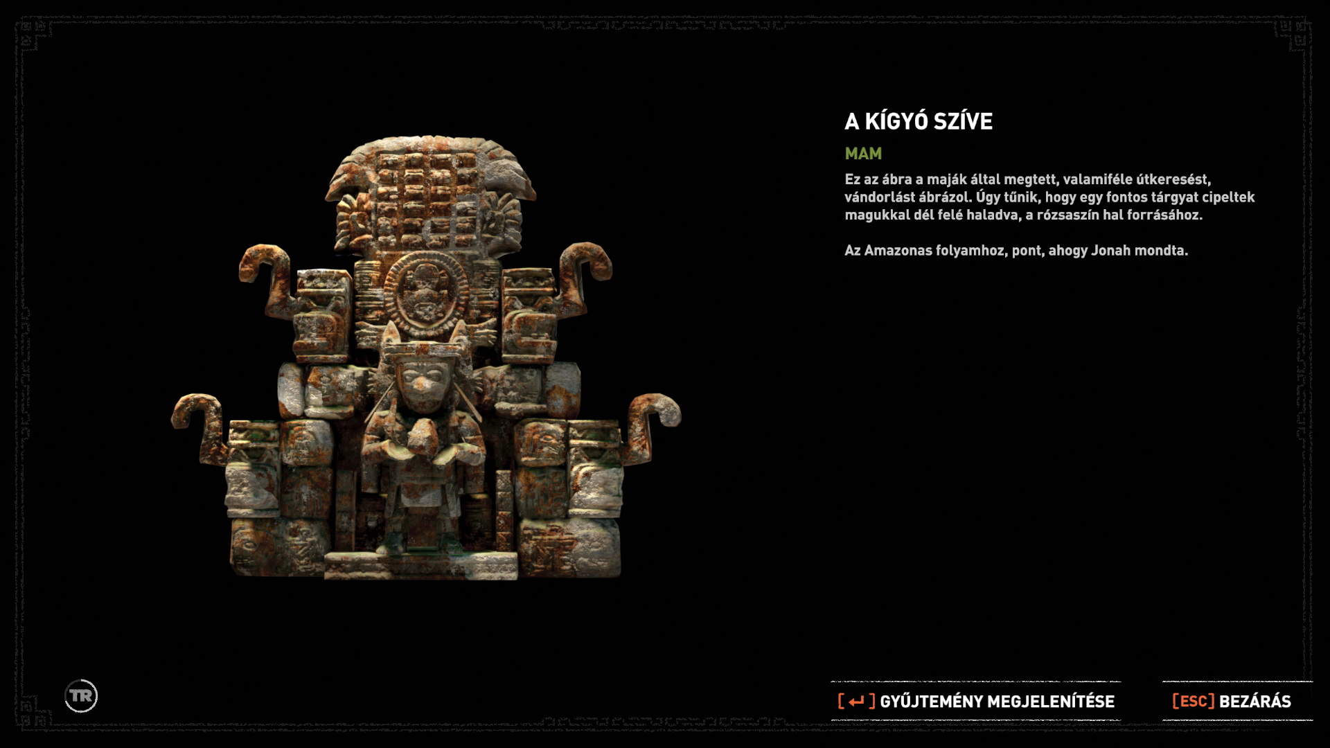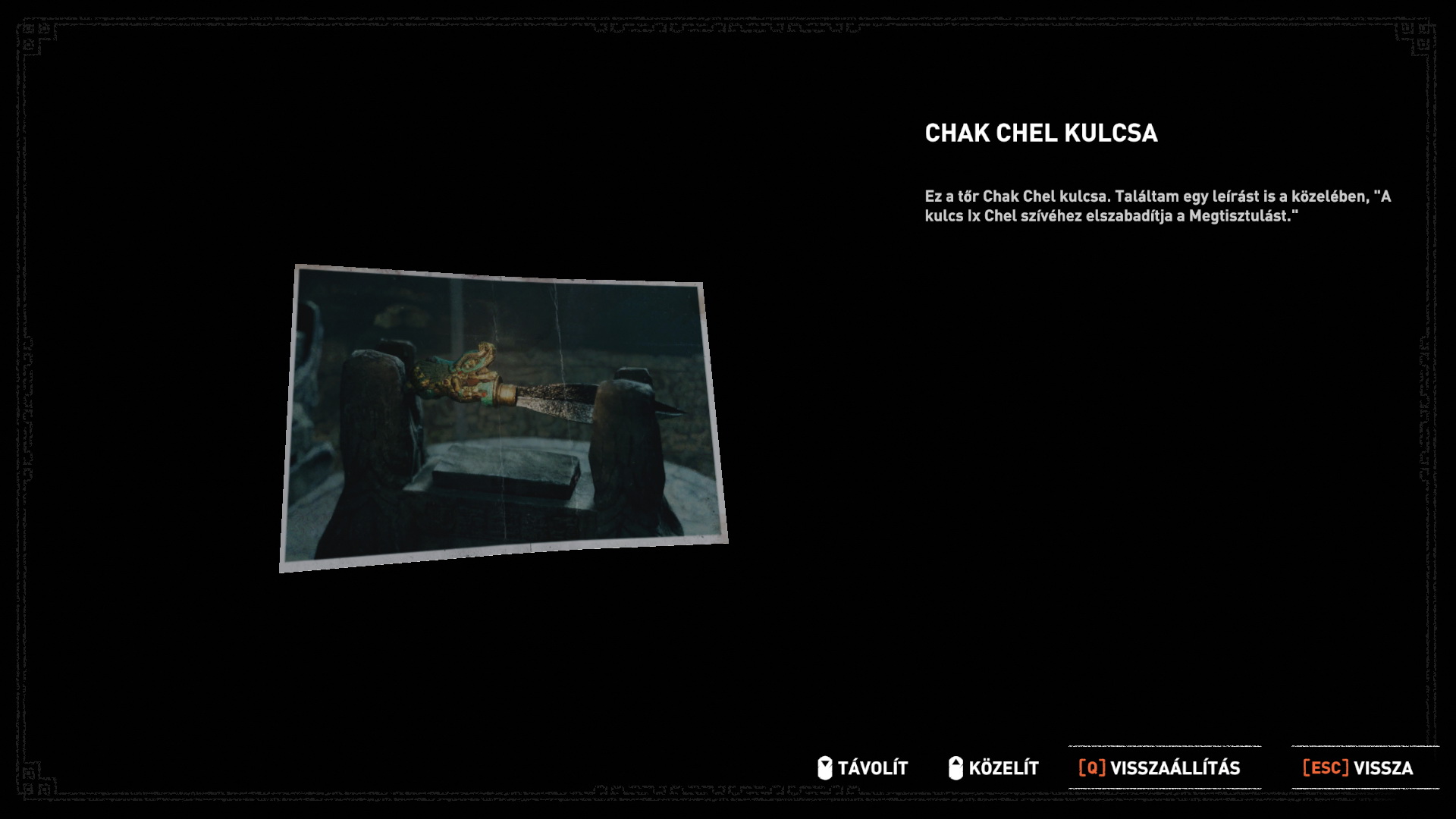 Menj, ugorj rá a kiszabadított liftre, onnan gyorsan a létrára, mássz fel, Menj fel a lépcsőn, ugrás fel az oszlopon, csimpizz jobbra a fali peremen, Majd a sziklán lemászva a kötéllel ereszkedj le a mélybe. Kis dumálás Jónással, a fali képek megnézése következik, majd a kövek elfordítása következik. Megjelenik a maja kés. Key of Chak Chel. Felvegyem? Ne vegyem? Felvettem.