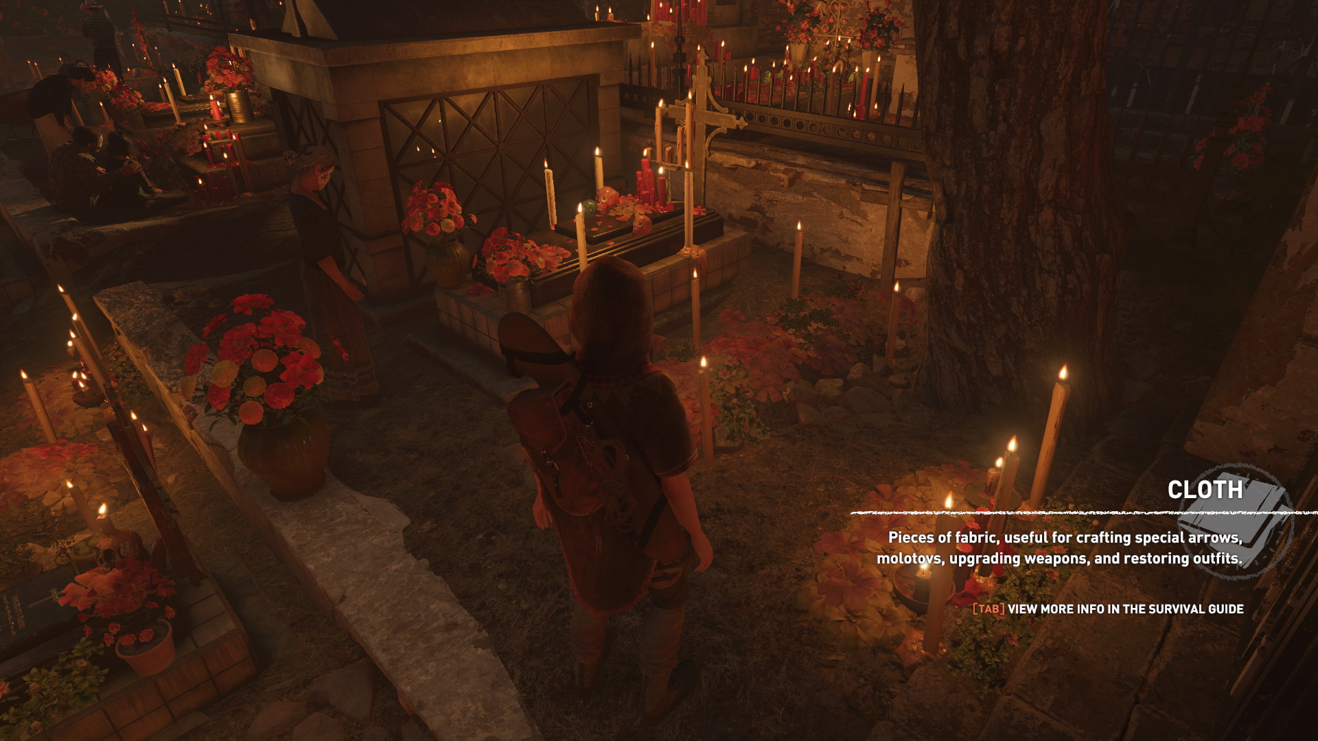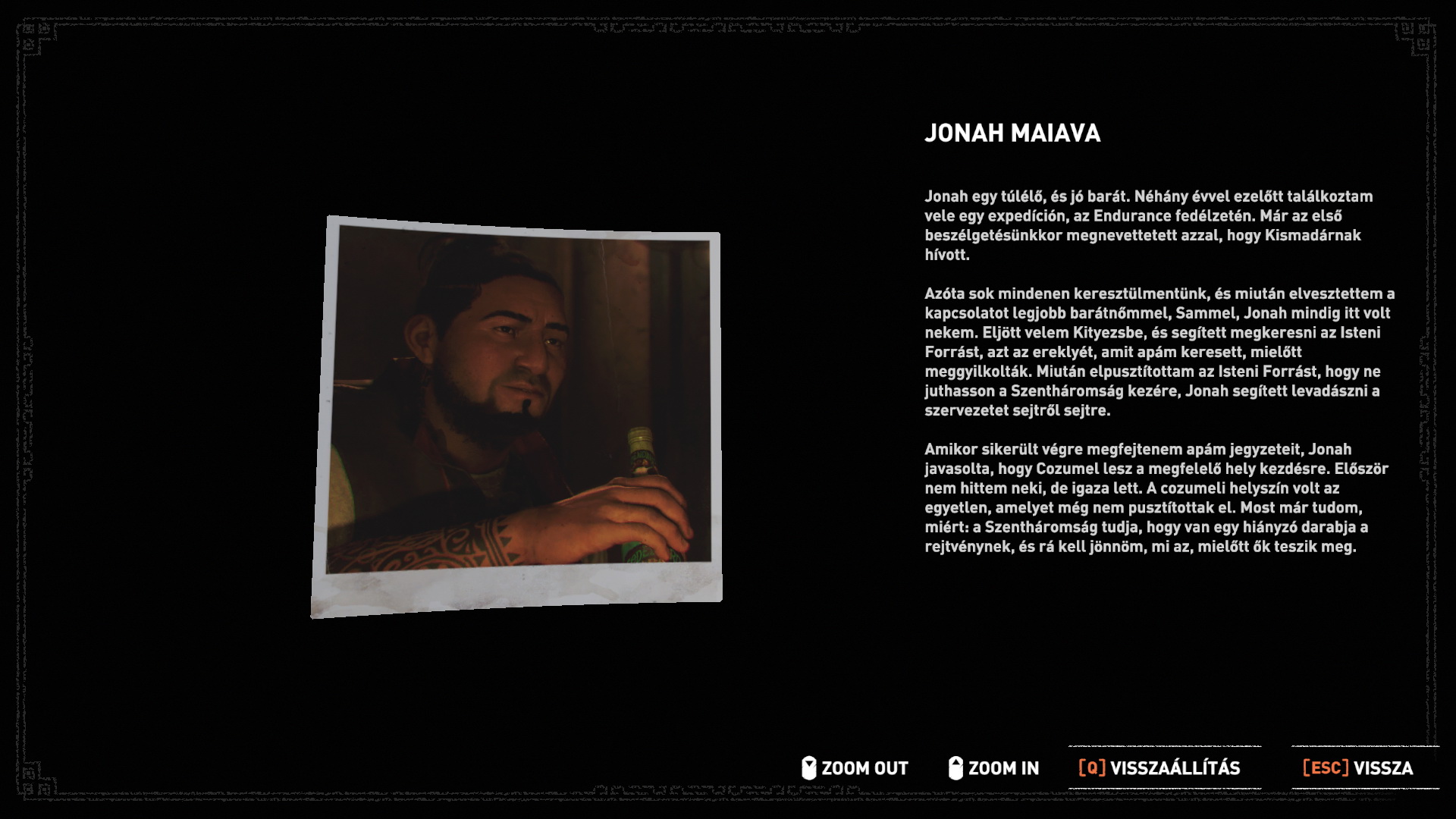 Te viszont addig átmászol a kerítésen. :) Menj tovább, le balra a lépcsőn, jobbra kis szövetdarabot találsz, majd egy kis kosárban gyógynövényeket, és a kriptánál átnyomakodva a tömegen úgyszintén. Észreveheted, hogy a Notebookba bekerült Jonah Maiava képe is.