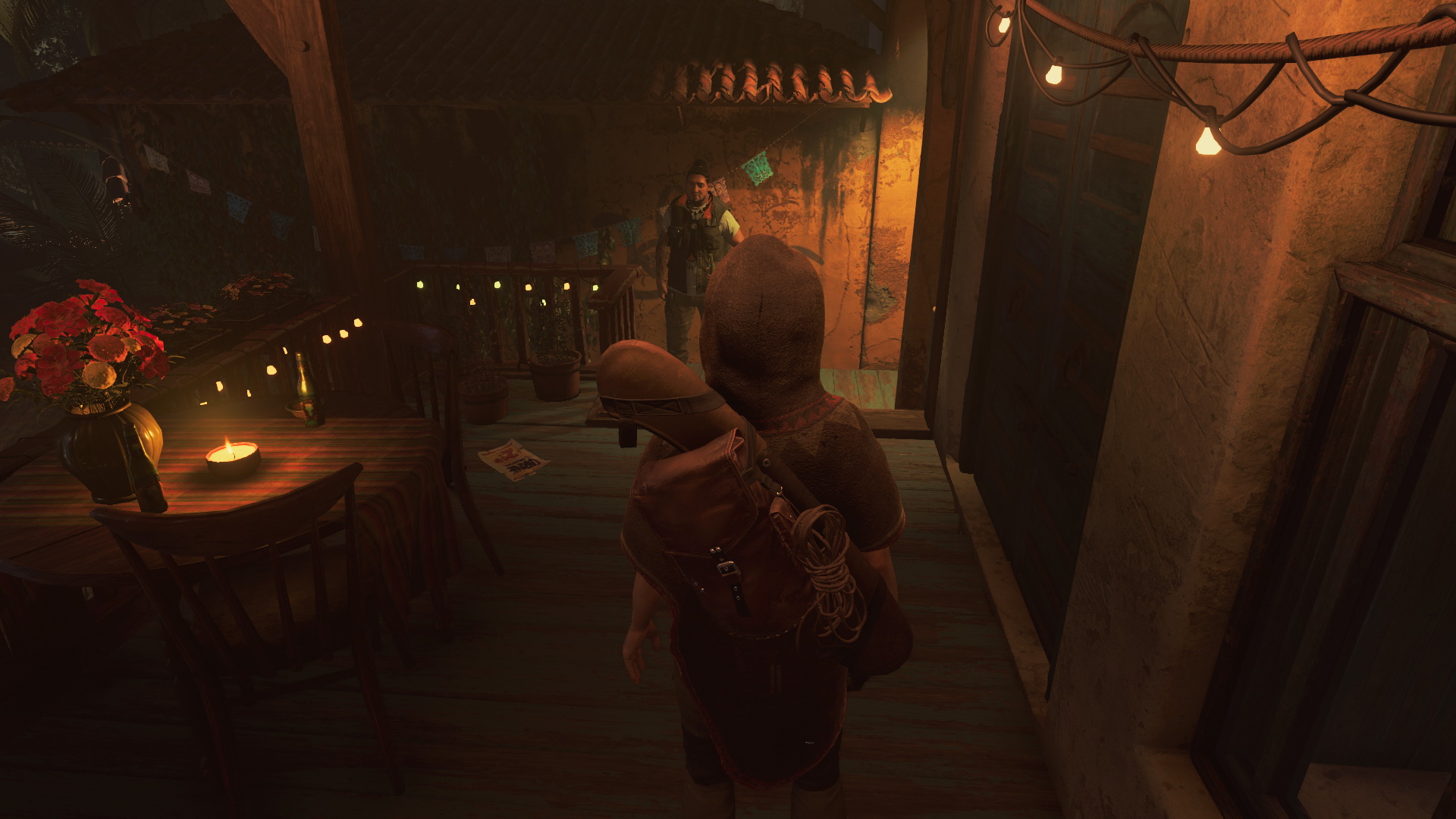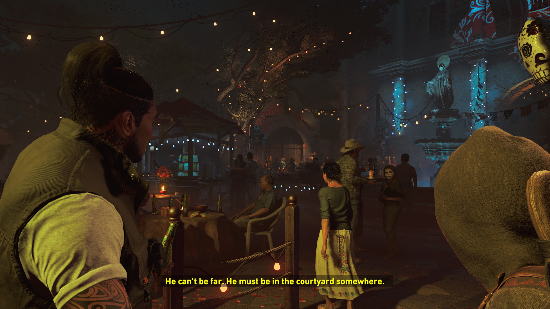 Nézz körül az utcabálban, ami a Holtak ünnepe, beszélgess, akivel lehet, vedd fel a zárt ajtó előtt a Medikit-et, majd a szökőkútnál balra menve egy kis erőforrást is felvehetsz. Jobbra menve Medicine-t vehetsz fel. Most a táncolók felé menj, dumálj kicsit a szökőkútnál, majd a nyakiban ülő gyerek mögött is találsz cuccot. A színpad mellett menj fel a lépcsőn, menj jobbra, és a folyosó végén vedd fel az XP-ket. Most menj a másik irányba, és a dumálás után menj ki innen, le a lépcsőn, menj jobbra, egy dobozban xp-t lelsz, majd a kapui felé menve fegyvereseket pillantasz meg. A barátod megpróbálja, hogy átengedjenek, de nem sikerül. Közben észreveheted, hogy az Inventory-ban 3 kép is megjelent, a Hidden City Riddle,a Hydra Constellation, és a Maya Date.