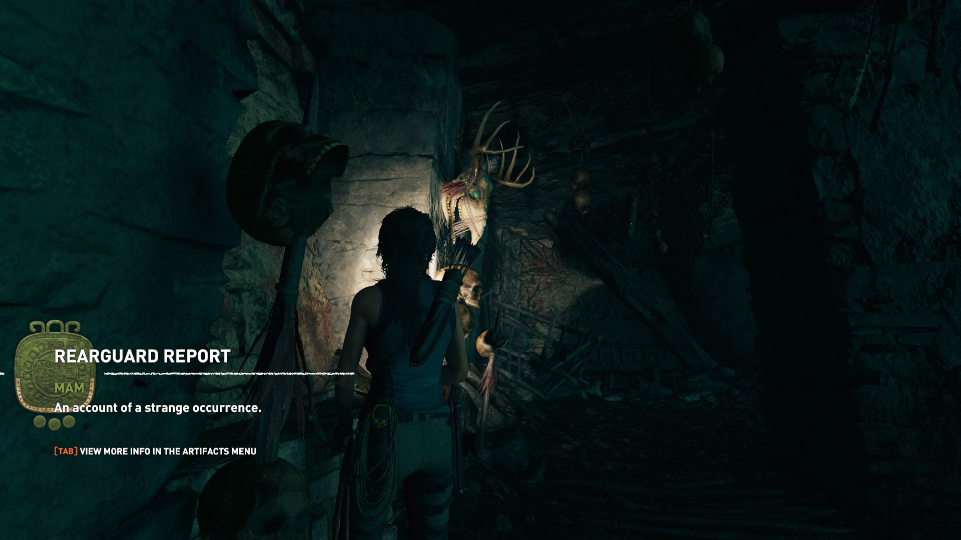 XP-t is kapsz, és a maja nyelvet is gyakorlod. És jobbra menve az újabb Murals-t, követ. A nyilat használva rántsd ki az útakadályt. Vágd el a földön a csapda aktiváló kötelét, osonj át alatta, és lődd le az 5-ből, az 1. lógó tárgyat, ami egy tradicionális mexikói hangszer, lefordítva Halálsíp. Ez a különleges feladat a pályán. Még négy ilyet találsz. Menj jobbra, lehajolva menj át a patkányok járta járaton, és egy emeletes terembe értél. Használd az AIM-ot ha be akarsz gyűjteni mindent, nem írom le , csak a fontosabbakat. Ahol villog a föld, xp-t bányászhatsz ki magadnak,3/1. A túloldalon kapaszkodj fel az emeletre az egyik oszlopon, És a rúdnál nézz a túloldalra, és lődd le a 2. Halálsíp-ot. Ugorj is át oda, és balra menve felveheted az 1.relikviát