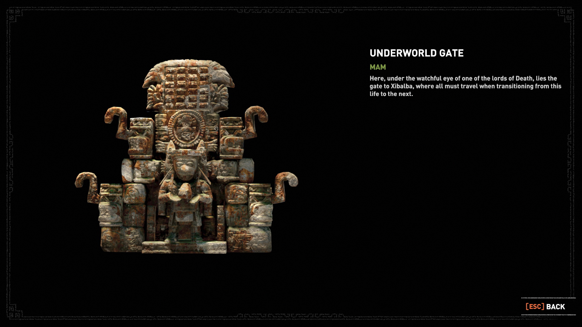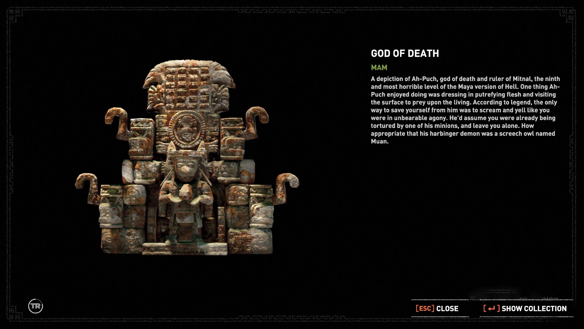 Kötéllel jutnál át a túloldalra, de beleesel a vízbe. Szedj össze, amit lehet, majd kimászva a vízből, a lépcső mellett balra megtalálod az 6. Faliképet, szobrot, a Halál Istene-t.