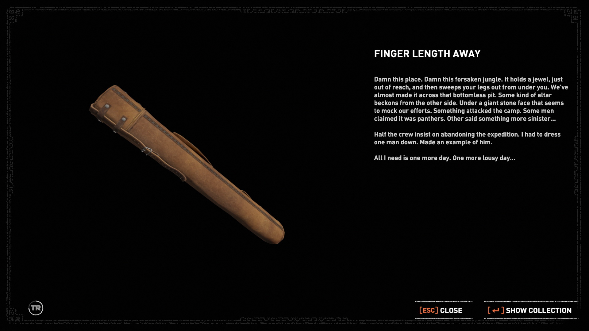 Ugrás fel, a falon, a hídról ugrás a sziklára, mássz le, ereszkedj le a kötélen, és ugrás belengetve a kötelet az alsó részre. Bányász egy kis aranyat a sziklából, kint mássz fel a fára, a köteles csáklya segítségével juss át a túloldalra, és bemenve a barlangba, jobbra megtaláltad a 9. dokumentumot, a Finger Length Away-t. AQ folyosó végén, XP-t áshatsz ki 9/8 magadnak. /