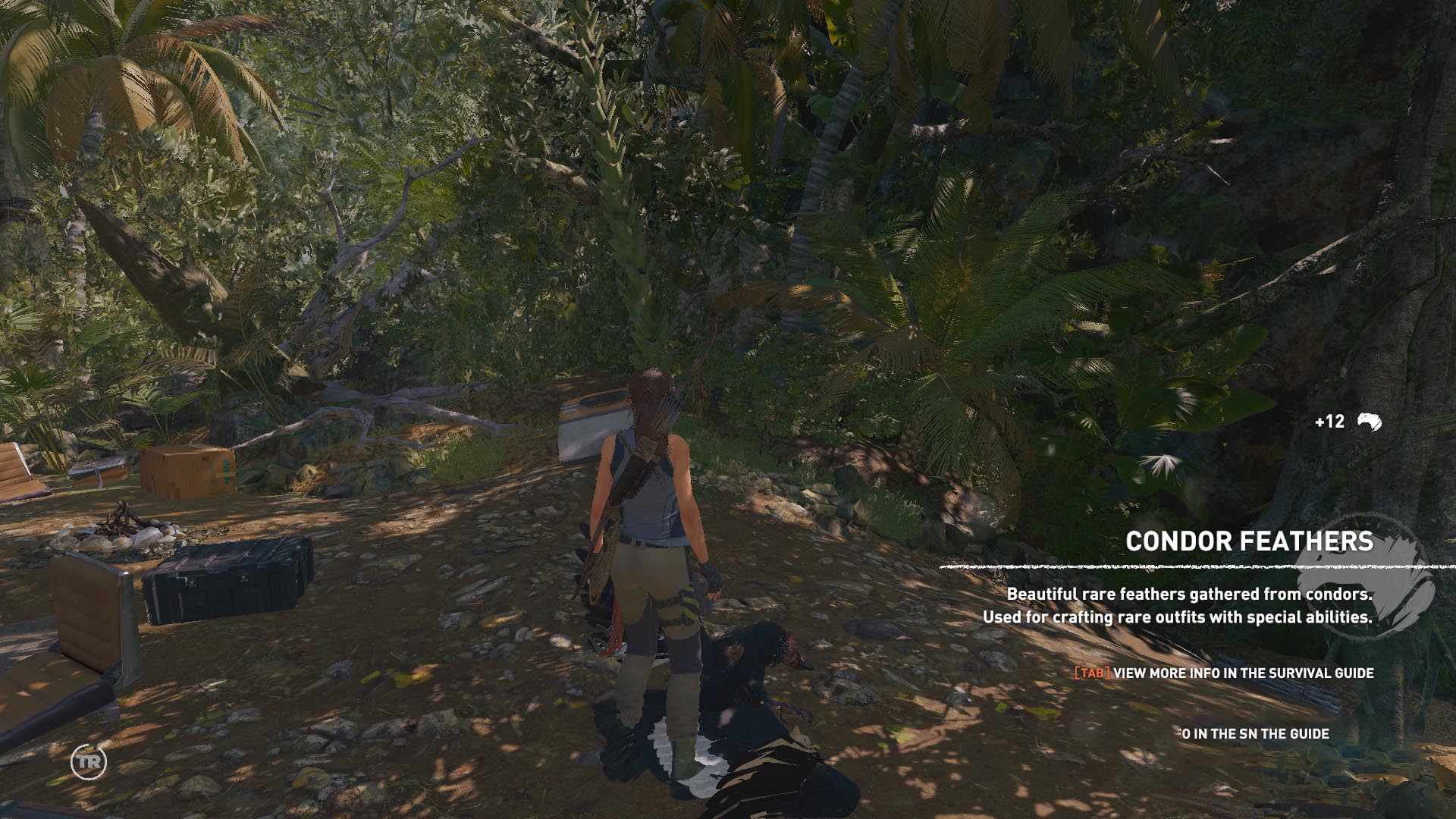 Menj vissza a tábortűzhöz, javítsd meg a késedet, élezd meg, nem messze onnan, vágd el a kötelet, majd felmászva egy sziklára a másodikat is. lent a sárga ládák mellett, egy szürke ládából kiveheted az Íjat, és egy Adóvevőt. Most már figyelj a magasba, le kell lőnöd 4 tollas zsákot, hogy teljesítsd a második kihívást. Az 1. tollaszsák 4/1 mindjárt ott van, fent a magasban. Most már állatokra is vadászhatsz. A szakadék szélén álló, köteles oszlopnál jobbra menve megtalálod a 2. tollaszsák 4/2. A repülőgép szárnyánál van a 3. tollaszsák 4/3. Egy sziklán felkapaszkodva egy barlangba mehetsz be. Rántsd ki az akadályt egy köteles nyíllal, menj tovább, óvatosan menj át a csapdán, és a kapcsolót benyomva nyisd meg az első átjárót. Menj lefelé, vágd el a kötelet, bújj át a csapda alatt, és balra egy beugróban megszerezted a 3. dokumentumot, a Jack 2. folyóiratát. Továbbmenve megnézheted az 1. fali képet, Urqu-t a cserkészt. Lecsúszol, és egy kriptából egy sztárcsizmát emelhetsz ki.