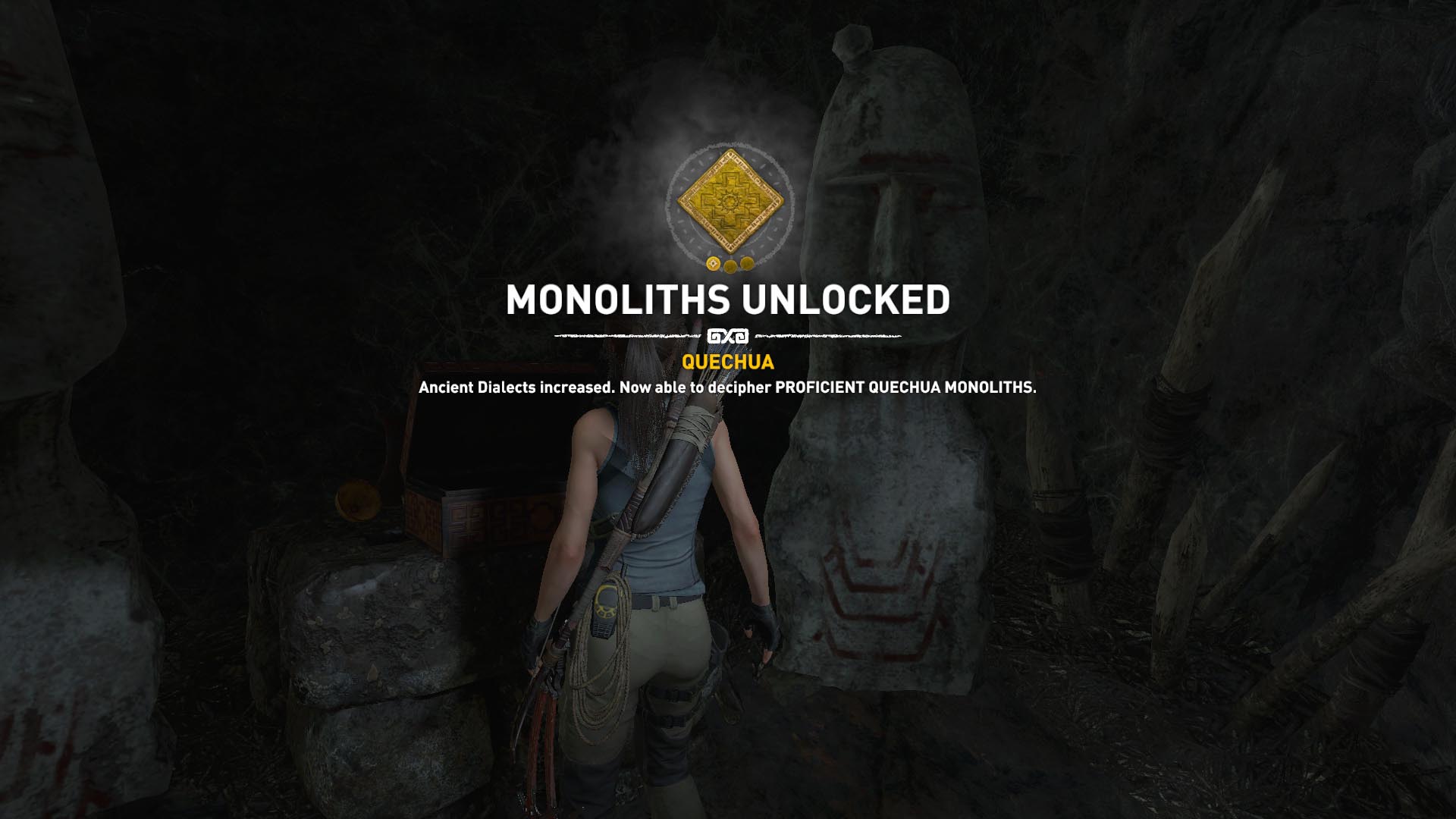 Köteles nyíllal rántsd ki az útakadályt, balra vágd el a csapda kötelét, majd egy kis ládikából kiveheted a 5. relikviát, a hosszúkás koponyát. Kinyitottad a monolitot. Juss át az alacsony átjárón, a kapcsolóval nyisd ki az átjárón, de ne arra menj, a másik irányban is van egy, azt nyisd ki, azon folytasd az utadat. A túloldalon tudsz felmászni a szélső oszlopra, majd a középsőn kapaszkodj feljebb, végül a másik szélsőn jutsz fel. Menj a folyosón, ugord át a csapdát, vágd el a másik csapda kötelét, juss át rajta, és a kapcsolót benyomva nyisd ki a kaput.