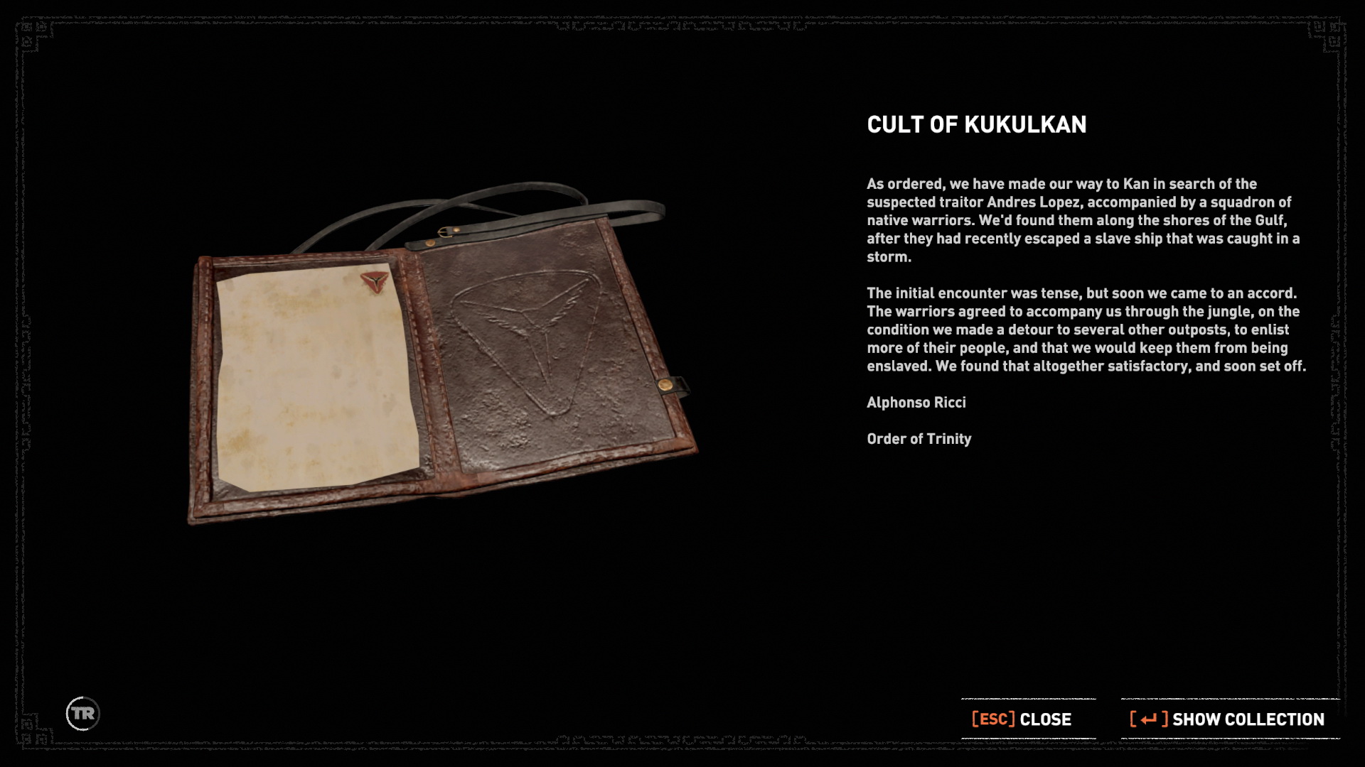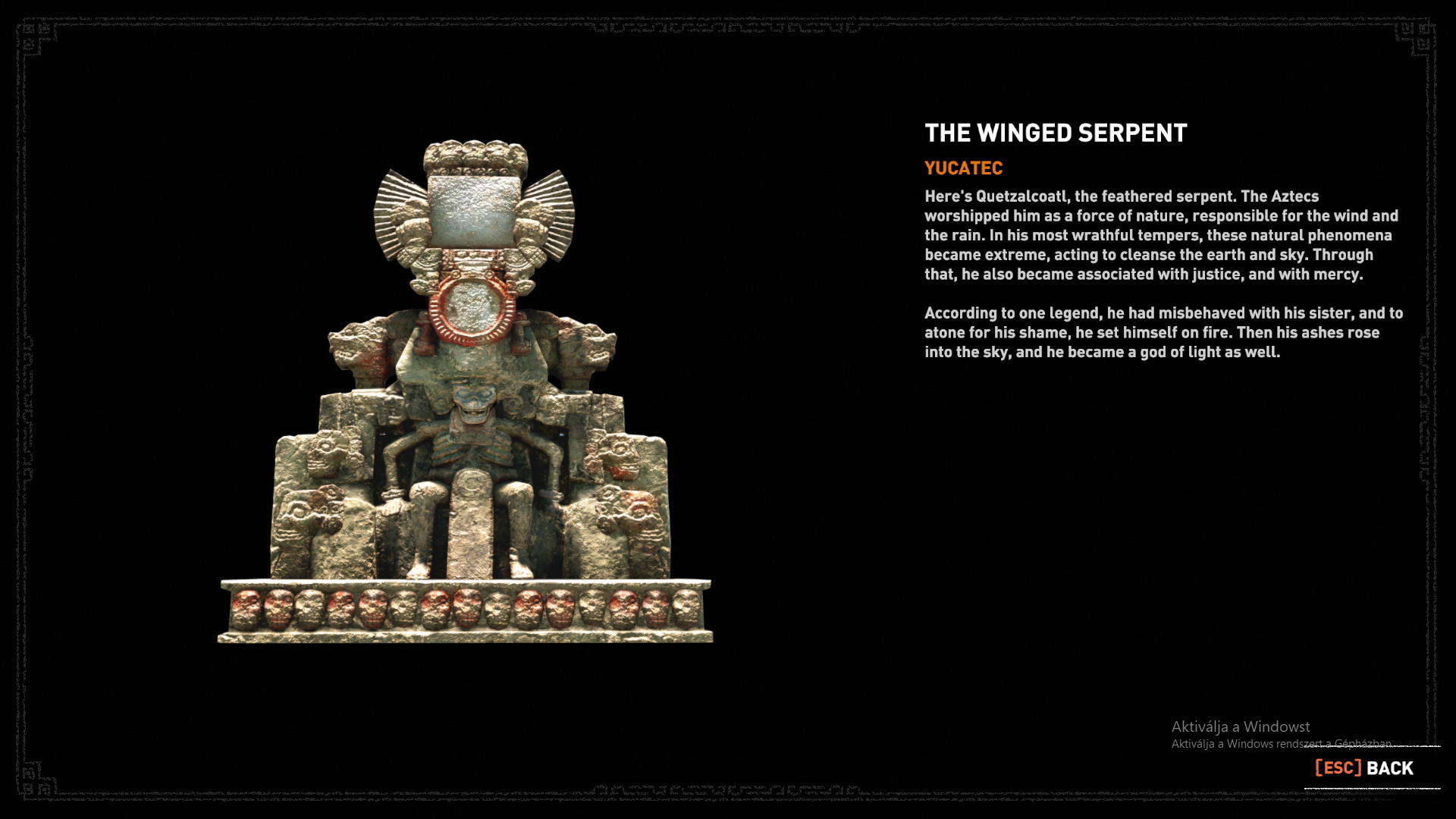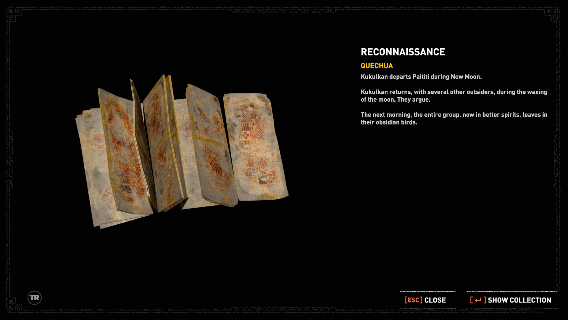 Kapaszkodj jobbra, majd fel, és amikor odaér a harcos, rántsd a mélybe. felmászva menj balra, majd kötéllel kapd el a jobb oldali sziklafalat, mássz fel, kapaszkodj balra, majd felfelé, és itt is rántsd a mélybe az egyik harcost. A másikkal és a következővel is barátnőd végez. Te menj fel a lépcsőn, át a függőhídon, és bemenve az épületbe jobbra meg is találod a 39. dokumentumot, a Cult of Kukulkan-t. 42/39
