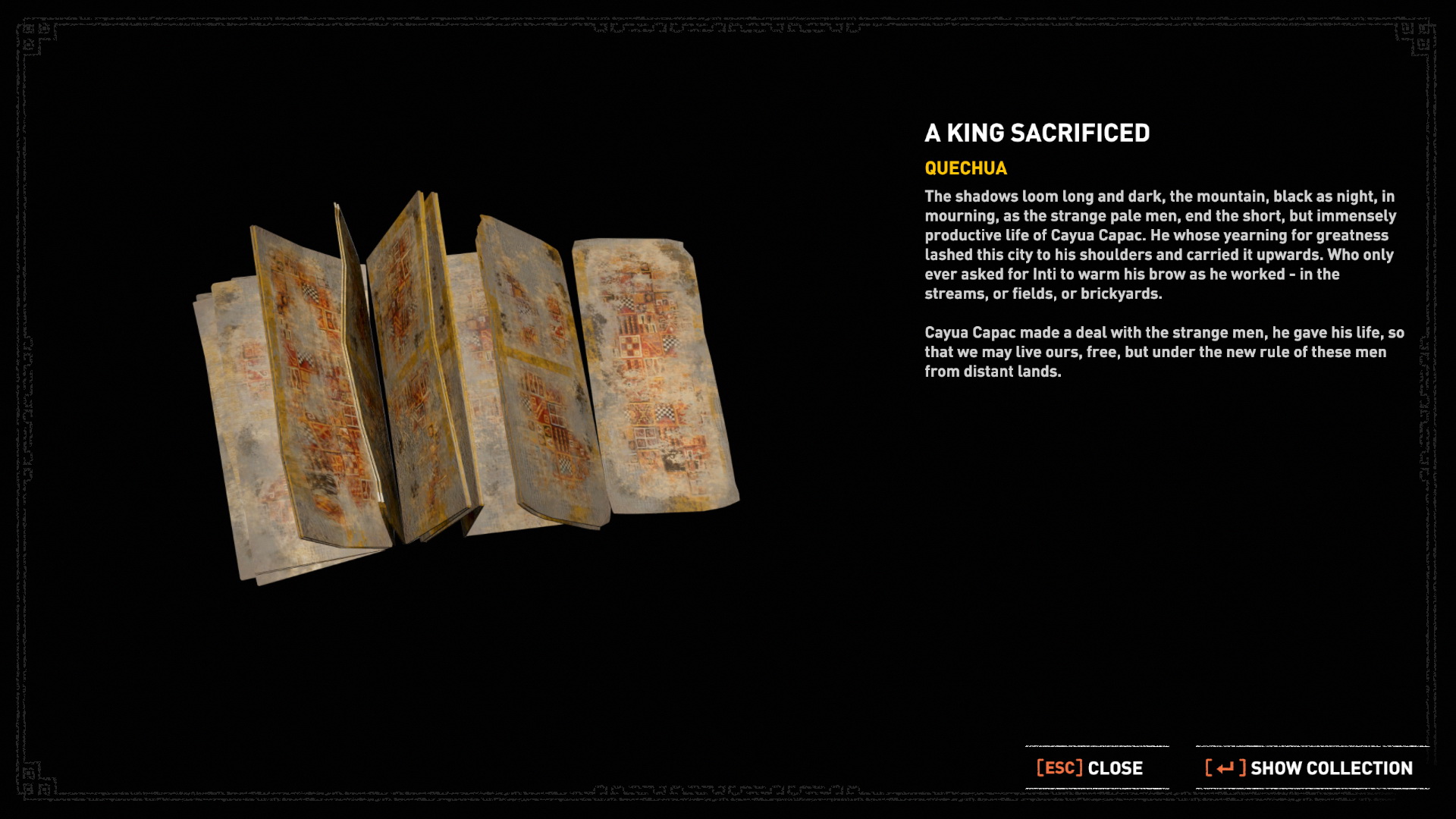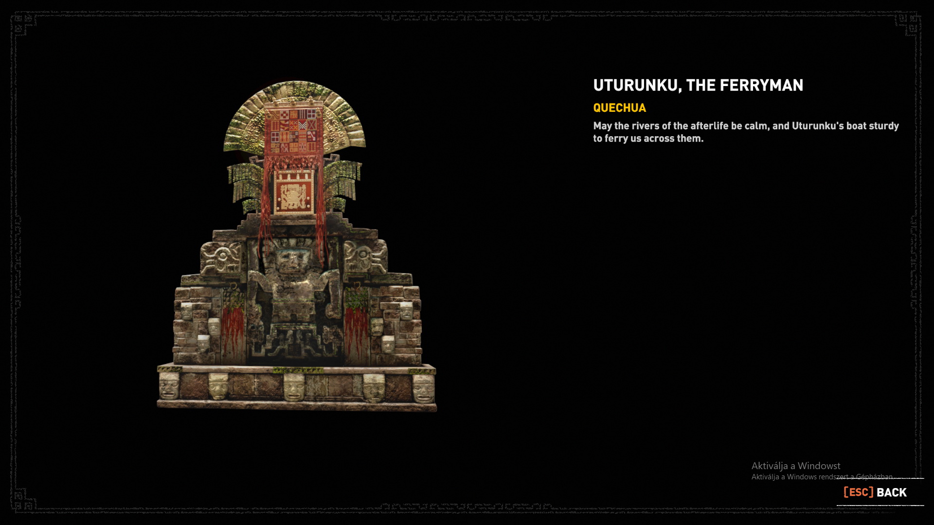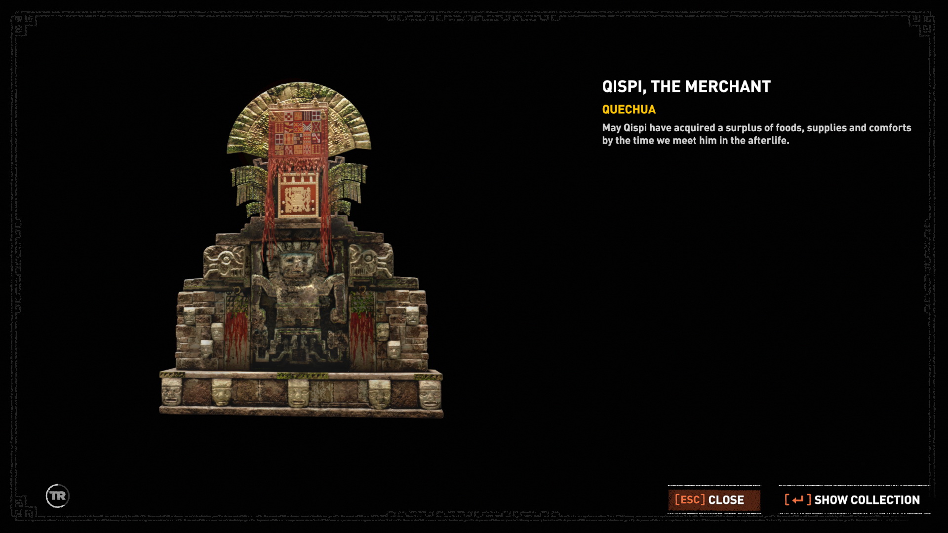 Táborok: 11 Quipu Overlook, Village Caves, Temple Path, Temple of the Sun, Temple District, Wild Jungle, Ossuary, Paititi Market, Unuratu’s Home, Fishing District, Abandoned Village,