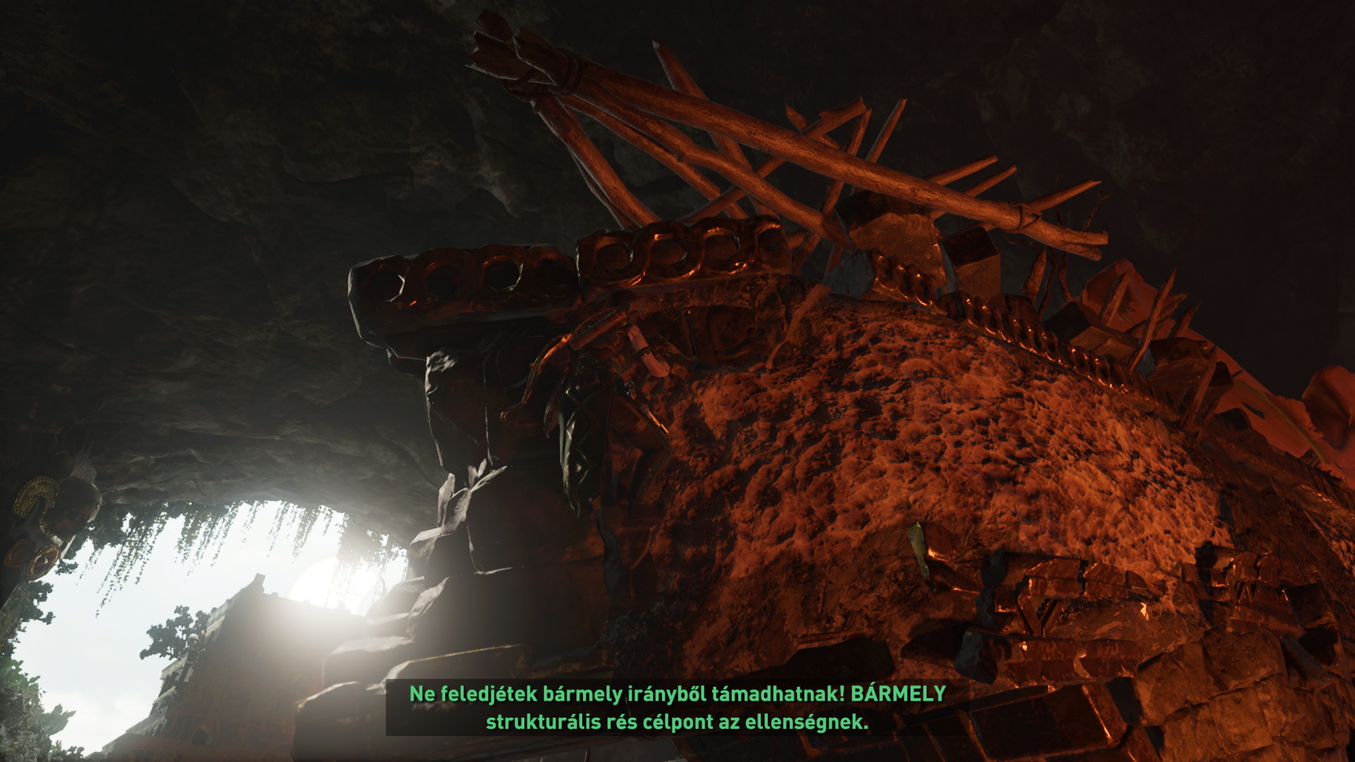 Miközben lő a helikopter, mássz jobbra, majd felfelé, fel a botokból kreált részen. Felérve menj a, kerek ajtó felé, az elgördül előtted