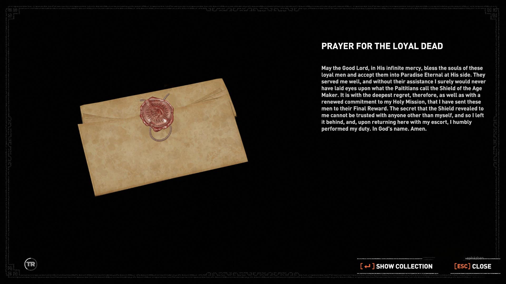 Ugrás fel a falon, majd a gerendákról ugrás a szemközti sziklafalra. Jobbra mássz, majd ugrás a jobb oldali sziklafalra. Ereszkedj le a kötéllel, lendítsd be, és ugrás a falhoz, elkapva a peremét. Mássz fel, mássz fel a falon is, és ugrás a szemközti falra is, elkapva a permet. csimpzz balra, ugrás balra, a sziklafalra, és ereszkedj le a kötélen. lengesd be magadat, és ugrás balra a romos falat elkapva. Csimpizz balra, majd fel a sziklafalra, ott is balra kapaszkodj, majd ugorj balra, a másik sziklafalra. Mássz fel a kötélen, menj át a boltív alatt, és ess le az alsó ösvényre. Szedj össze mindent, itt találod a 1. Dokumentumot is, a Prayer for the Loyal Dead-ot 4/1.