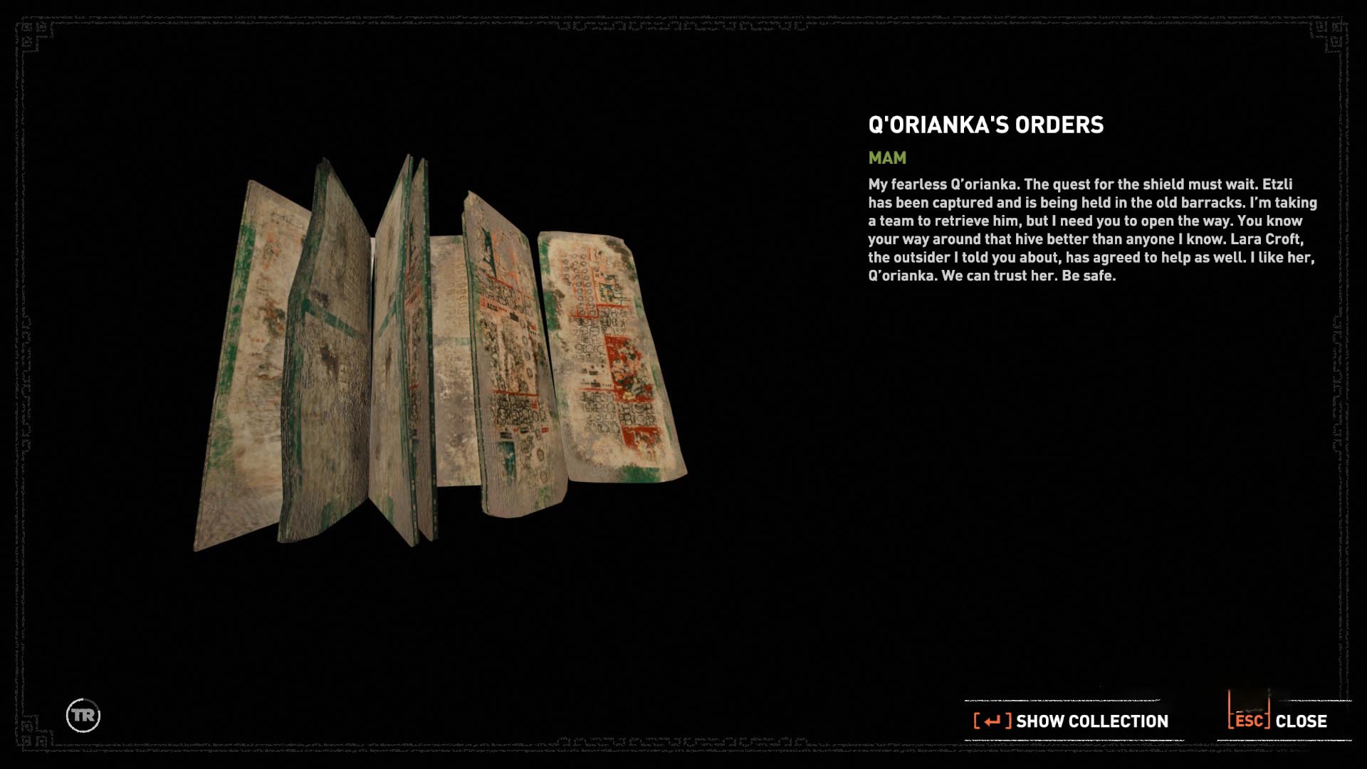 Ess le a kis szökőkúthoz, menj jobbra még lejjebb, és az árkádok alatt jobbra, megtalálod a 3. Dokumentumot. Q'Orianka's Orders