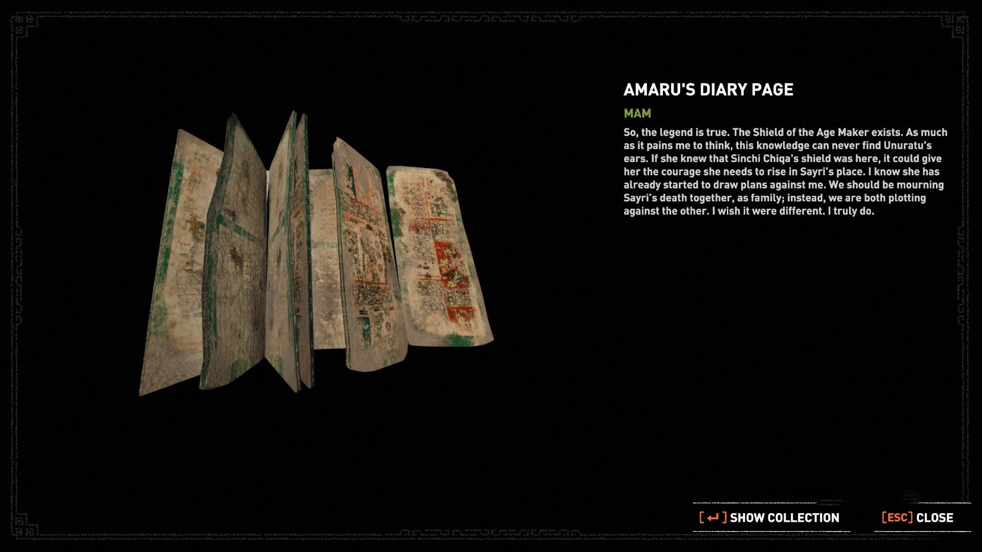 Felvéve a kis pajzsot, hátul a barlangban újabb célpontok jelennek meg. Végezz azokkal is, majd visszamenve ahol a relikviát találtad, oldalt megleled a 4. Dokumentumot. Amaru' Diary Page