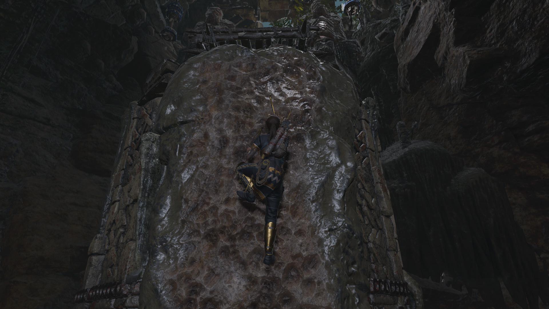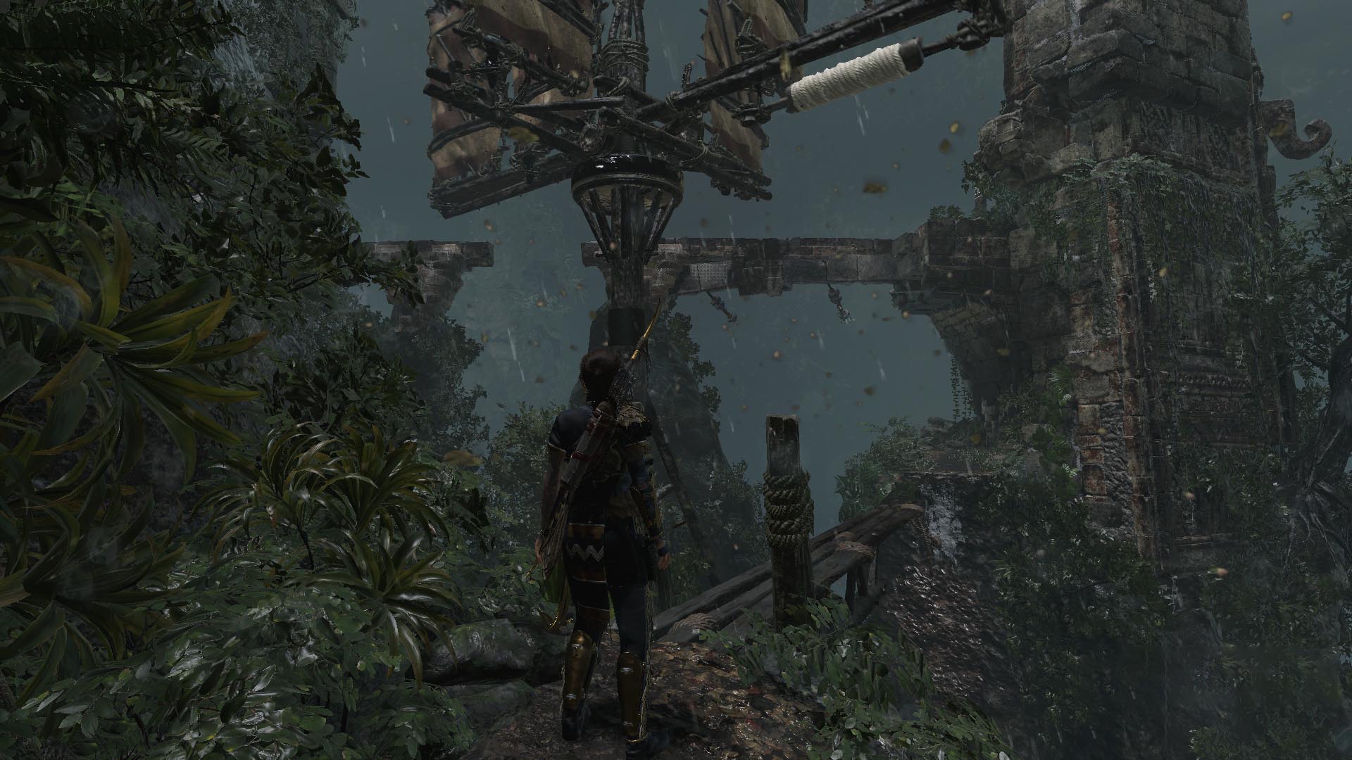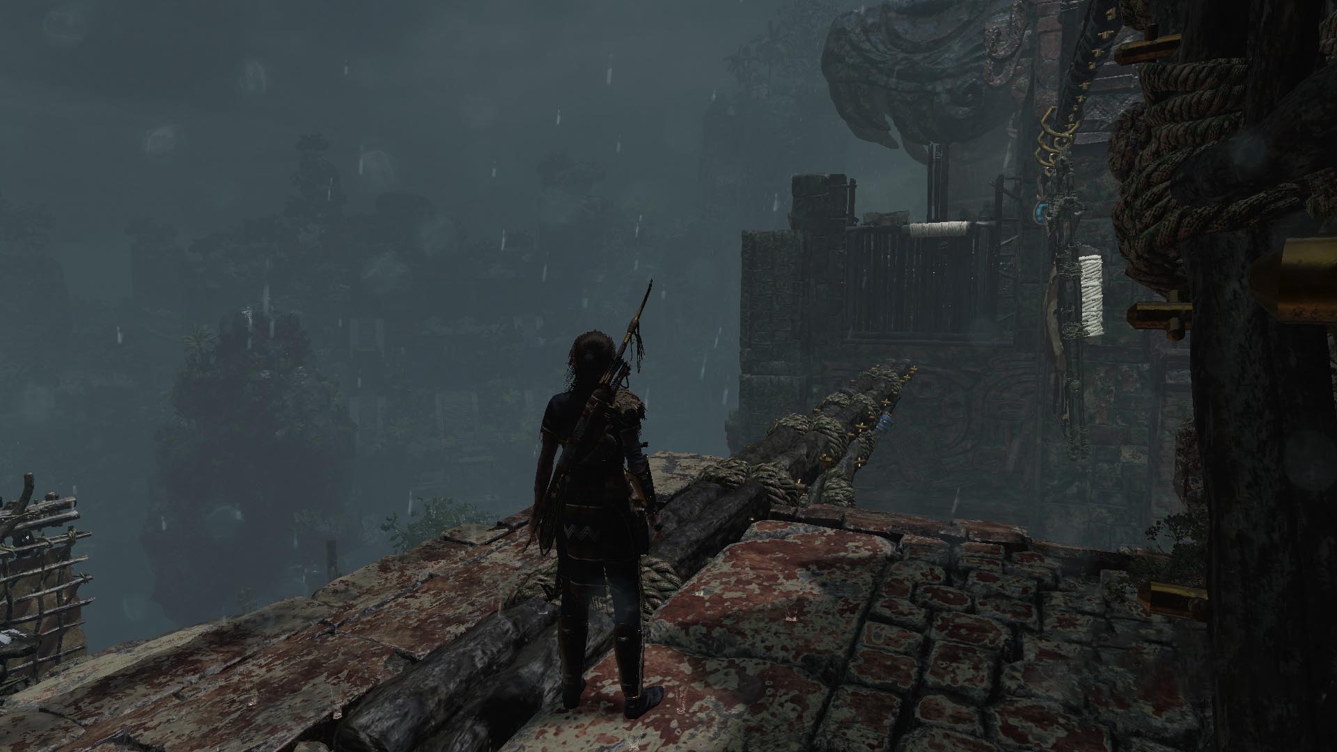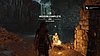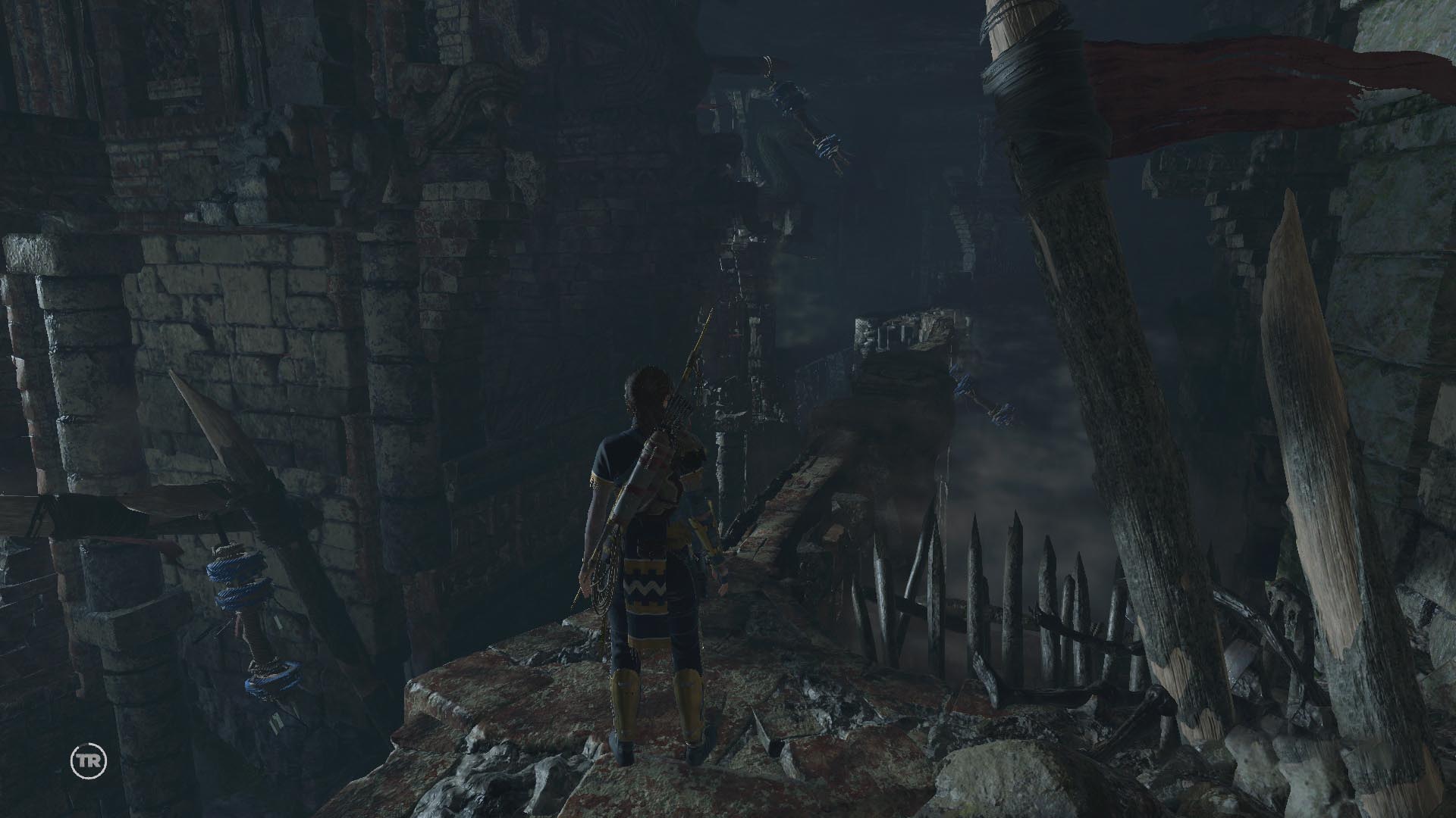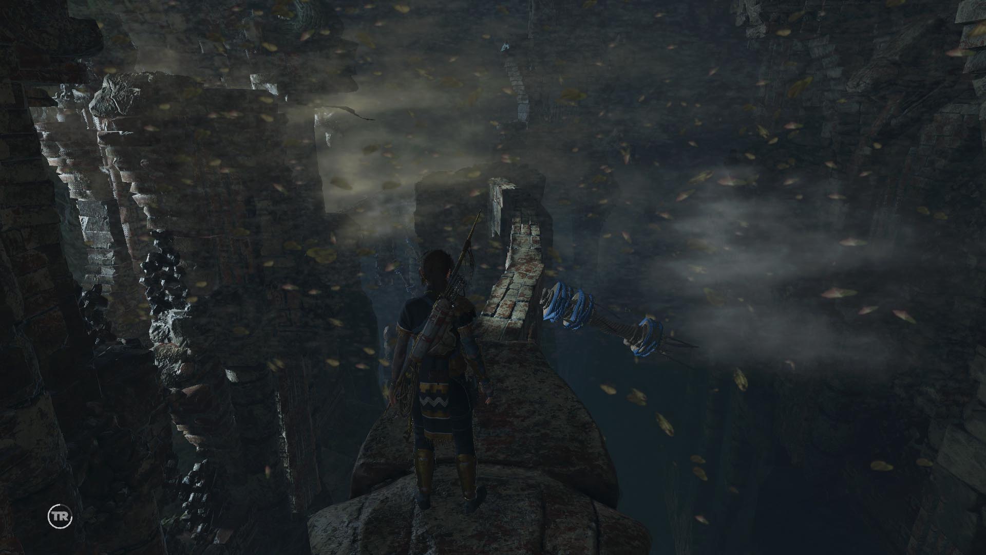 Továbbmenve ugorj át a törött hídon, majd a gerendákon, a végén balra menj. Vedd elő az íjat, és köteles nyíllal ránts egyet a balra látható köteles gerendán. menj tovább óvatosan a következő gerendán, majd köteles ugrással jutsz tovább. Ugrás a sziklafalra, és ereszkedj le a kötéllel. Ess le a romokhoz, köteles ugrással kapd el a sziklafalat, majd balra fordulva két köteles ugrással jutsz el a messzi sziklafalra. Mássz fel, menj körbe a keskeny ösvényen, lőj egy kötelet, a szélfogóra, és kösd a tekerőhöz. tekerj rajta négyet, és menj át óvatosan a gerendán, nehogy a szél lefújjon.