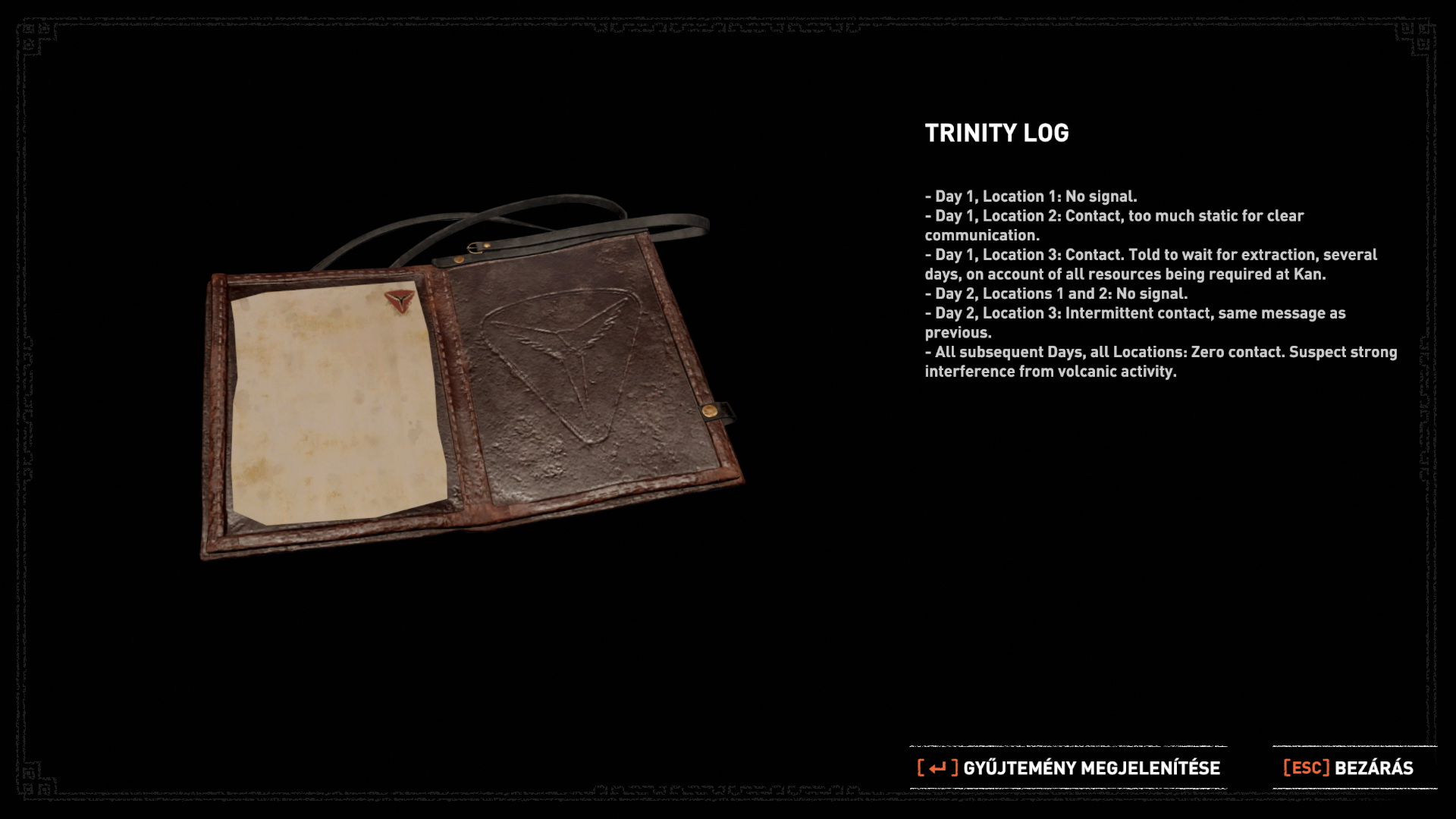 Menj vissza, és fel a szemközti falon, és egy asztalkán megtalálod az 1. dokumentumot, a Trinity Log-ot. ![]()