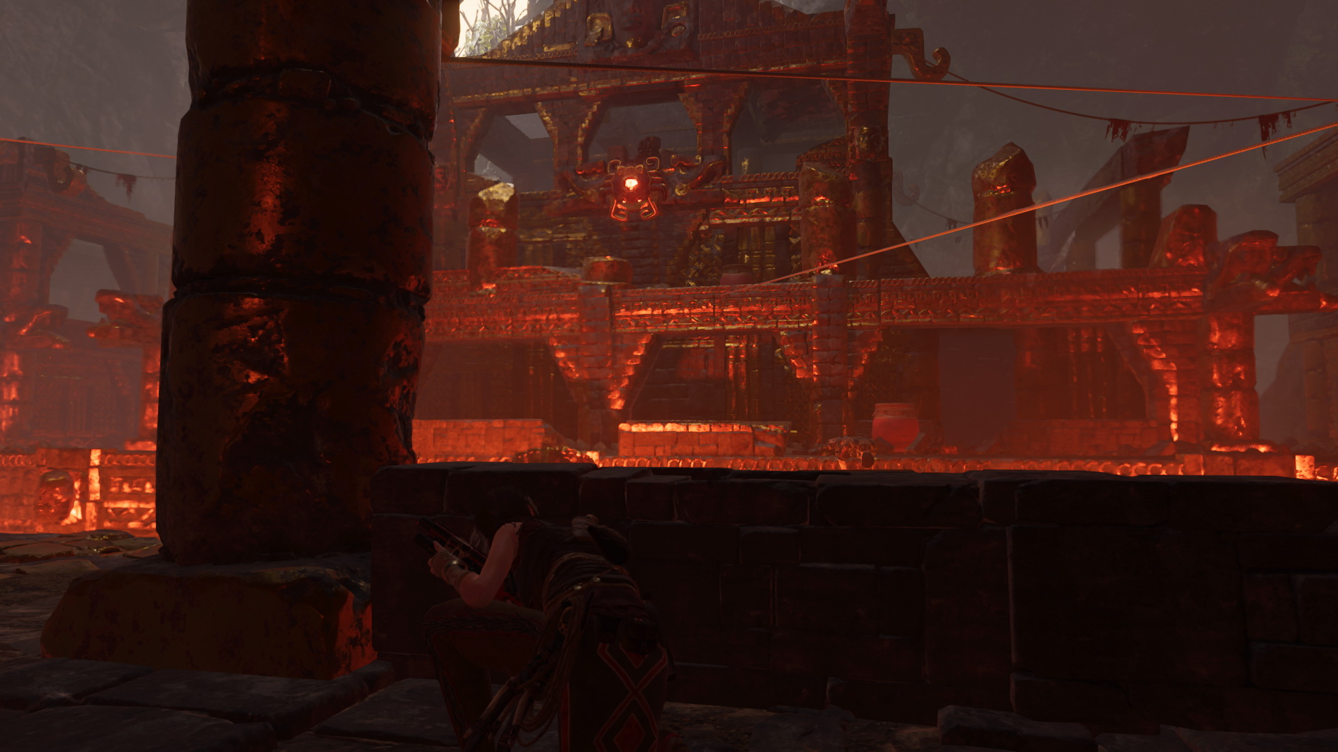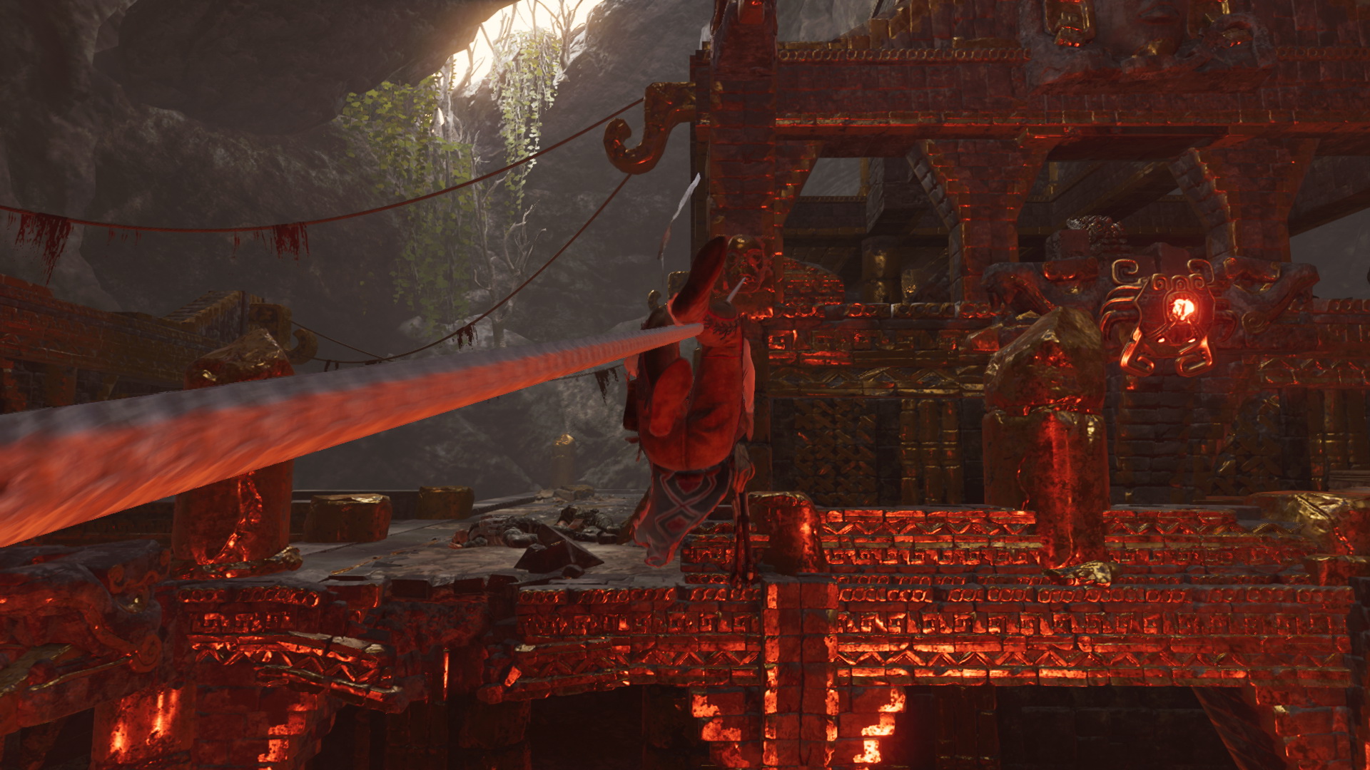 Menj kiscit vissza, az épületben jobbra, és ugrás az első liftre. Fordulj meg, és kösd össze a két köteles részt. Köteles ugrással juss el a másiik liftre, és onnan tovább a tűzfújóhoz. Itt is rántsd le a köteles kapcsolót, és rohanás, majd jobbra a következő tűzfújóhoz. Rántsd le ott is a kapcsolót, majd ugrás a kapcsoló baloldalára, a fali peremet elkapva.- Balra csimpizz, majd ugrás a fali rúdon át, le a platformra, ahol jobbra menve megtolhatod a következő kapcsolót, és a szobor ismét elfordul balra, és ismét emelkedik közben. De ez még mindig nem elég.