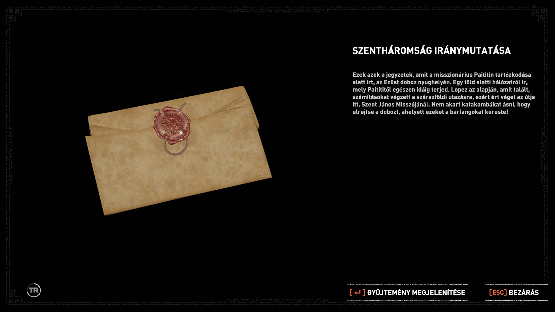 Menj át a csapda alatt, majd menj végig a tüskés csapdán is, ahol szabad az út. Menj jobbra, fel a sziklán, ugorj át a leszakadt részen, majd ugrás a sziklafalra. kapaszkodj jobbra, ugrás jobbra, a másik sziklafalra, ereszkedj le a kötélen, és belengetve, a falon futva, ugrás az ösvényre. a tűz mellett megtalálod az 1. Dokumentumot, Szentháromság Iránymutatása.