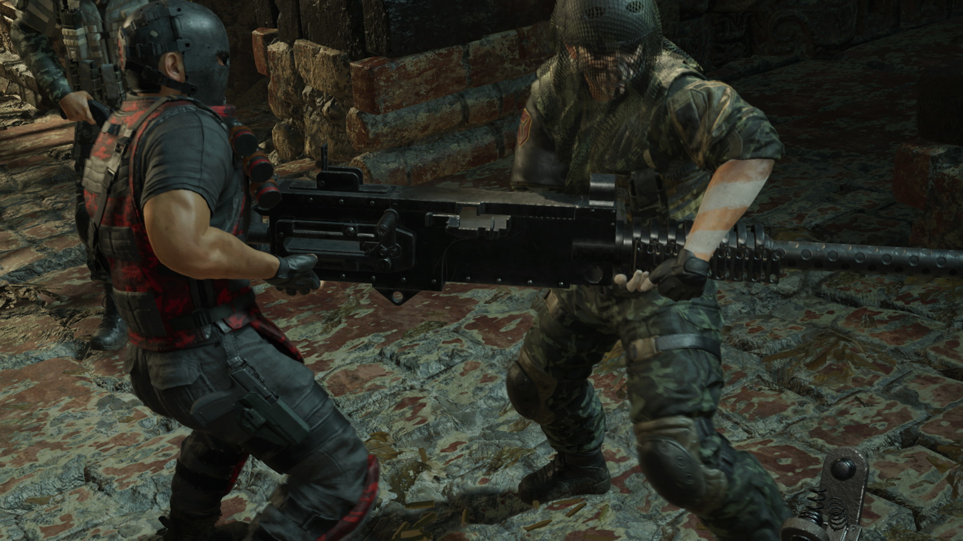A géppuskát nem tudod kilőni, tehát végezz, akivel a közelben csak tudsz, majd haladj balra, felhasználva a fedezékeket. Az épületben is van bőven fegyveres, de piros hordó is, amiket felrobbantva könnyebben végezhetsz a fickókkal. A folyosó végén jobbra menj, és újabb akadályt kell szétlőnöd a puskáddal. menj tovább, nyírd a fegyvereseket, a géppuska előtt osonj át a túloldalra a fedezéket kihasználva. Újabb fegyveresek zaklatnak, majd ugrás fel a kis faldarabon. Fent is végezz a fickókkal, majd balra mássz fel a magas falon. Menj át a letört oszlopon, ugrás a falra, kapaszkodj jobbra, és mássz fel a kis folyosóra. A túloldalon ess le az alattad levő géppuskafészekbe, és végezz a fickókkal.