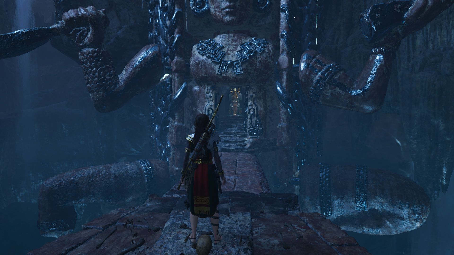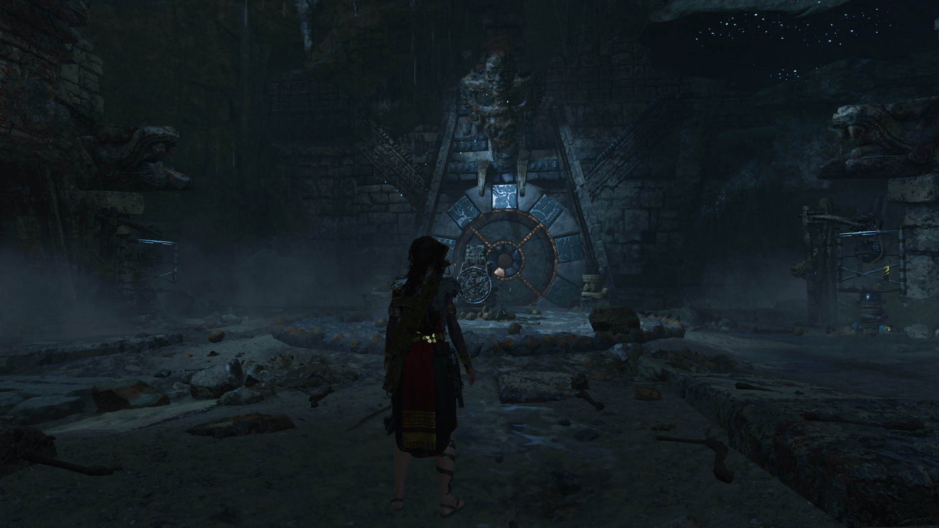 Ugrás vissza a kötéllel a sziklaoszlopra, majd jobbra menj, újabb köteles ugrással, és kapd el a sziklafalat. Jobbra kapd el a fali peremet, majd a következő sziklafalon ereszkedj le a mélybe, ess le a barlangba. Menj a kerek kapuhoz, és nyisd ki. Egy terembe értél, nevezzük ezt most el a főteremnek egyelőre.