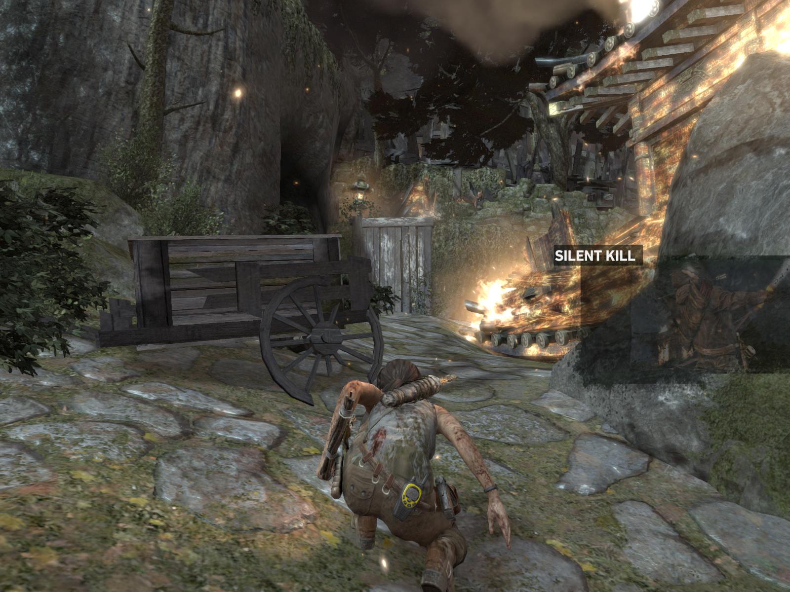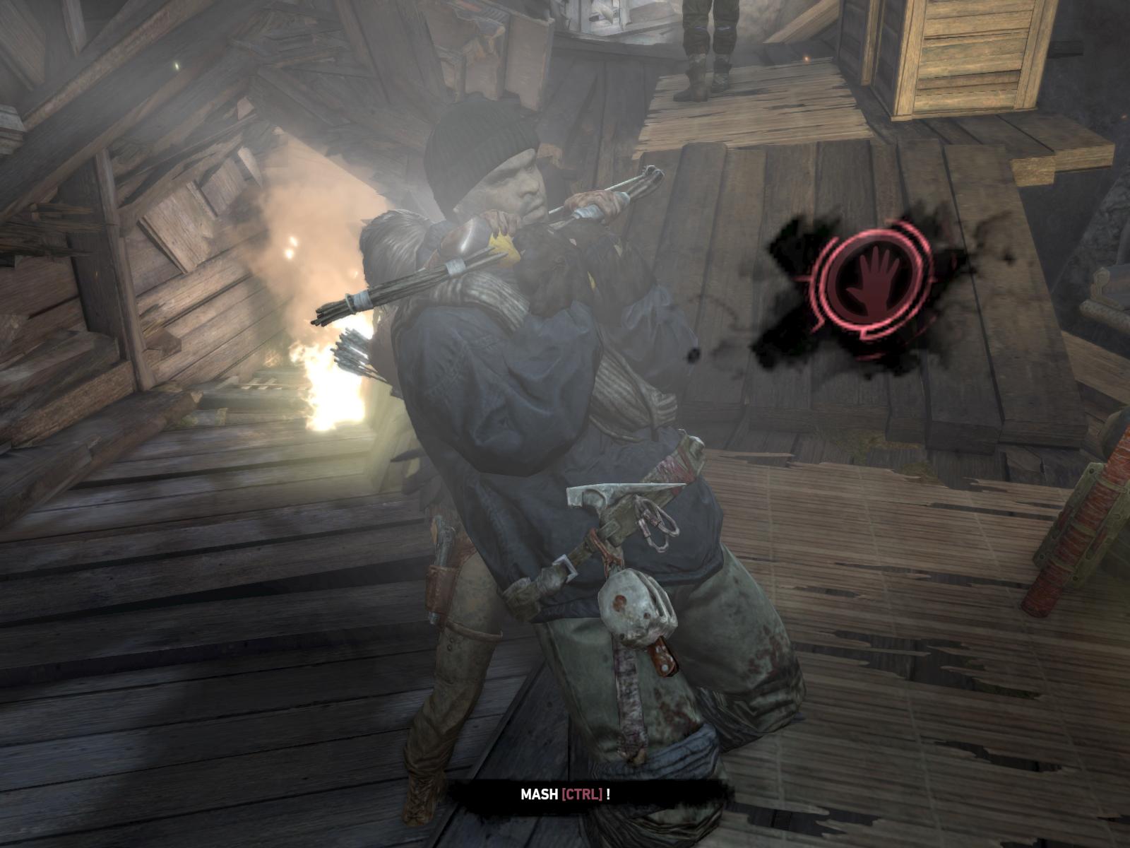 Menj tovább felfelé. Pisztolyod már van. De két ellenség is megjelenik. Elbújsz egy láda mögé. Szerencsére egy hulla mellett észreveszel egy tárat. Betöltöd, majd felállsz. Lődd le mindkettőt, lehetőleg fejbe. Ha sikerült, már van lőszered is, begyűjthetsz tőlük mindent. De ég minden körülötted, feszítsd ki az ajtót, nyomogatva gyorsan a feladatgombot. Beérve a házikó is kigyullad, Irány hát tovább. Ugord át a leszakadt kis hidat, majd felfelé menj az ösvényen. Most már kutass ki minden ládikát. Kapsz nyílvesszőt is, így már azt is használhatod. Elérsz egy magas kötéllétrához. Végezz a fickókkal, és azzal is, ami fentről akar lejönni a létrán. Itt is gyújts be mindent, és mássz fel most már a létrán.