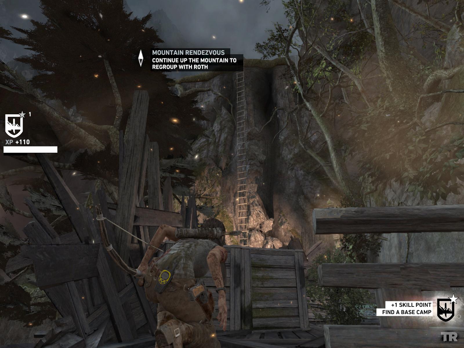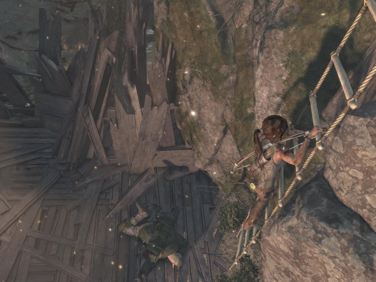 Juss fel az épület emeletére, itt relikviát is találsz, majd a tetőről sétálj ki a gerendán. Ess le a ketrecre, majd onnan a másik gerendára ugorj. Mássz fel a sziklán. Gyűjts be amit lehet, a kis szobor előtt is gyújtsd meg a tüzet, majd ismét felfelé kell haladnod a sziklákon. Elérsz egy fahídig. Rohanj, és ugorj, mert leszakad alattad. Épp hogy elkapod a szemközti sziklát. Gyorsan meg is kell nyomni a feladatgombot. Mássz fel, csússz le a kötélen,és ismét harc következik. Végezz ellenfeleiddel, szedj össze mindent, a zsákot is gyújtsd fel, majd csússz át a keskeny sziklarésen. Egy tábortűzhöz értél. Megpihenhetsz.