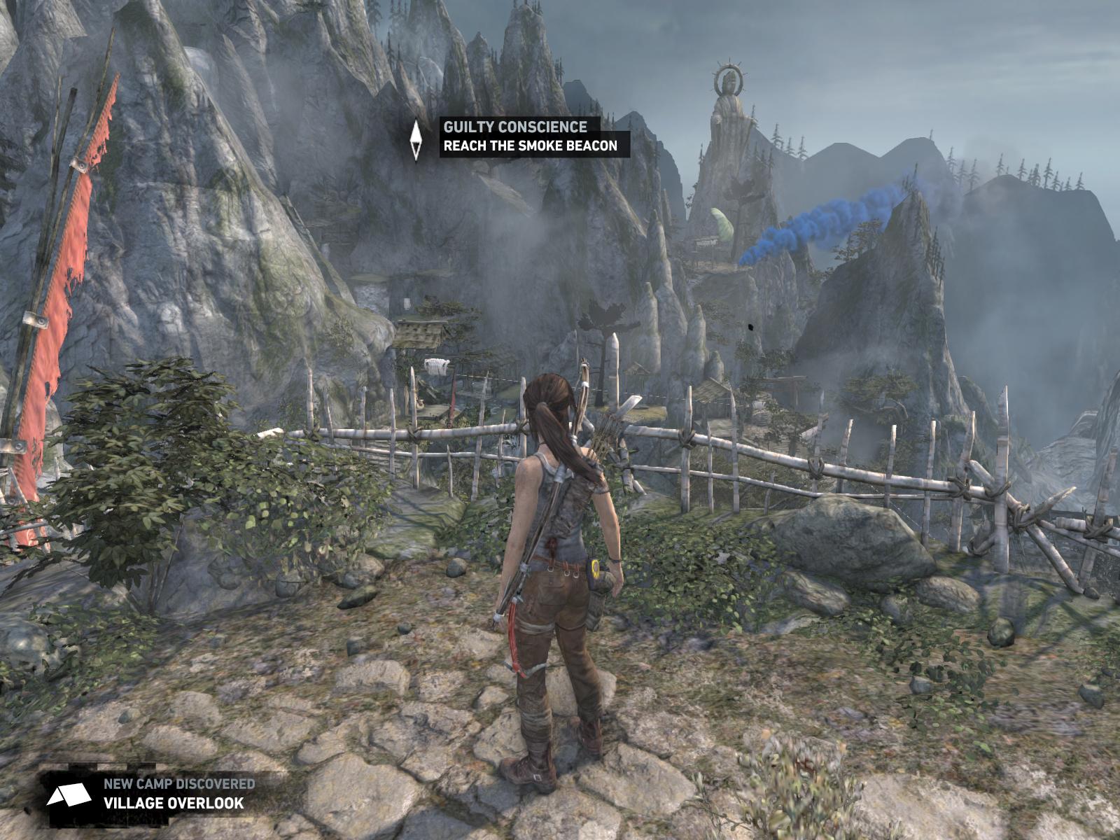 Lőj egy kötelet a lejjebb levő köteles oszlopba, és csússz le. Lődd le a fegyvereseket, és kutasd át a környéket. A házban relikviát is találsz. Menj tovább, fel a lépcsőn, és újabb kötéllövés következik. Nem írom le a kis kitérőket, lényeg, hogy nézz be mindenhova, a háztetőkre is, a kis buddha szobroknál gyújtsd meg a tüzet. Továbbmenve elérsz egy falhoz. Mássz fel rá, és végezz a két ipsével. A következő kis oszlopon menj be balra a szűk sziklafolyosóba, ami egy templomhoz vezet.