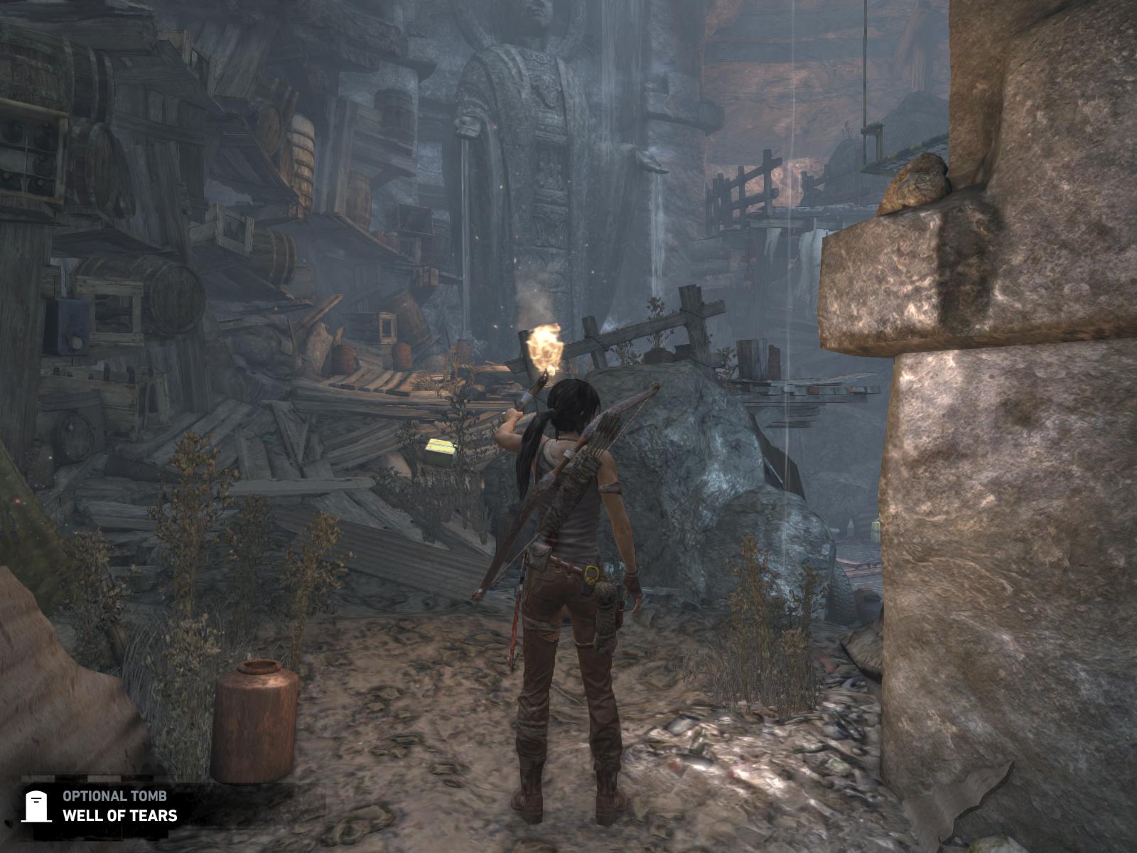 Köteles nyíllal rántsd fel balra a csapóajtót, és mássz le. Menj végig a járaton, és egy barlangba értél. Itt az a lényeg, hogy feljuss a felső folyosóra. Van egy lift, és van négy kanna. De csak három kell. Vedd fel őket, és célozva dobd a liftre, így három alatt az lesüllyed. Menj le, fogd meg az egyik kannát, és fuss le a liftről. Dobd el útközben a kannát, és fuss fel. Futás, ugrás a liftre, elkapod, felmászol, majd balra fordulva futás, ugrás, és elkapod a felső folyosót. Meg is van a sír kincse, amiért jöttél. Lefelé egy kötélen is lecsúszhatsz. Menj vissza a bádogvárosba.
