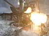 Csússz át oda, és mássz ki a ládák közül. Három ellenséged lesz mindössze, de az egyik, a nagy behemót kemény ellenfél. Viszont lassú. Nyírd ki először a másik kettőt, majd állj neki a behemótnak. Lőj bele párat, amíg nem védi magát, majd amikor megjelenik a jel, de csak akkor, és pont akkor nyomd meg egy pillanatra a Melee gombot, és csáklyázd meg a lábát, majd a fejét. Ne siesd el. Nem kell nyomkodni a gombot, csak abban a pillanatban, és csak egyszer kell megnyomni, amikor azt jelzi a játék. Szóval nem olyan nehéz, ne aggódj. :)