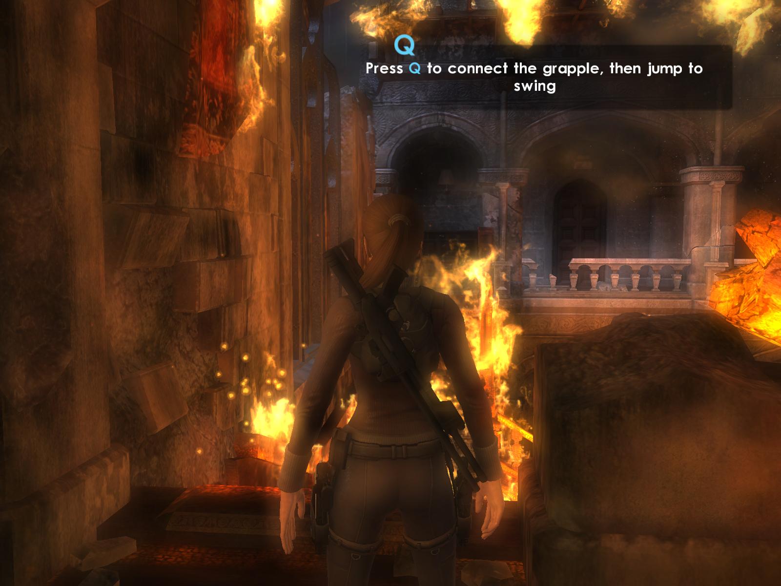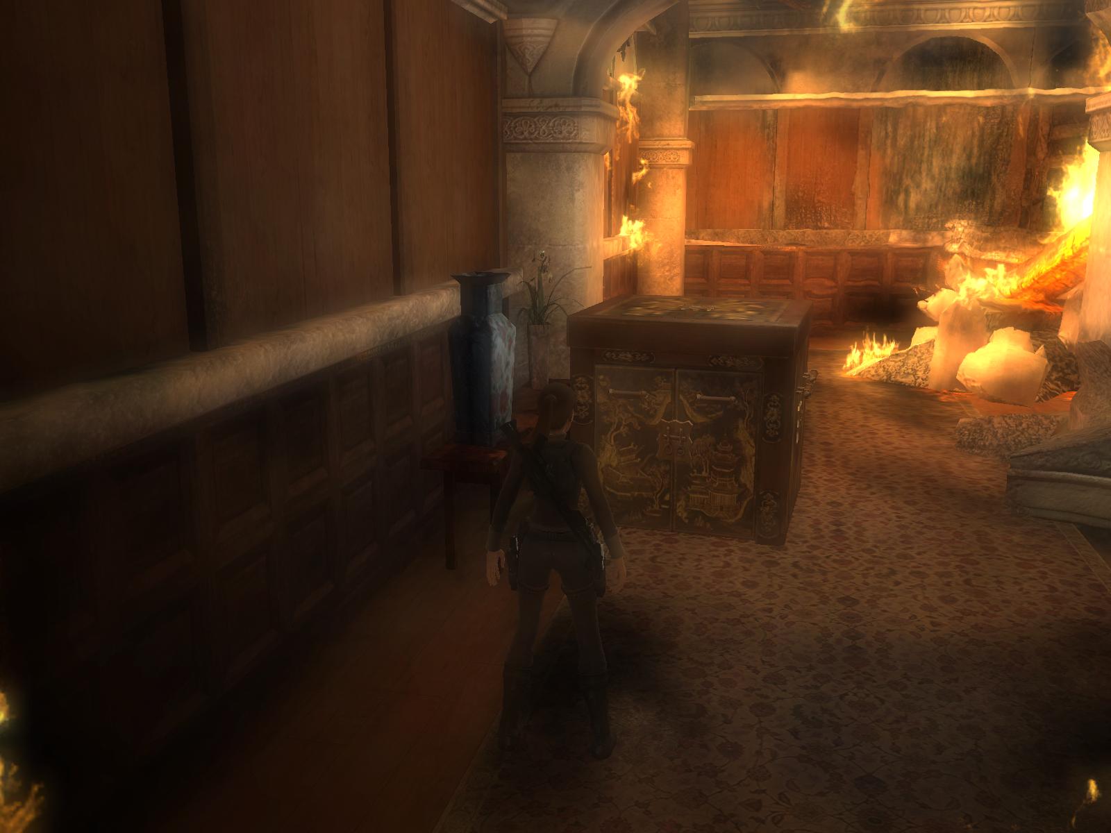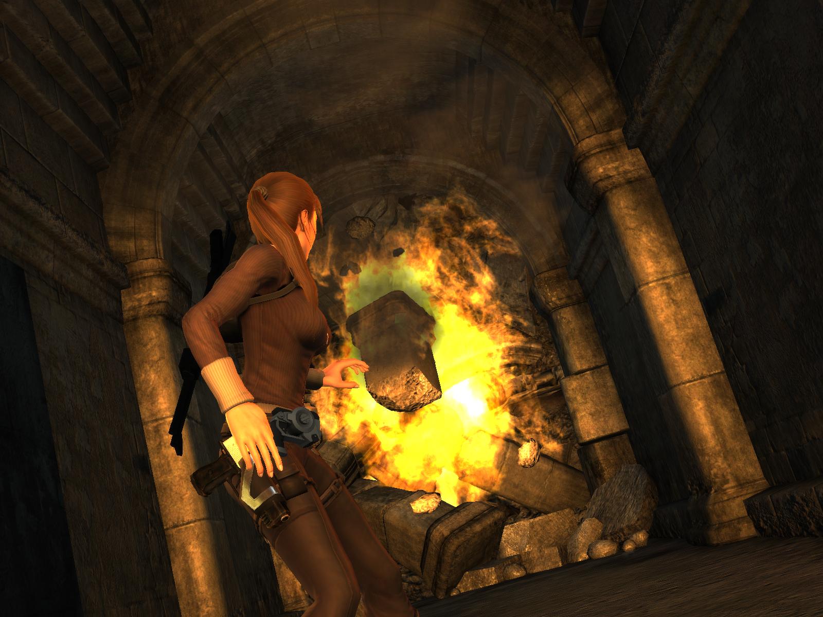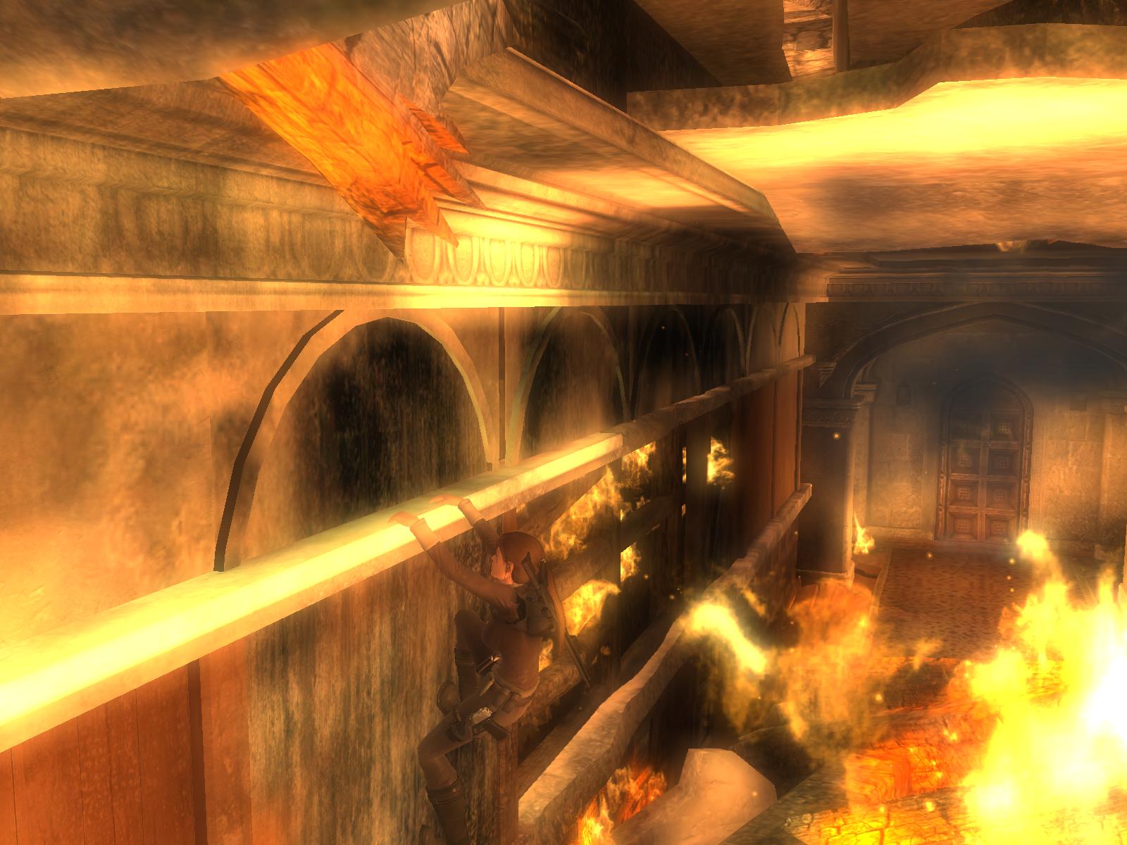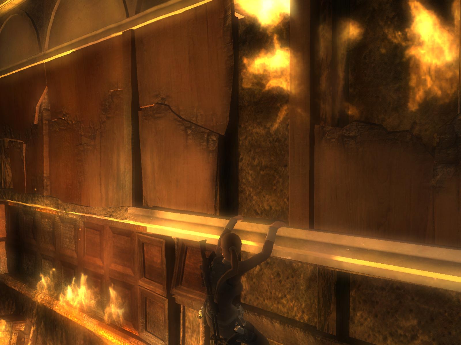 A robbanás után Larának ki kell menekülnie a kastélyból. Irány hát végig a folyosón, fel a lépcsõkön, és a kapcsoló meghúzásával egy újabb felrobbant terembe értél. Menj jobbra, a bukfencelj át az égõ romhalmaz alatt, és mássz fel a leszakadt tetõdarabra. Menj ki a szélére, és csáklyázd meg az ajtót. A feladatgokmbot nyomva magad felé húzod, így megnyílik az út a következõ folyosóra.