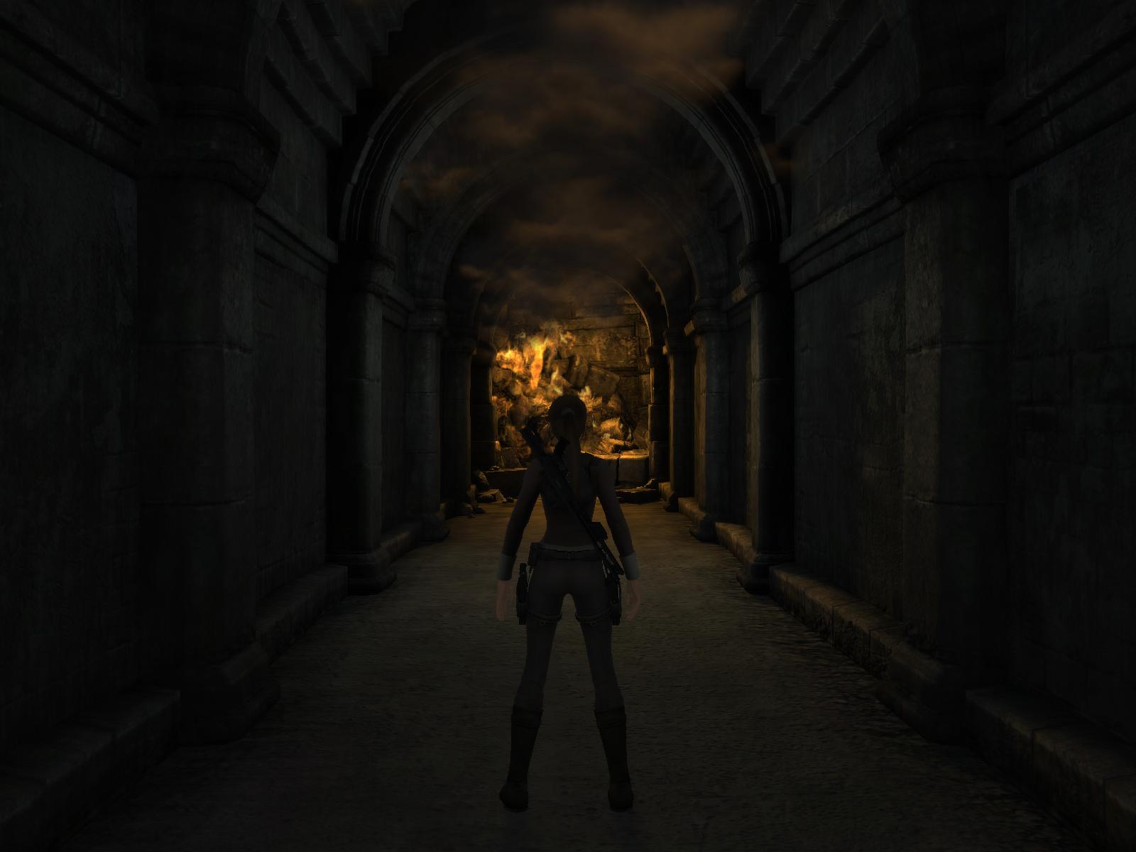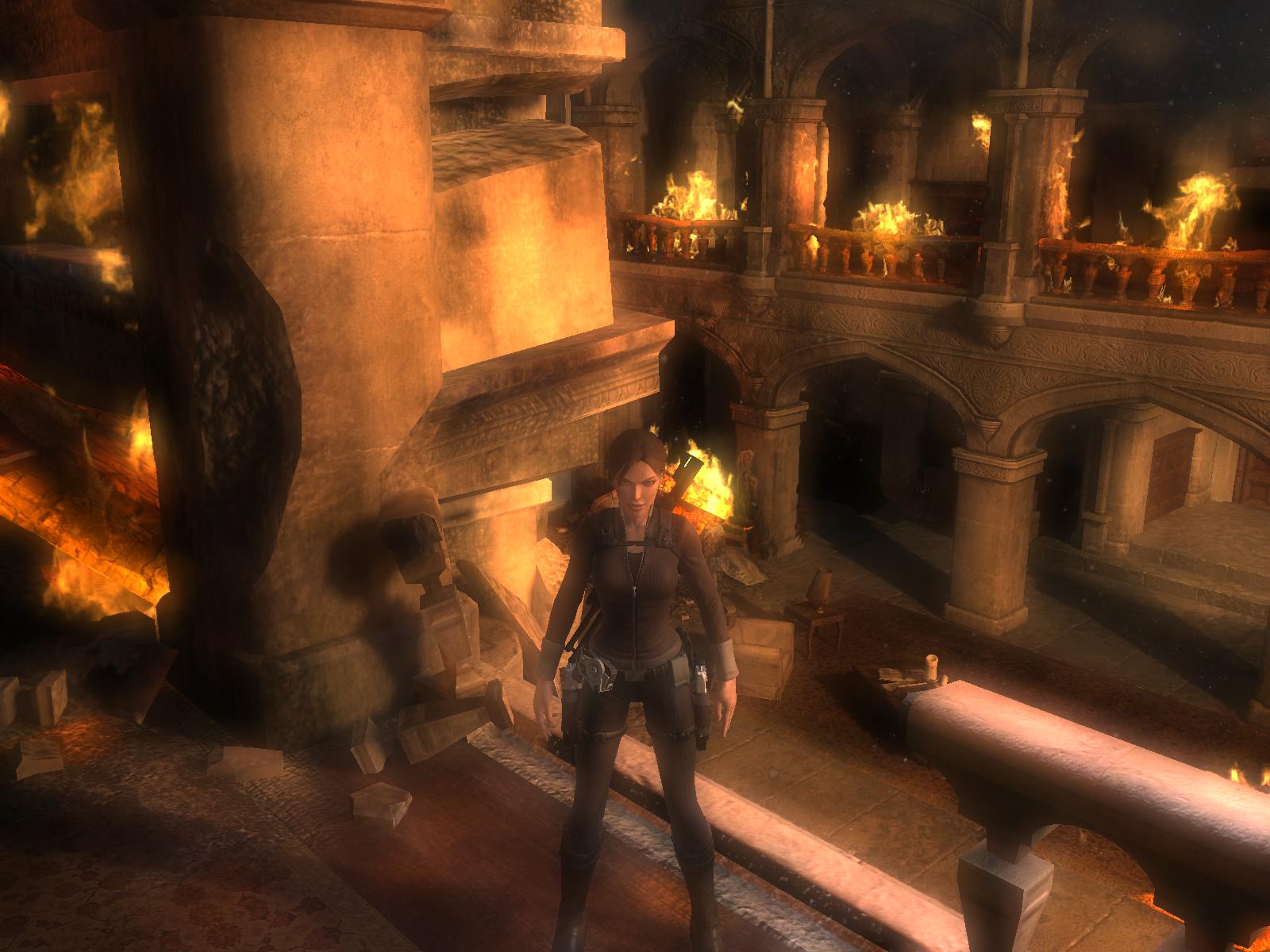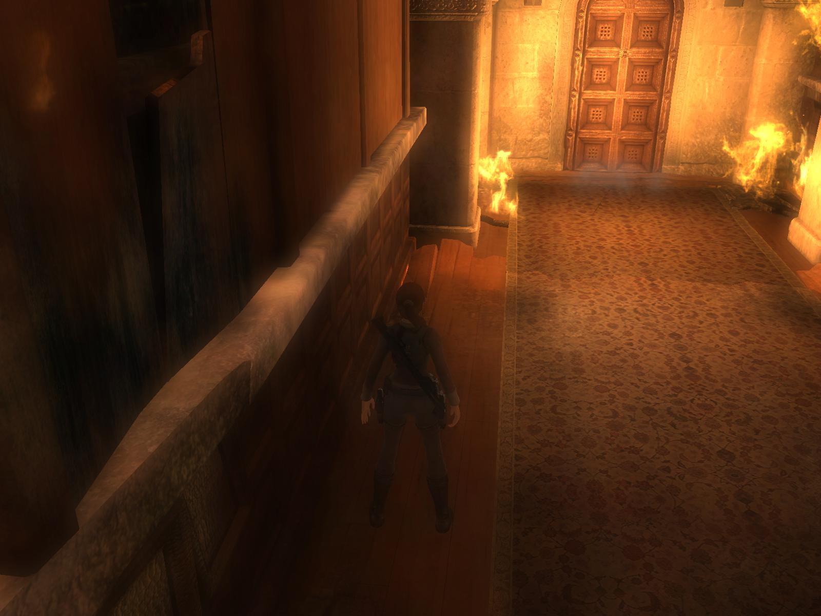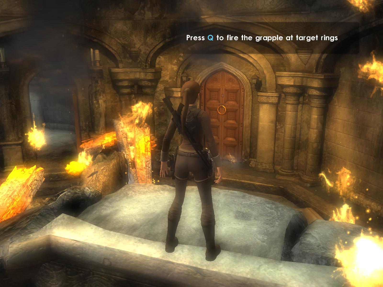 A robbanás után Larának ki kell menekülnie a kastélyból. Irány hát végig a folyosón, fel a lépcsõkön, és a kapcsoló meghúzásával egy újabb felrobbant terembe értél. Menj jobbra, a bukfencelj át az égõ romhalmaz alatt, és mássz fel a leszakadt tetõdarabra. Menj ki a szélére, és csáklyázd meg az ajtót. A feladatgokmbot nyomva magad felé húzod, így megnyílik az út a következõ folyosóra.