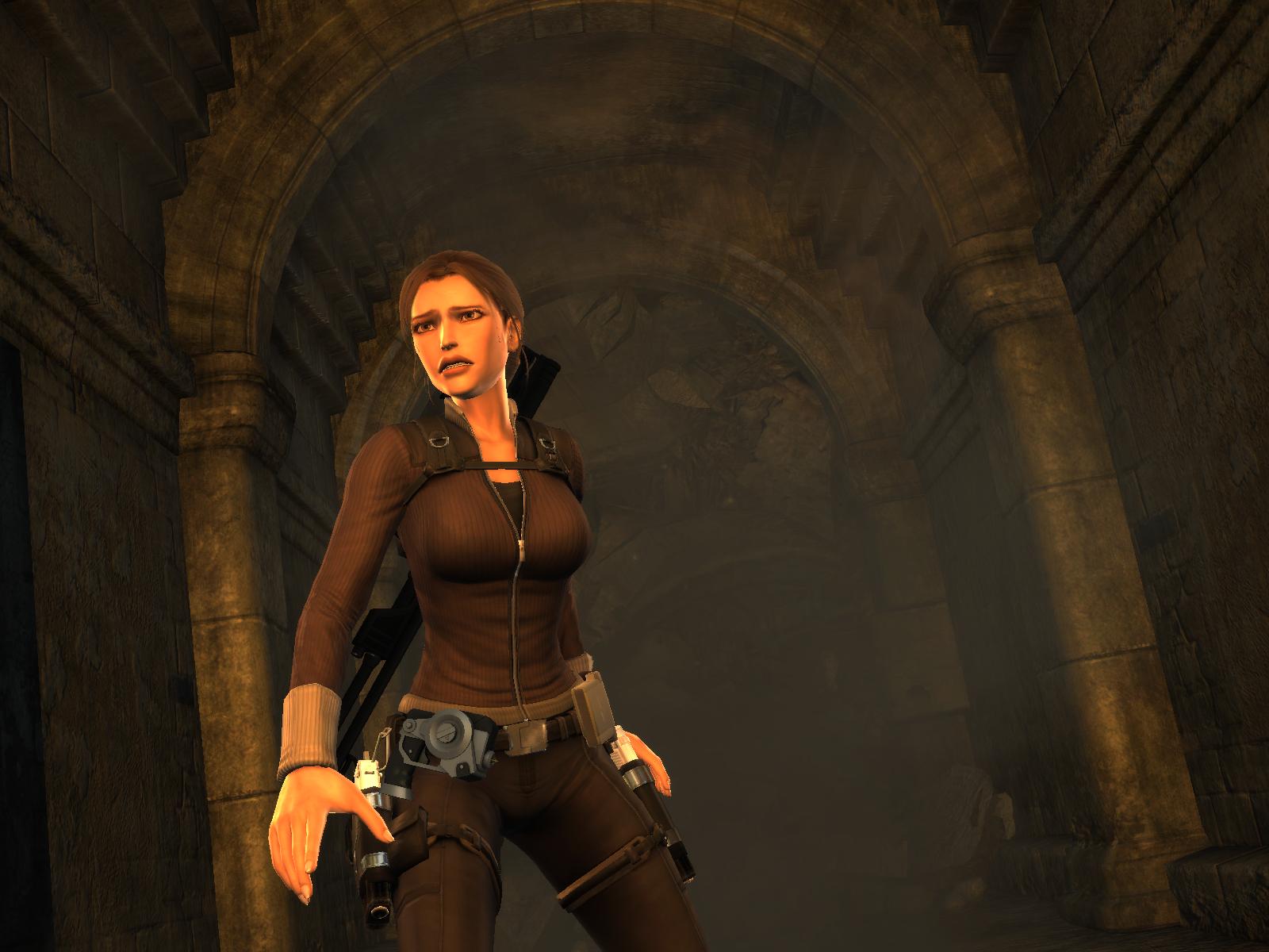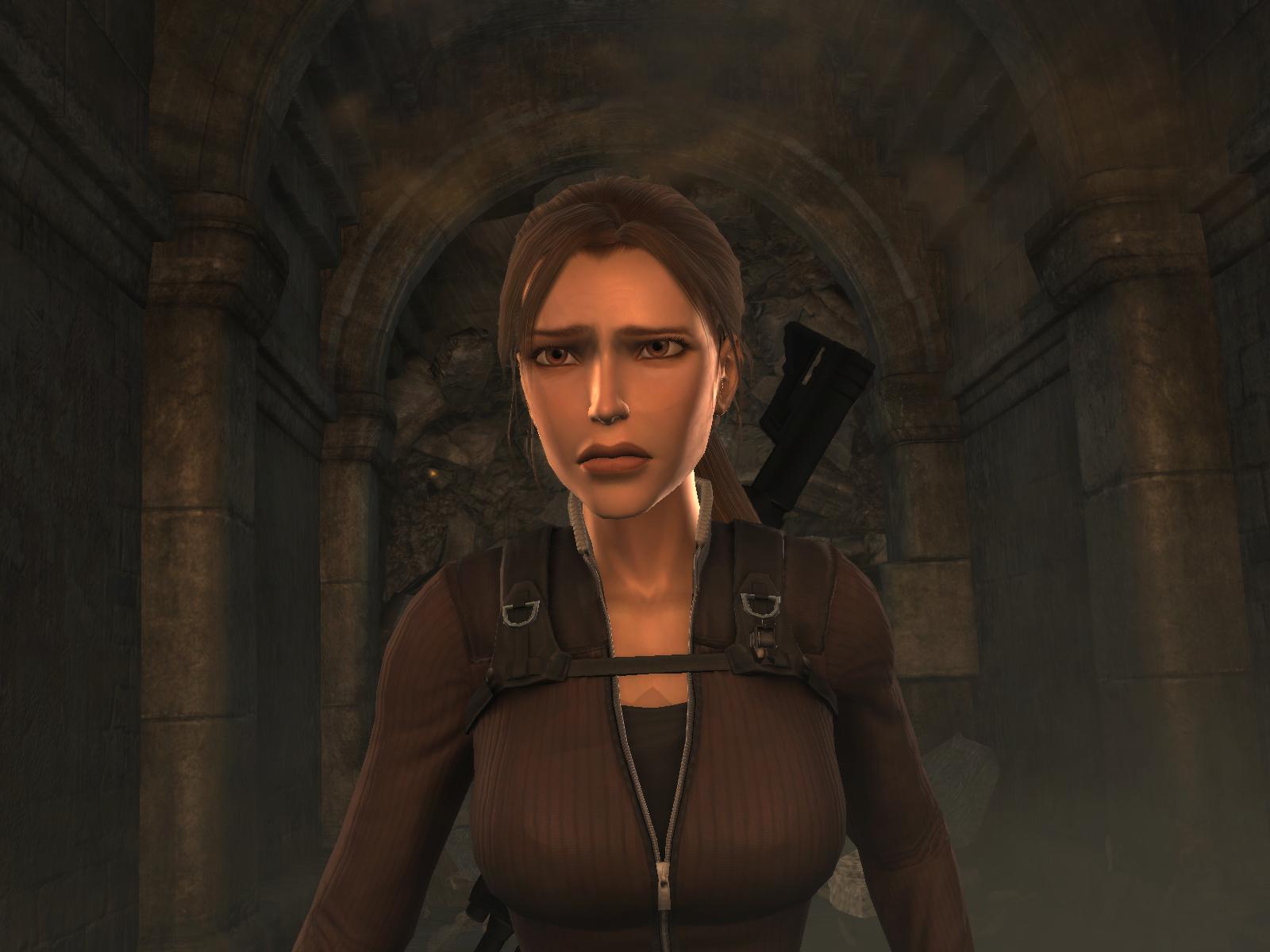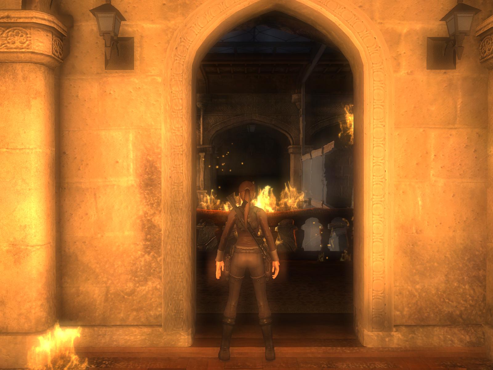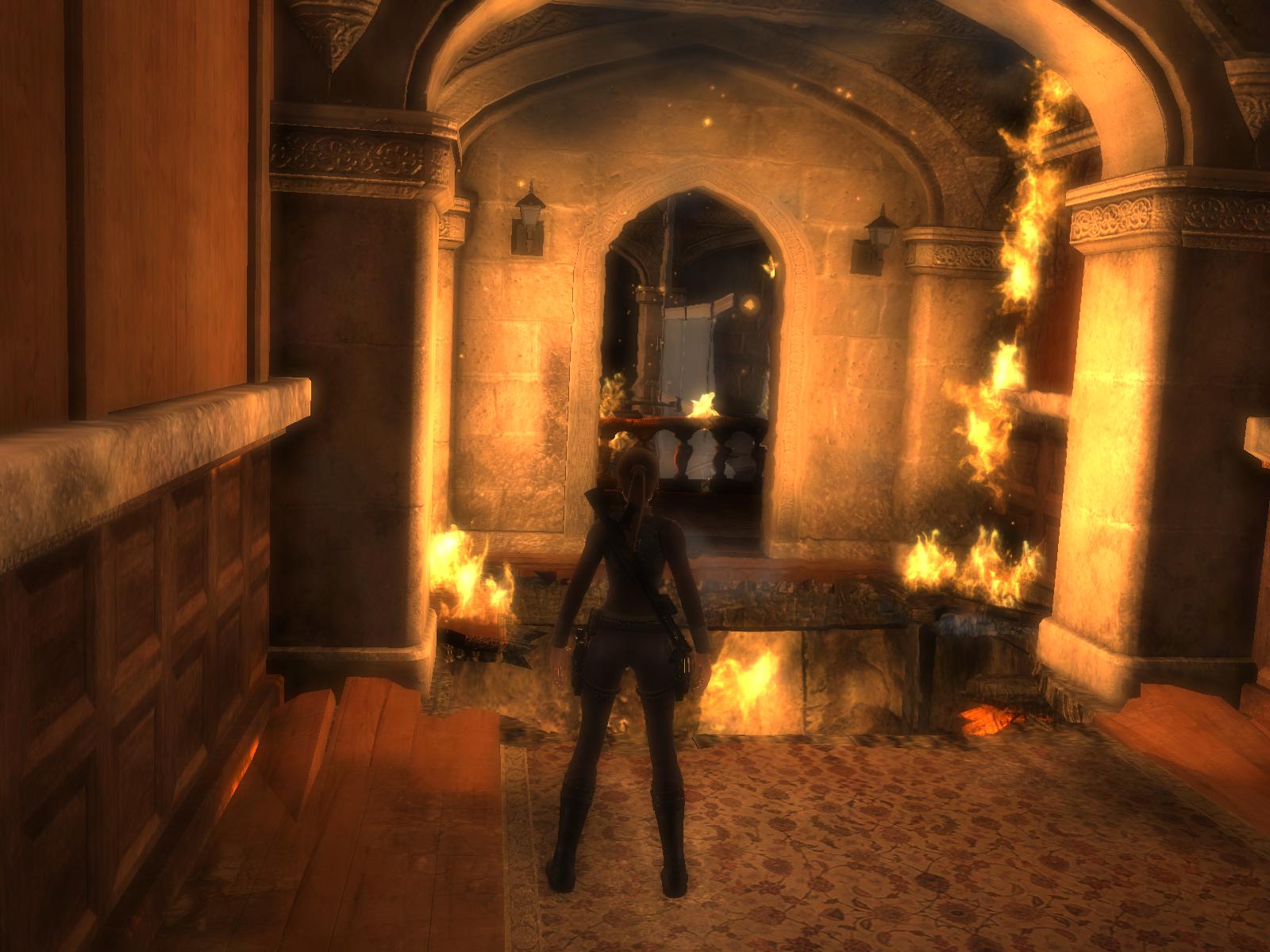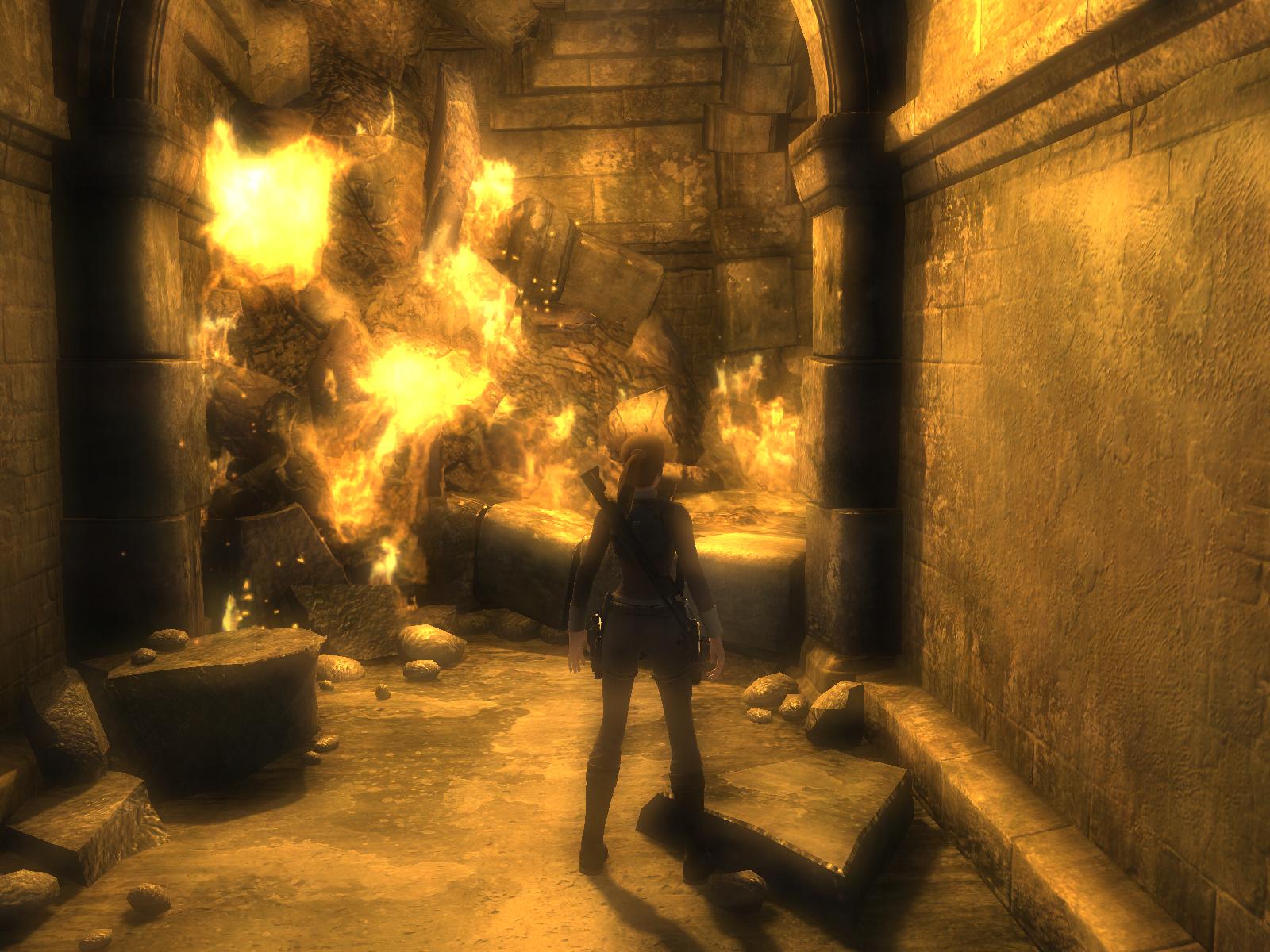 A robbanás után Larának ki kell menekülnie a kastélyból. Irány hát végig a folyosón, fel a lépcsõkön, és a kapcsoló meghúzásával egy újabb felrobbant terembe értél. Menj jobbra, a bukfencelj át az égõ romhalmaz alatt, és mássz fel a leszakadt tetõdarabra. Menj ki a szélére, és csáklyázd meg az ajtót. A feladatgokmbot nyomva magad felé húzod, így megnyílik az út a következõ folyosóra.